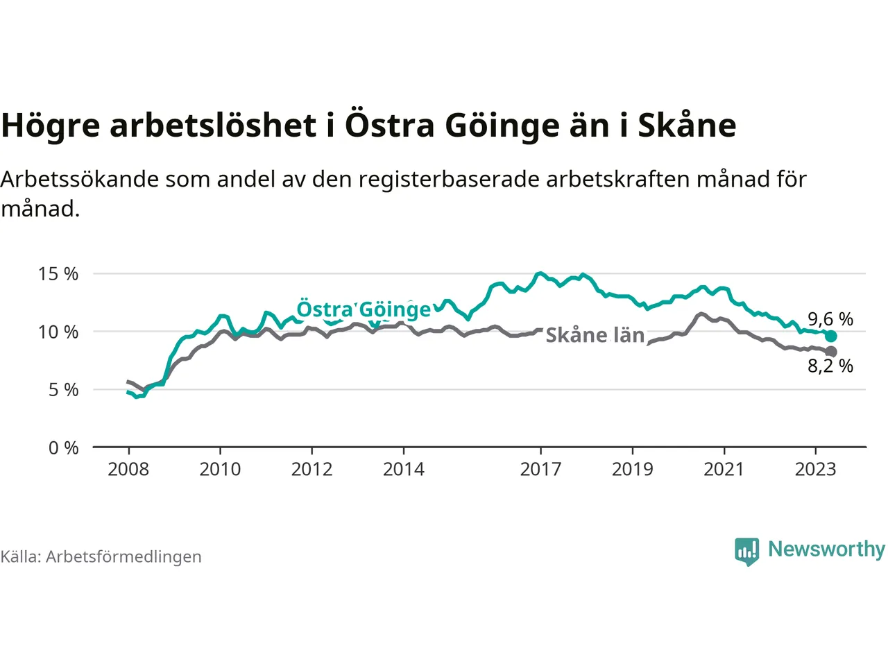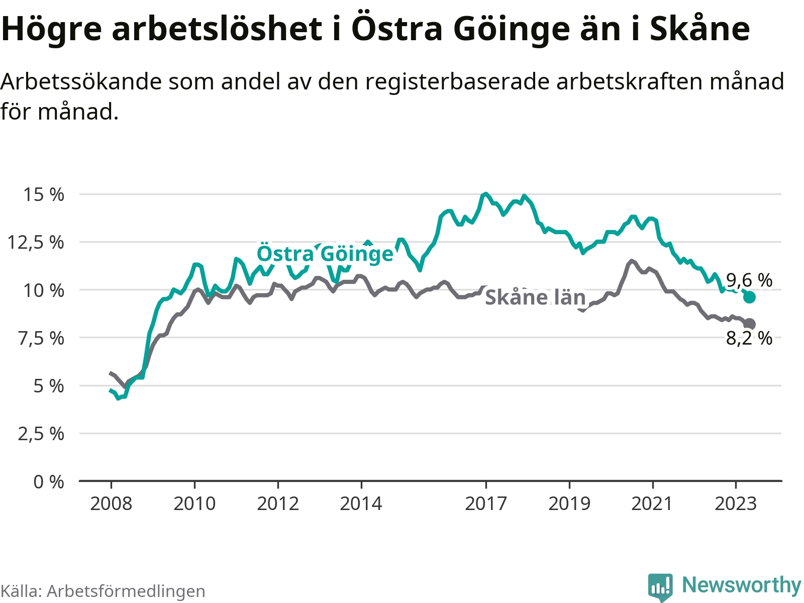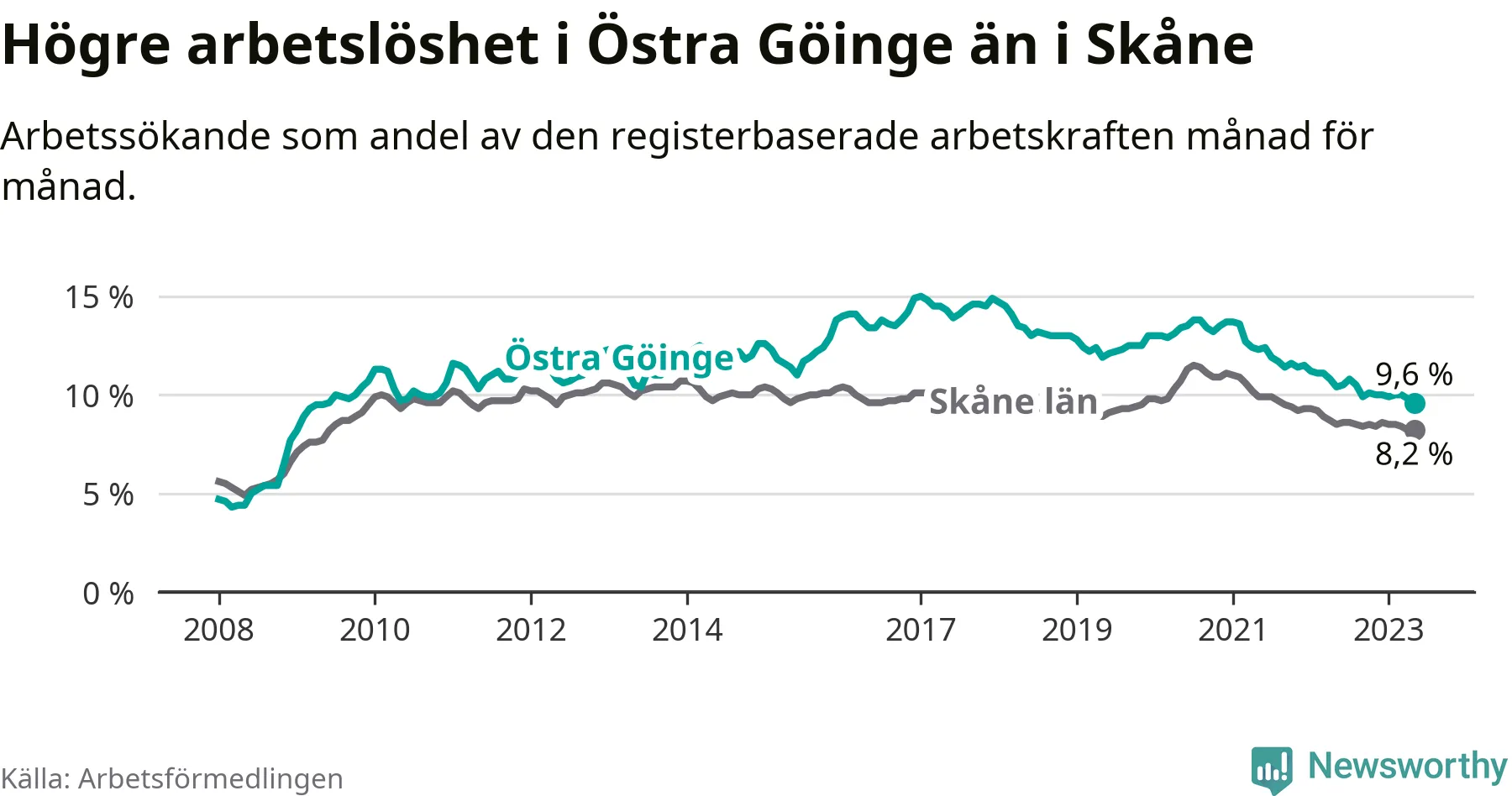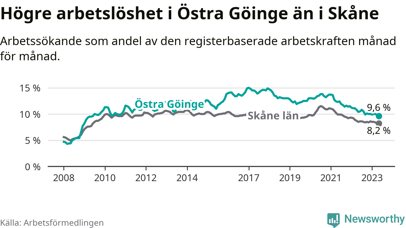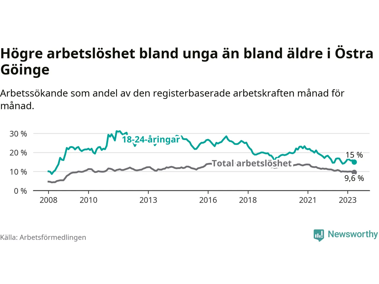 Precis som den totala arbetslösheten ligger ungdomsarbetslösheten i Östra Göinge högre än i Skåne som helhet. Skillnaden mellan kommunen och länet är 5,9 procentenheter.