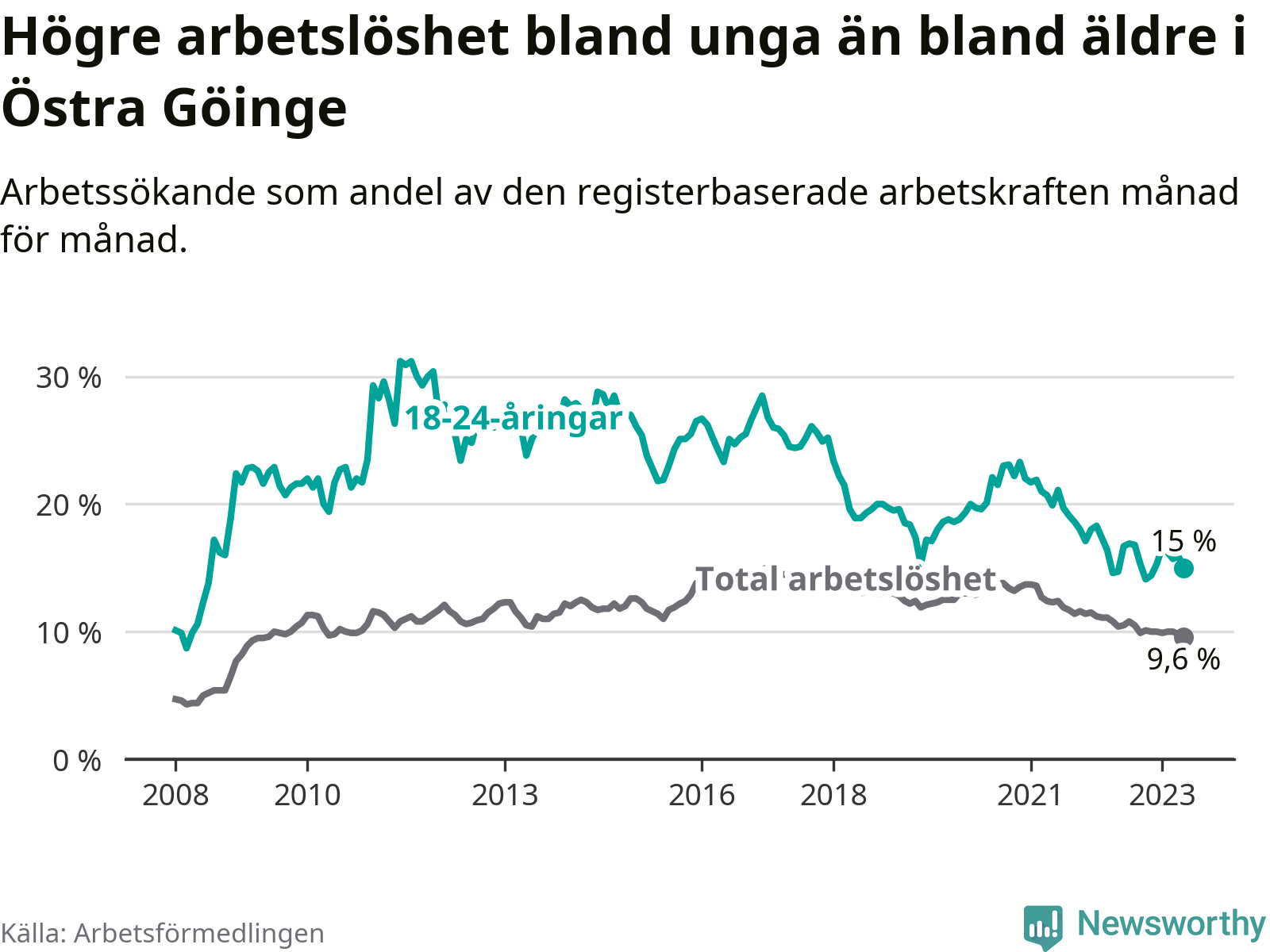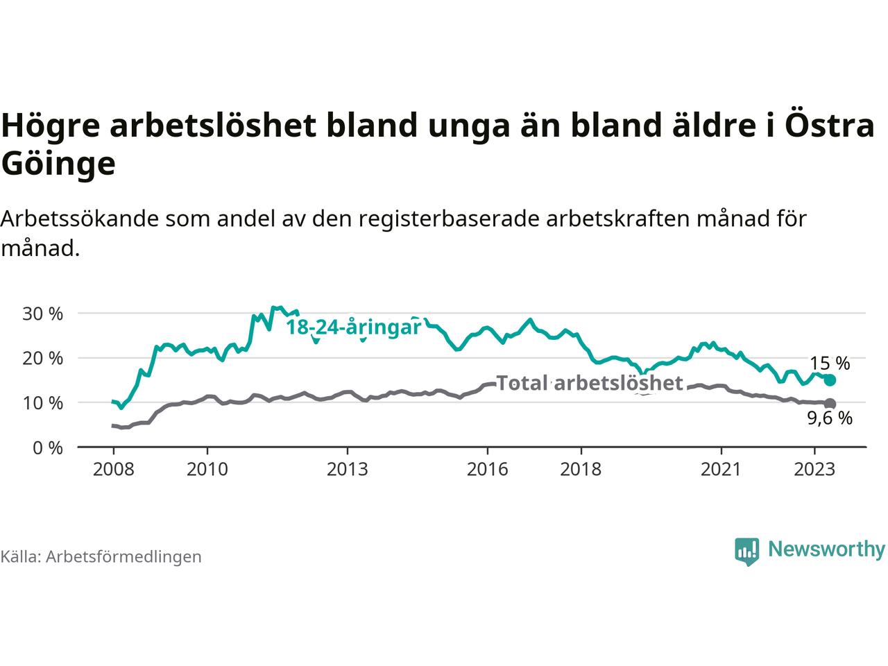 Till skillnad från den totala arbetslösheten stiger arbetslösheten bland unga (+0,3 procentenheter). I maj var 15,0 procent av 18–24-åringarna inskrivna som arbetssökande (motsvarande 89 personer). Mäter vi antalet inskrivna ser vi en ökning med ett personer på ett års sikt.