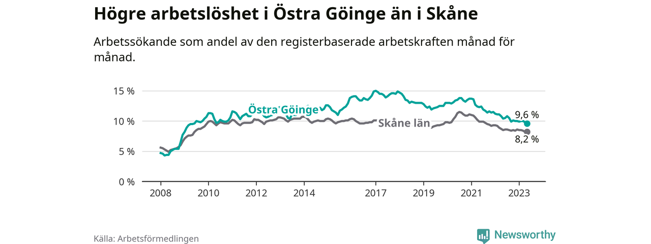 Det är 27:e månaden i följd som arbetslösheten i Östra Göinge är lägre än den var under samma tidpunkt året innan. Sedan februari 2021 har arbetslösheten gått ner från 13,6 till 9,6 procent. Den nuvarande arbetslöshetsnivån är därmed den lägsta sedan juni 2009.