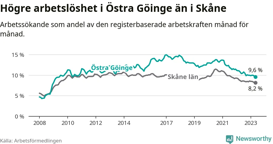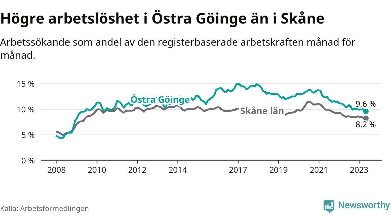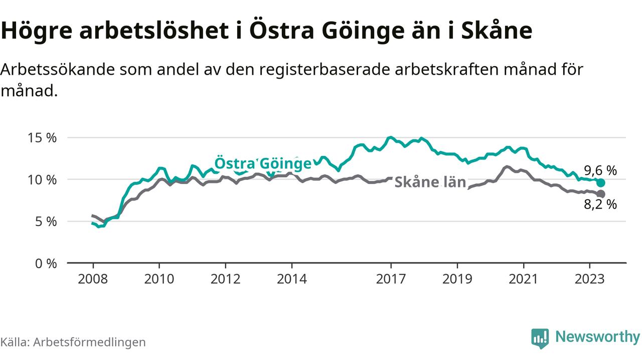 Under maj månad rapporterade Östra Göinge kommun en total arbetslöshet på 9,6 procent. Det är en minskning jämfört med samma tidpunkt i fjol (−0,8 procentenheter). Även i Skåne län sjunker arbetslösheten .