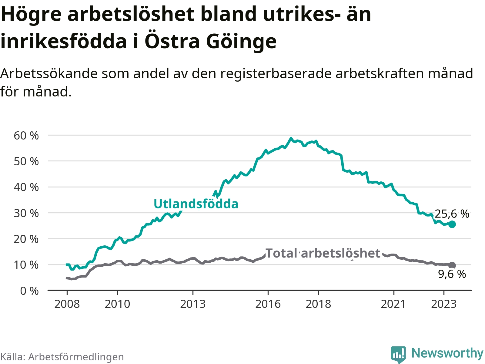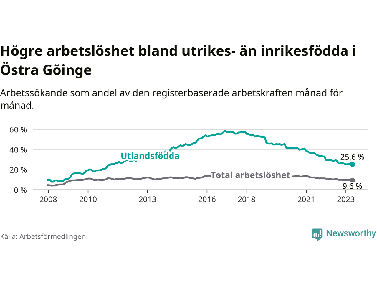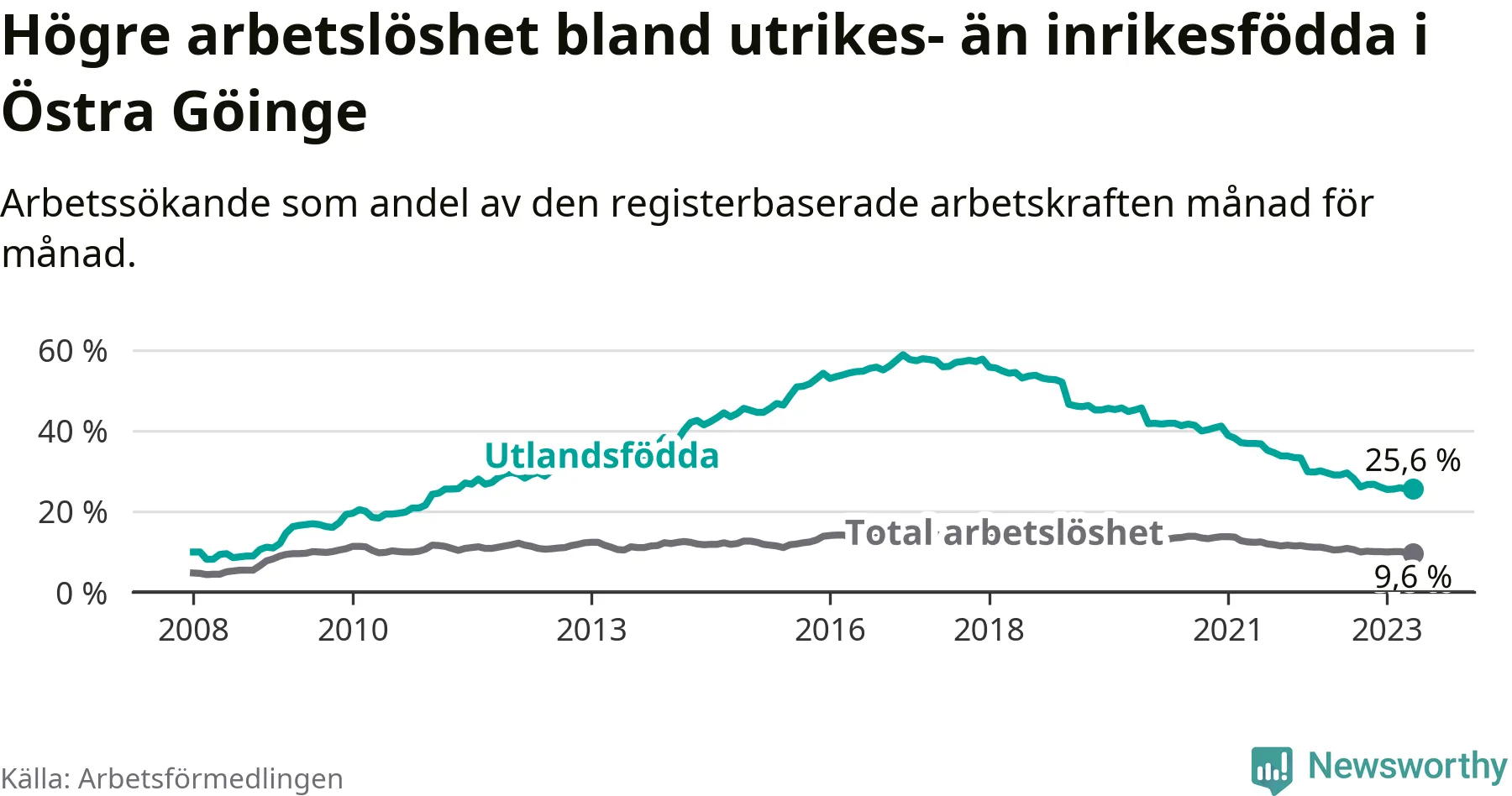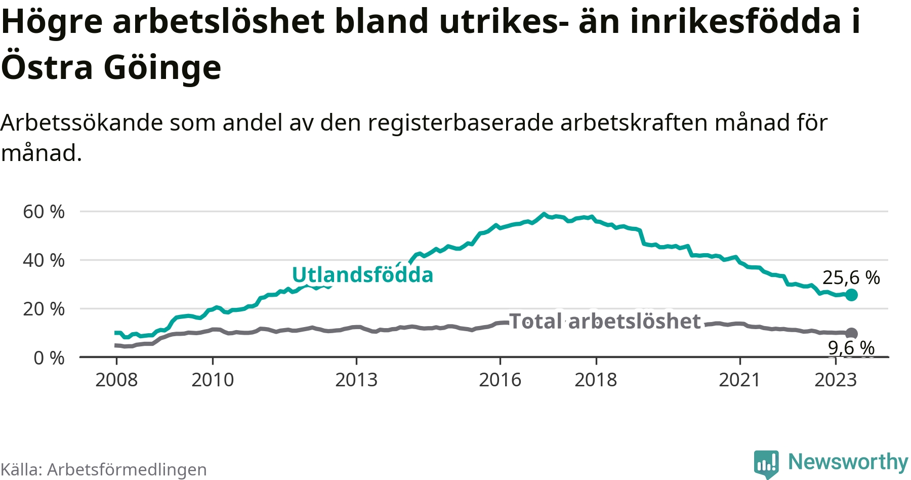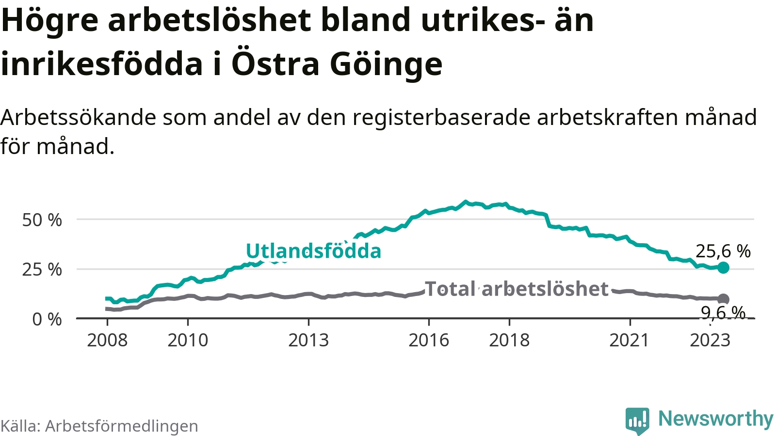 | Bland utlandsfödda | 25,6 % | −3,4 % ▼ | 18,4 % | −1,5 % ▼ | 15,1 % | −1,5 % ▼ |