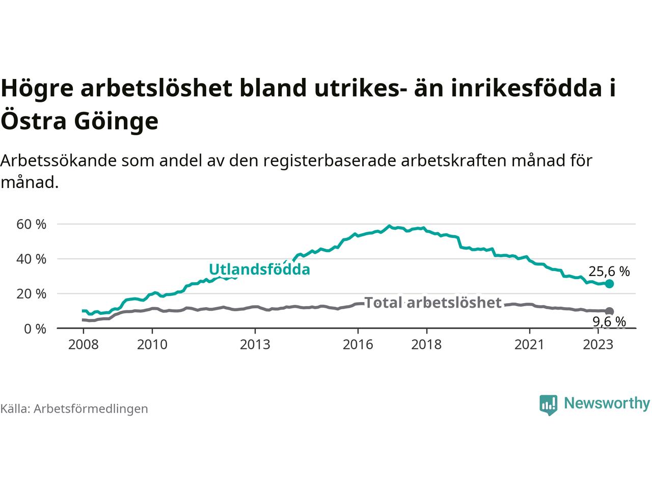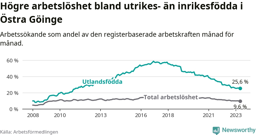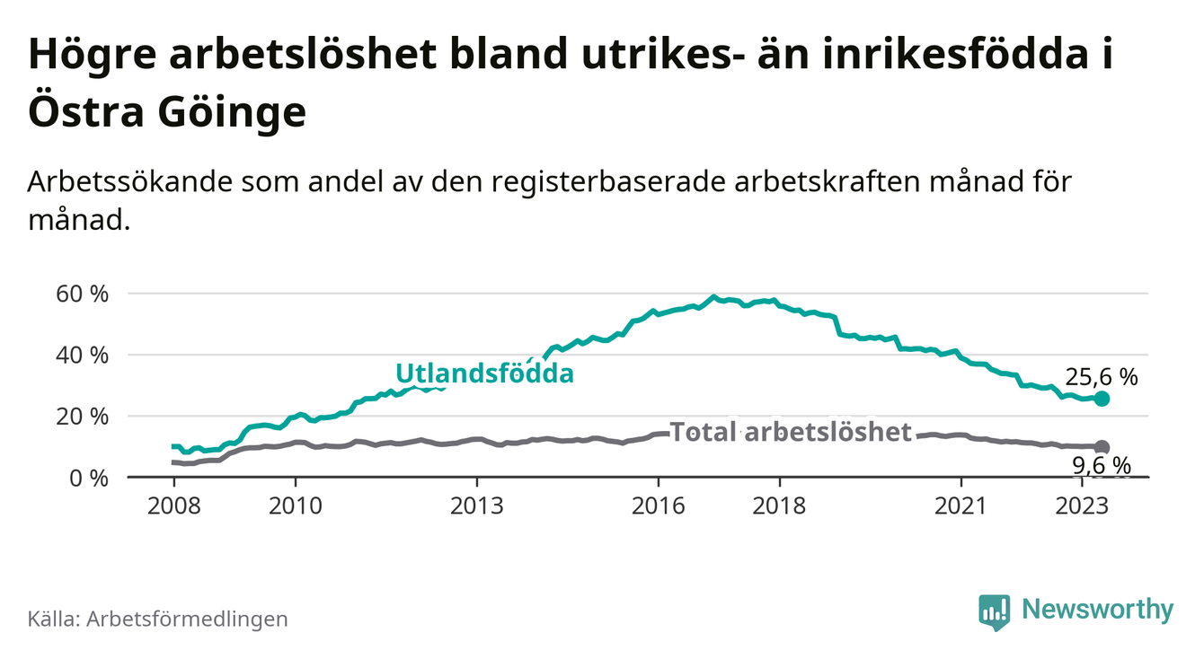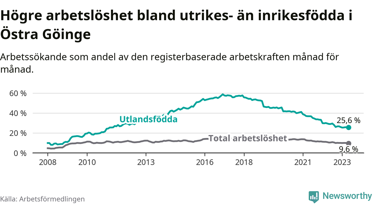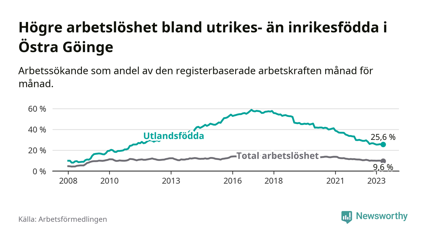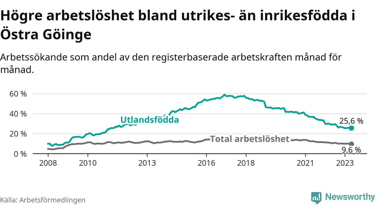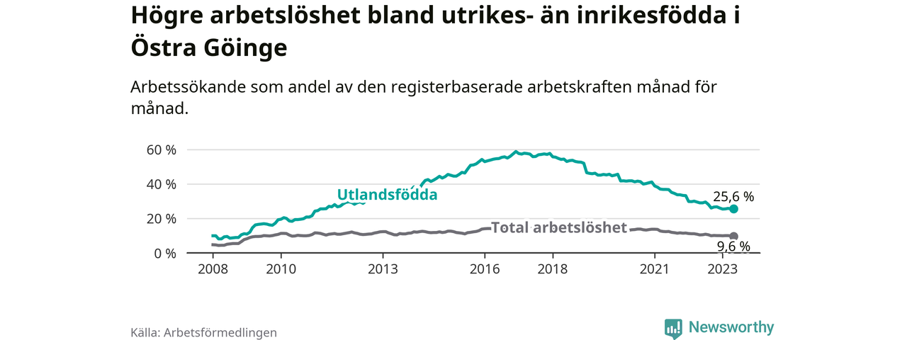 Arbetslösheten bland utlandsfödda var 25,6 procent i Östra Göinge under maj månad, motsvarande 362 av 1 414 personer. Det är 3,4 procentenheter färre än vid samma tidpunkt i fjol (−50 om man räknar personer). Därmed har de utlandsföddas arbetslöshet varit lägre än vid samma tidpunkt i fjol i över fem år i sträck. Sedan oktober 2017 har arbetslösheten bland utlandsfödda minskat från 57,4 till 25,6 procent.