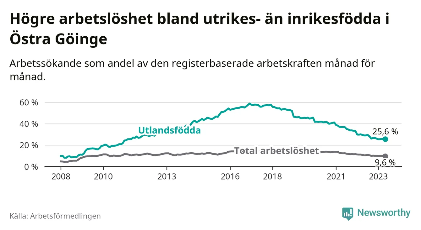 Skillnaden i arbetslöshet mellan utrikesfödda och hela befolkningen är 16,0 procentenheter i Östra Göinge. Det är en betydligt mindre skillnad än för ett år sedan (−2,6 procentenheter).