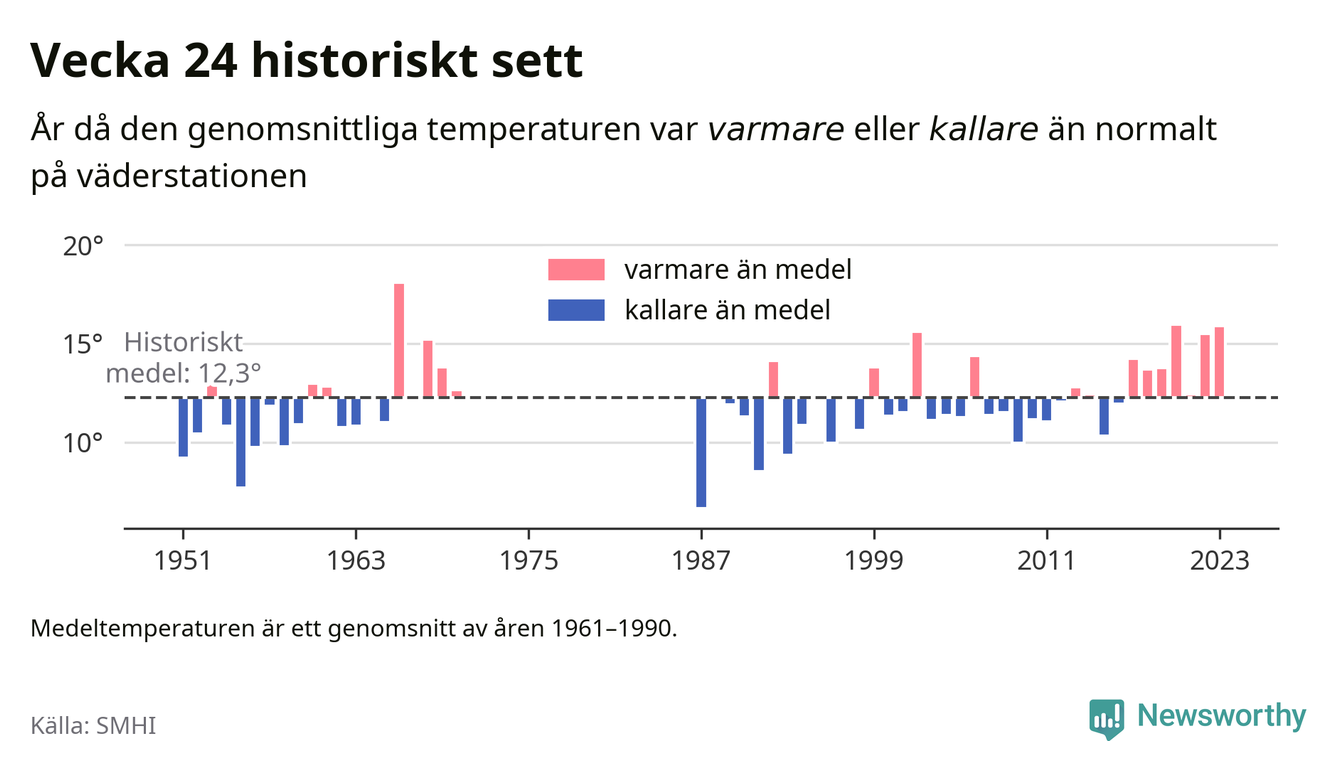 Under vecka 24 uppmättes en medeltemperatur på 15,9 grader vid mätstationen Brämö. Det är betydligt varmare än normalt. Det historiska snittet ligger på 12,3 grader. Samtliga veckans dagar var varmare än normalt.