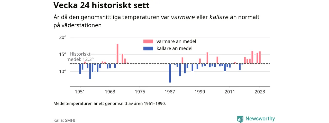 Förra veckan var ovanligt varm vid mätstationen Brämö. Bara två gånger tidigare har vecka 24 haft högre medeltemperatur sedan år 1951.