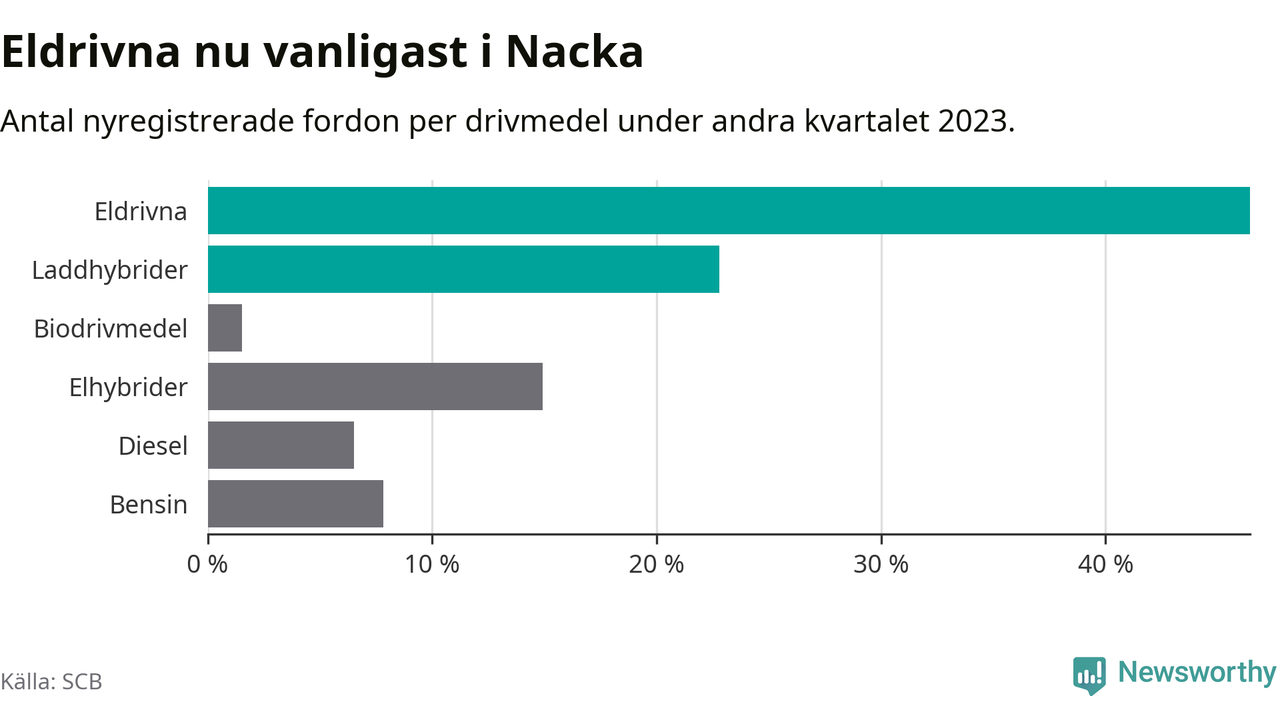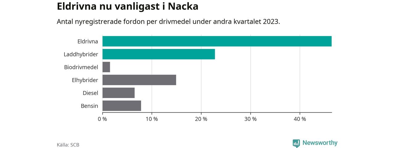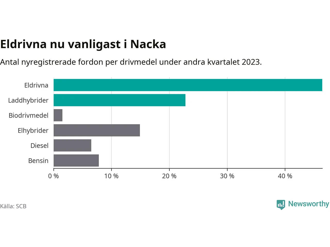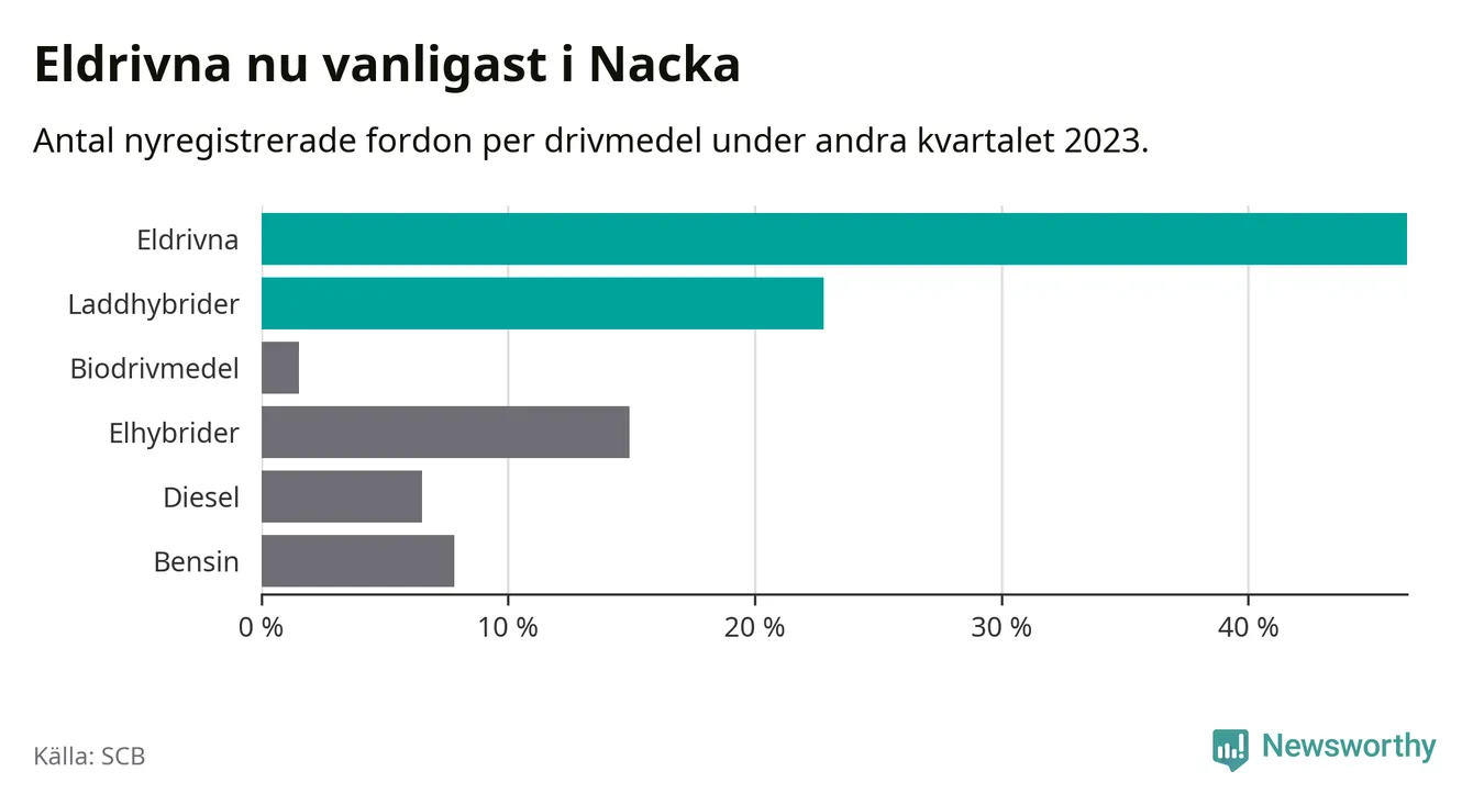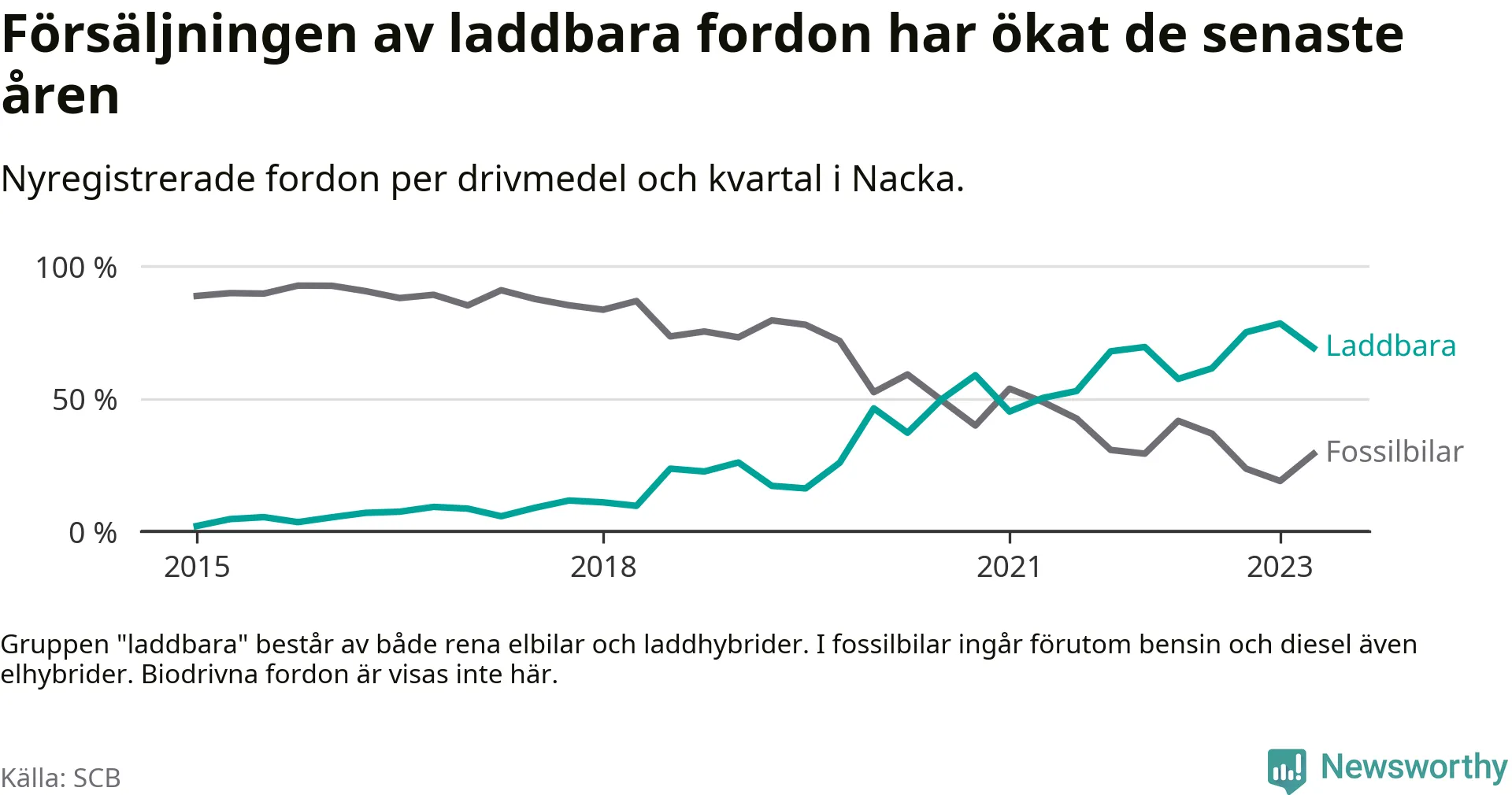 Under andra kvartalet 2023 var 69 procent av alla nyregistrerade personbilar i Nacka laddbara (sammanlagt registrerades 2 031 nya bilar). Merparten av de laddbara bilarna var rena elbilar (46 procent av alla).