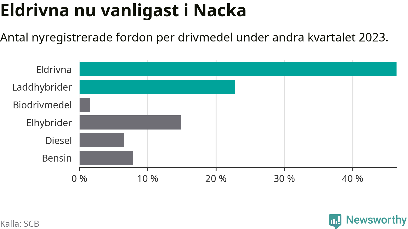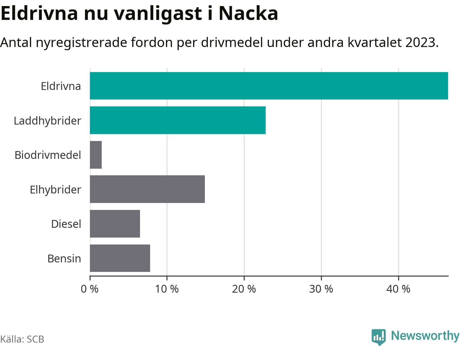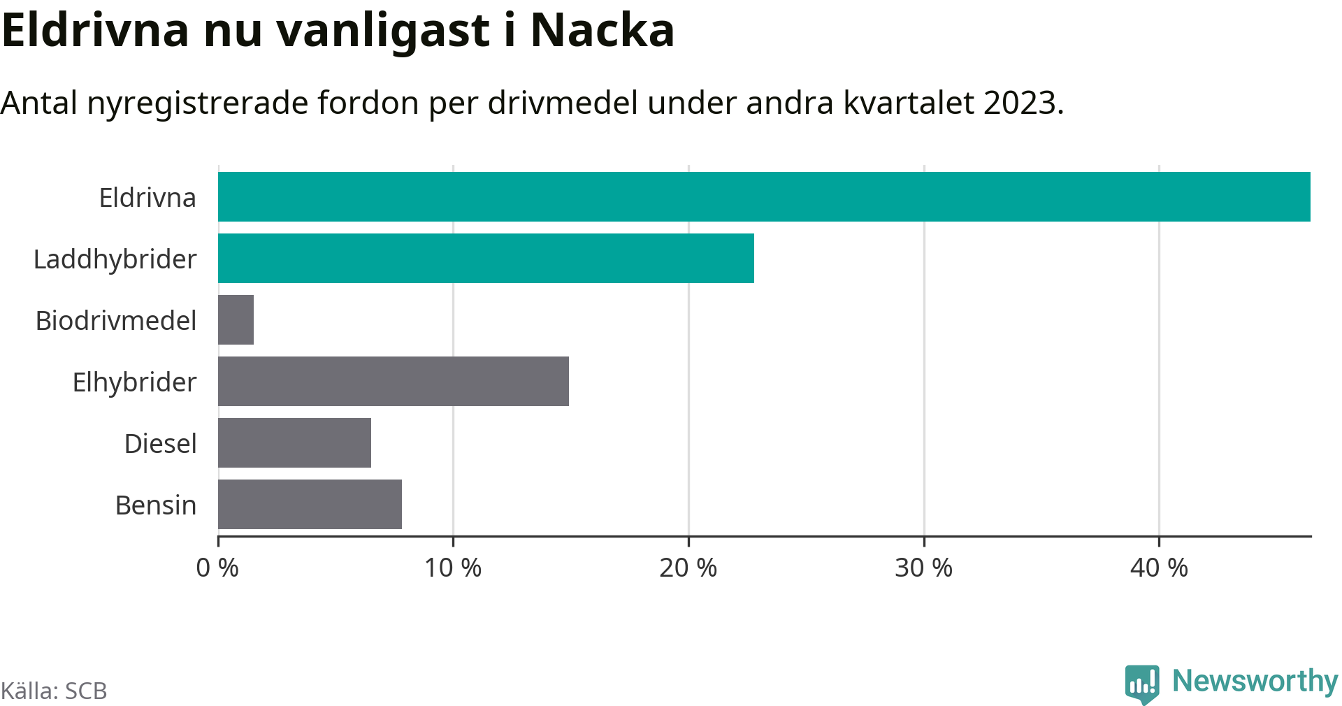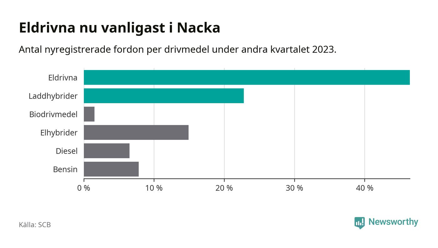Under andra kvartalet 2023 var 69 procent av alla nyregistrerade personbilar i Nacka laddbara (sammanlagt registrerades 2 031 nya bilar). Merparten av de laddbara bilarna var rena elbilar (46 procent av alla).