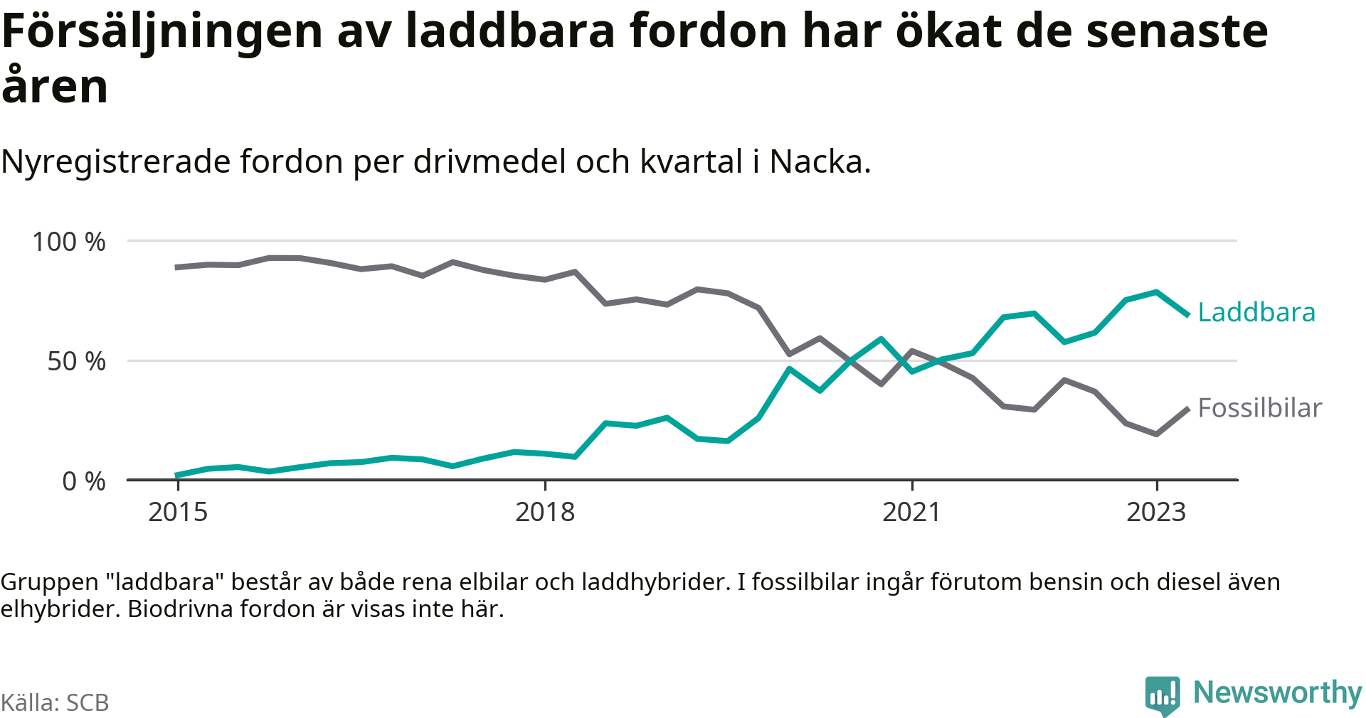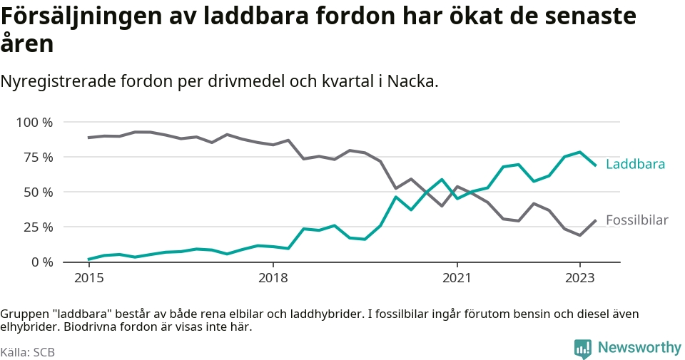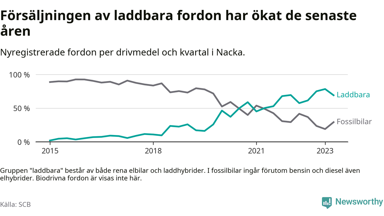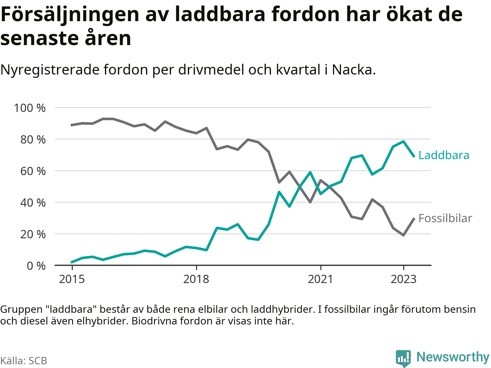 I Nacka var andelen laddbara bilar under andra kvartalet också lägre än under första kvartalet 2023 då rekordet hittills noterades (78 procent).