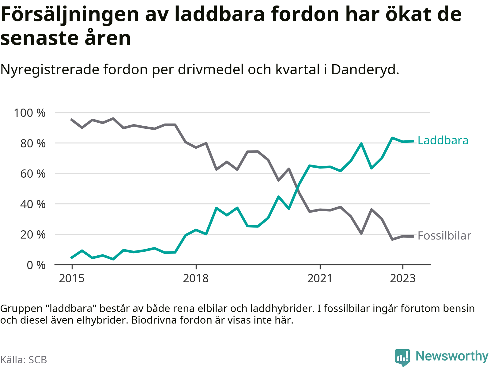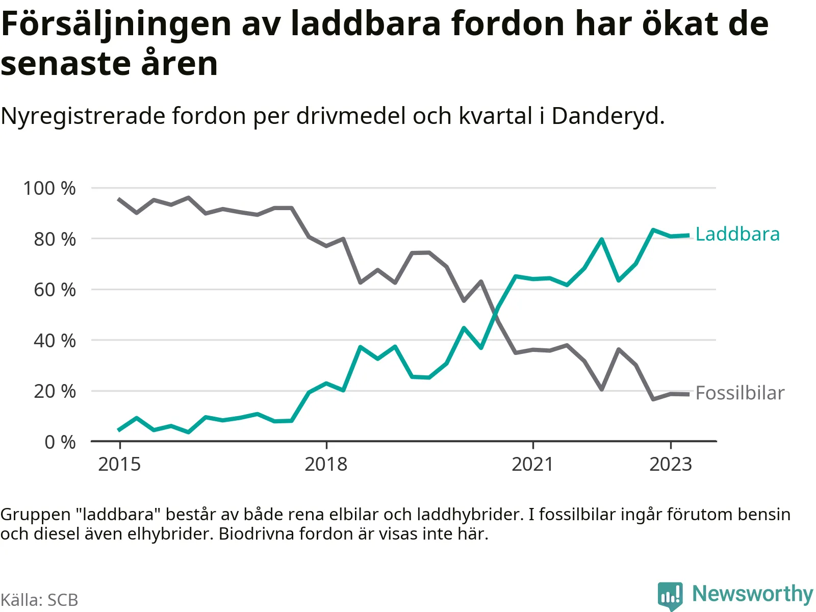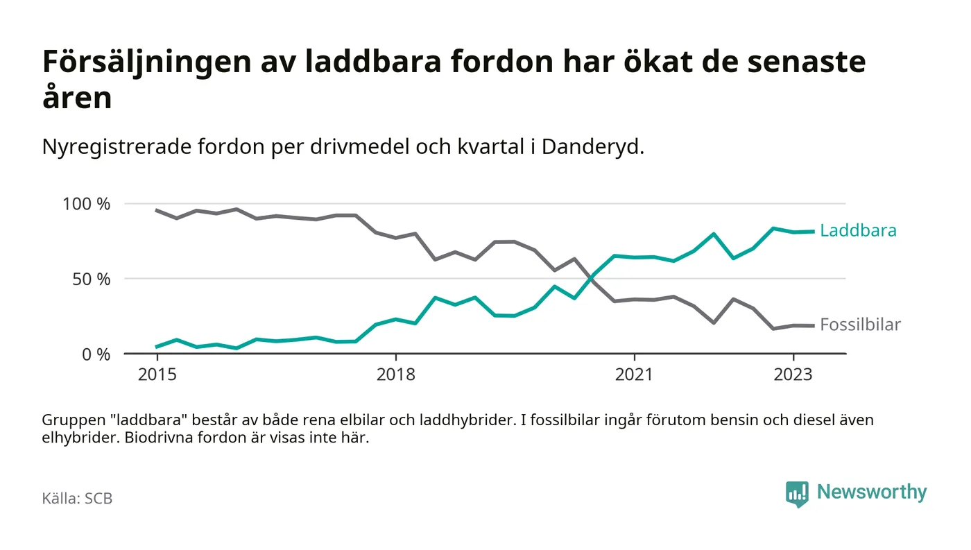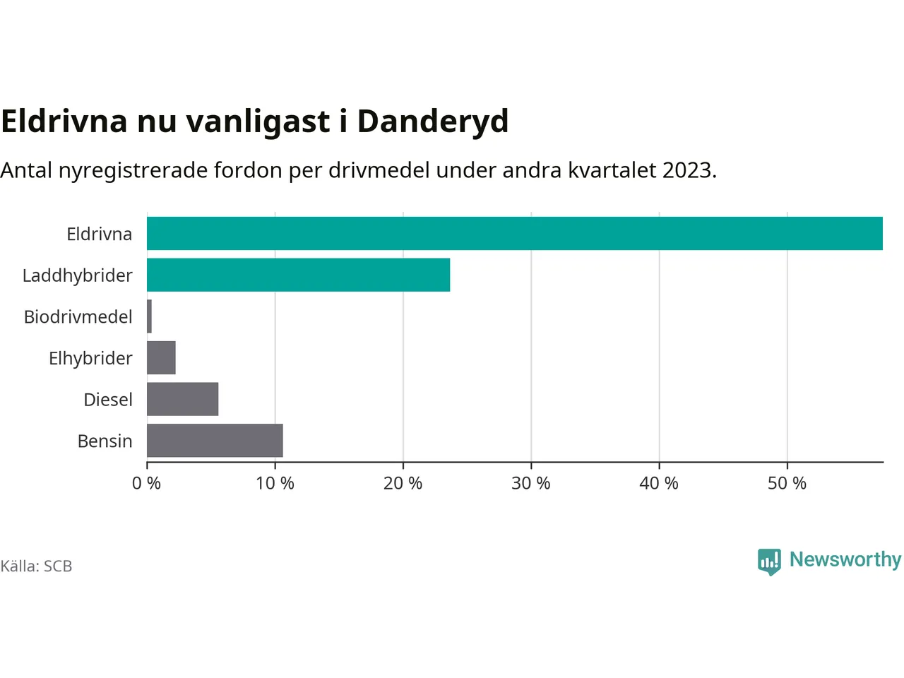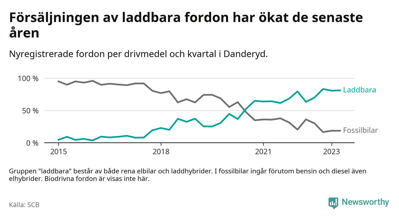 Under andra kvartalet 2023 var 81 procent av alla nyregistrerade personbilar i Danderyd laddbara (sammanlagt registrerades 536 nya bilar). Merparten av de laddbara bilarna var rena elbilar (57 procent av alla).