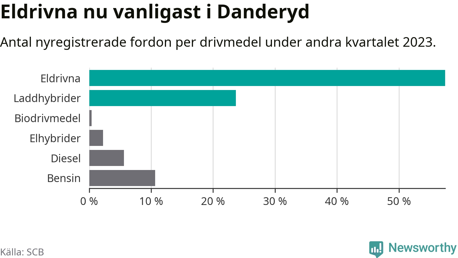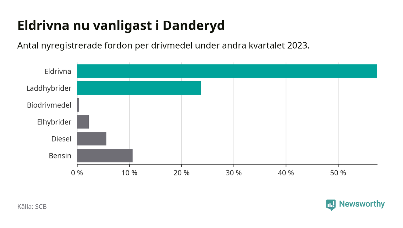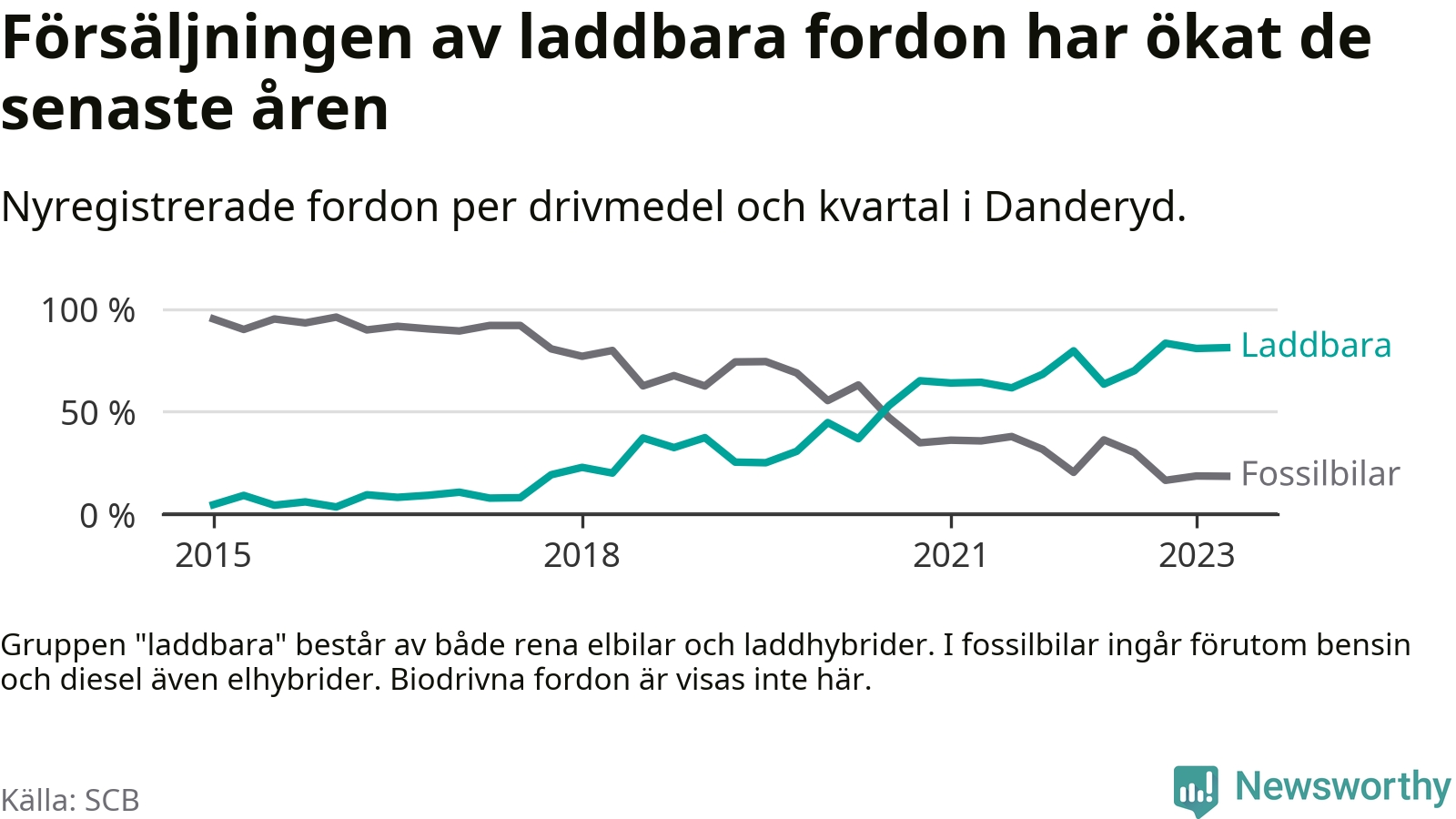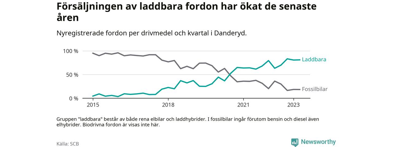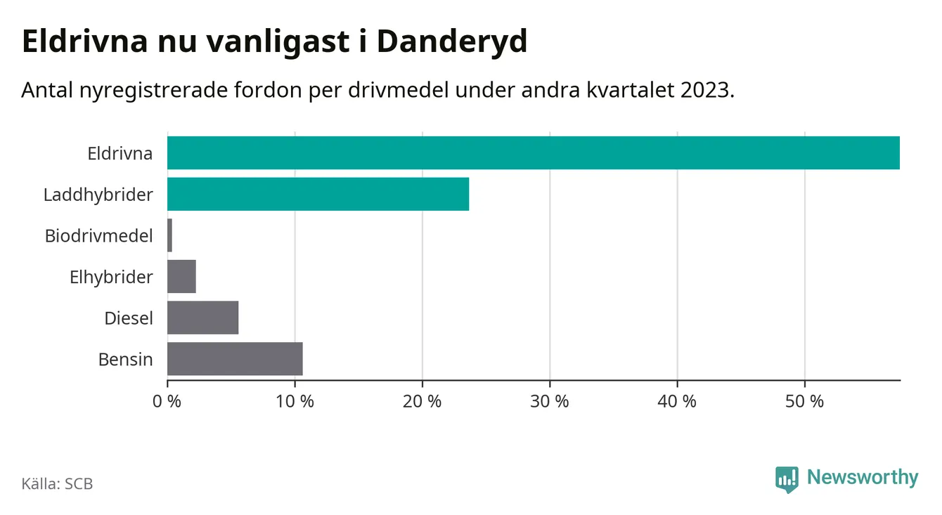 Under andra kvartalet 2023 var 81 procent av alla nyregistrerade personbilar i Danderyd laddbara (sammanlagt registrerades 536 nya bilar). Merparten av de laddbara bilarna var rena elbilar (57 procent av alla).