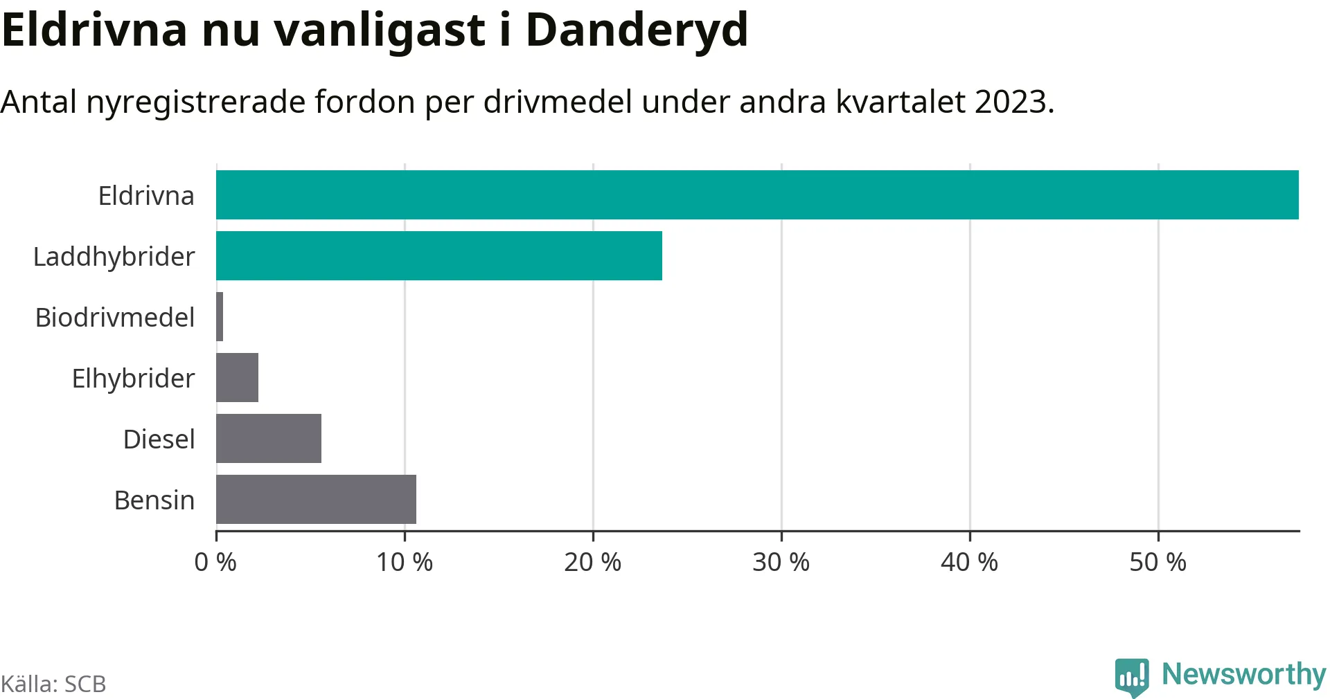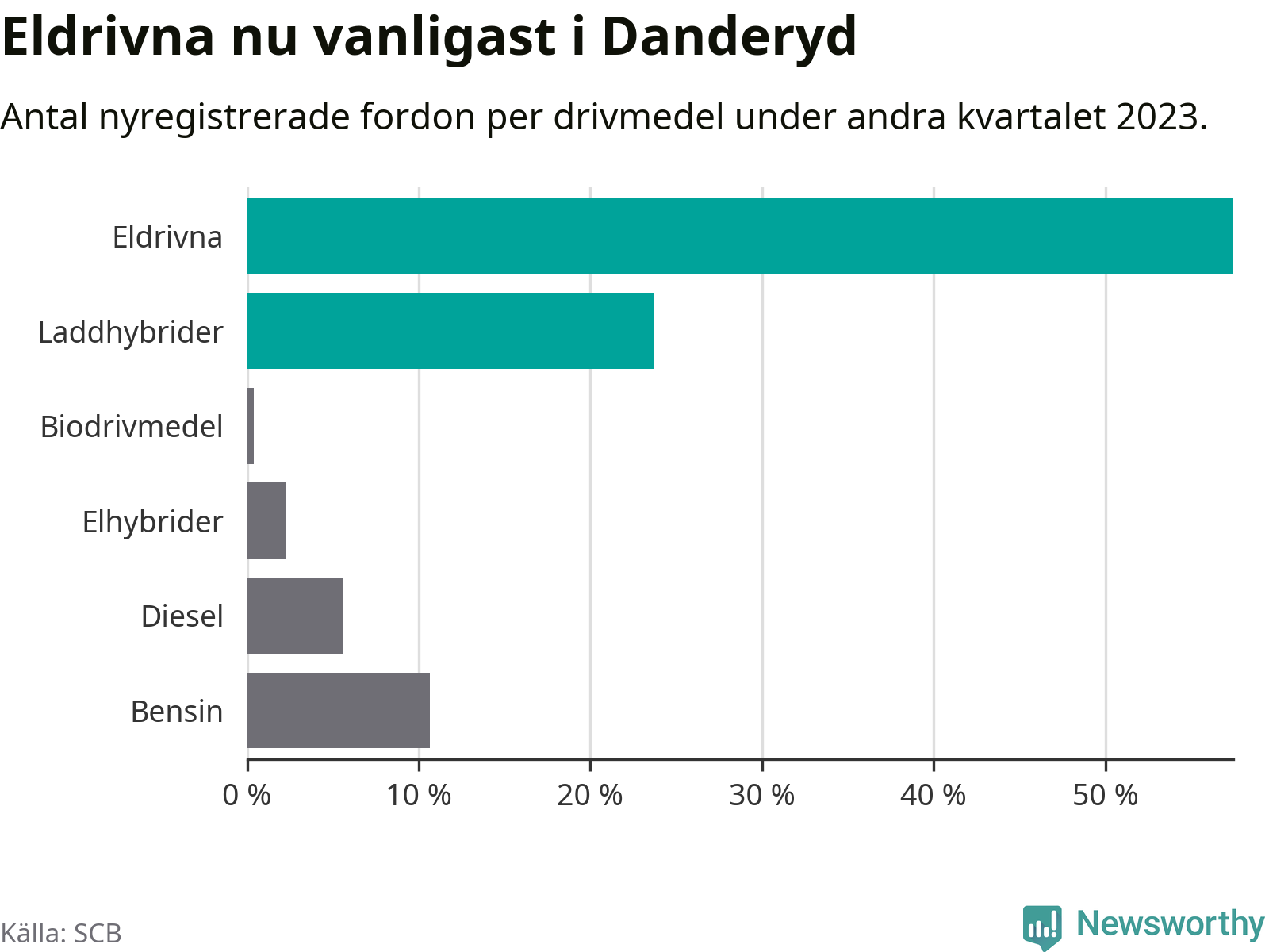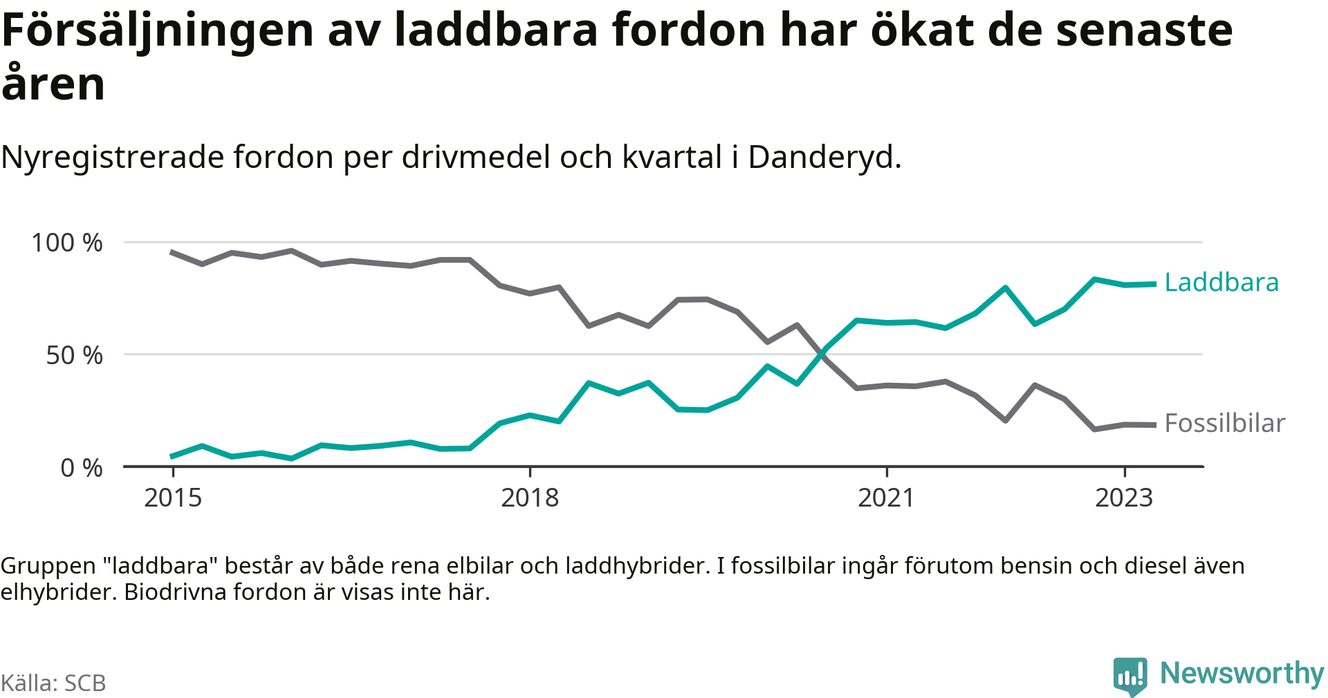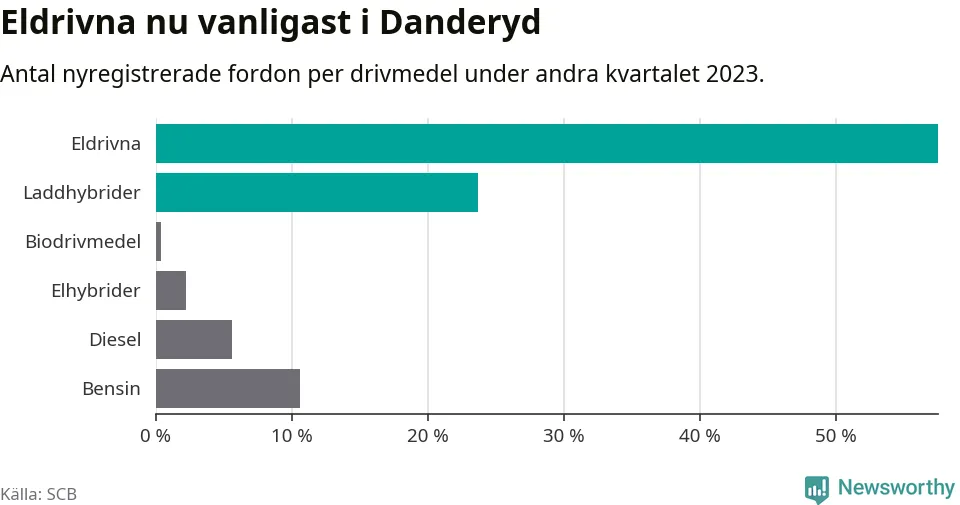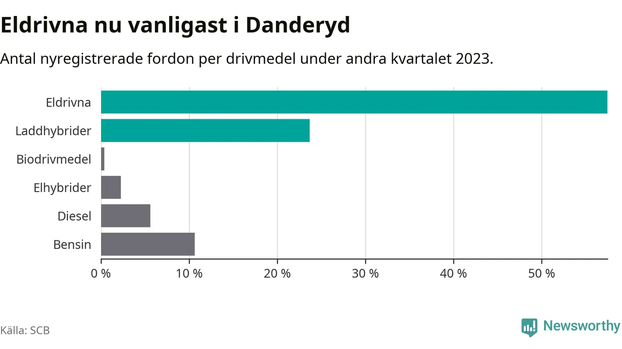 Under andra kvartalet 2023 var 81 procent av alla nyregistrerade personbilar i Danderyd laddbara (sammanlagt registrerades 536 nya bilar). Merparten av de laddbara bilarna var rena elbilar (57 procent av alla).