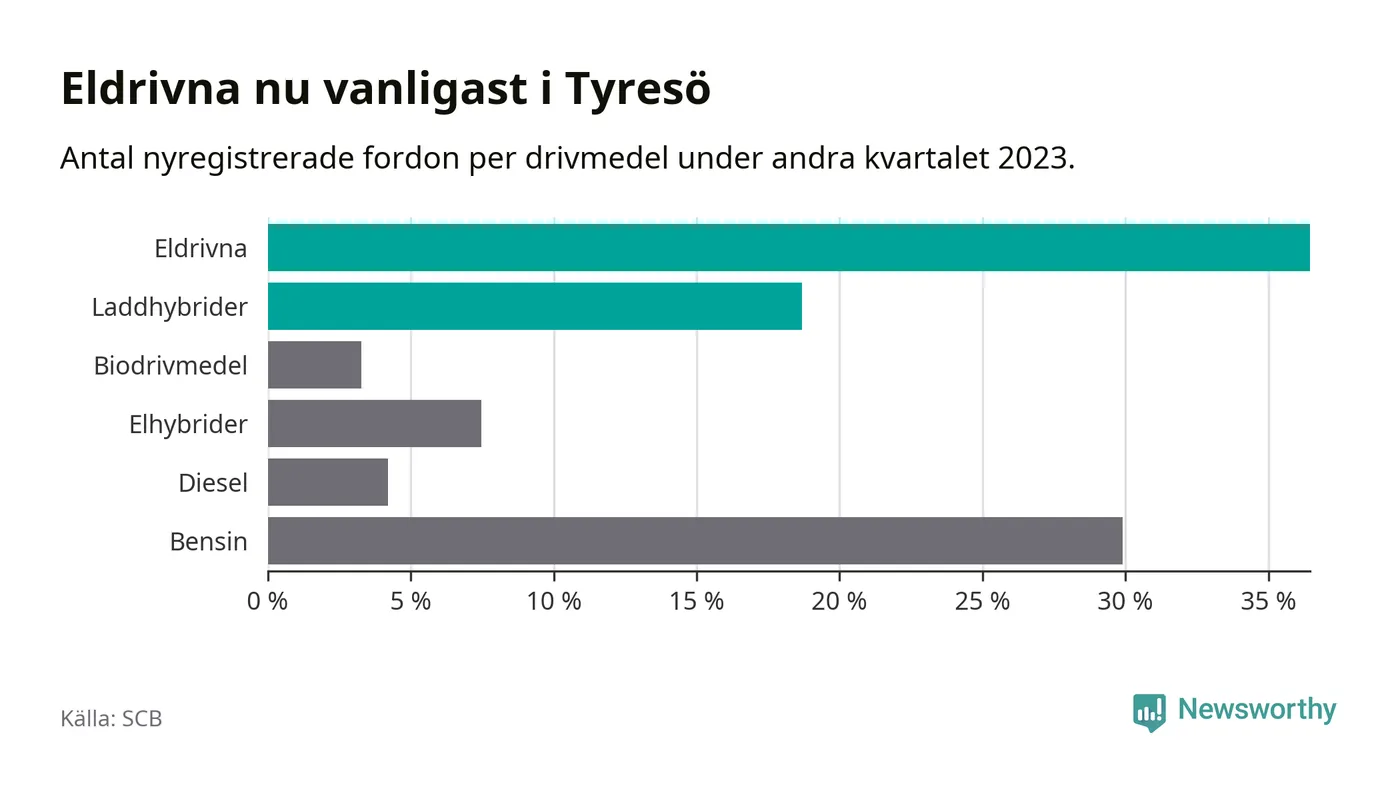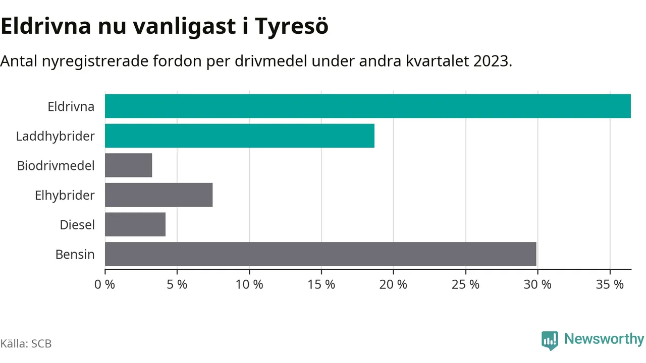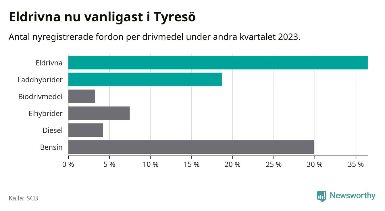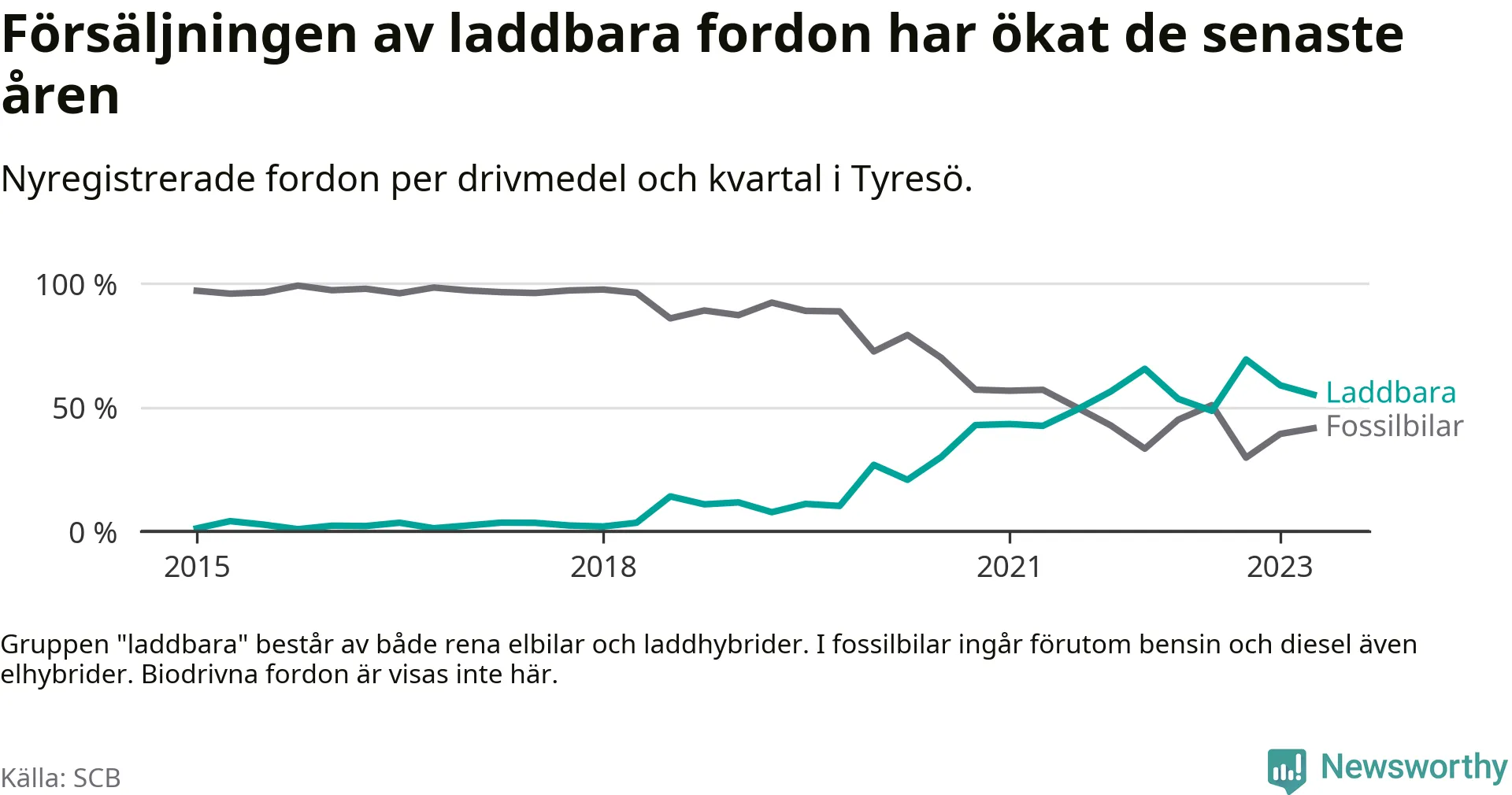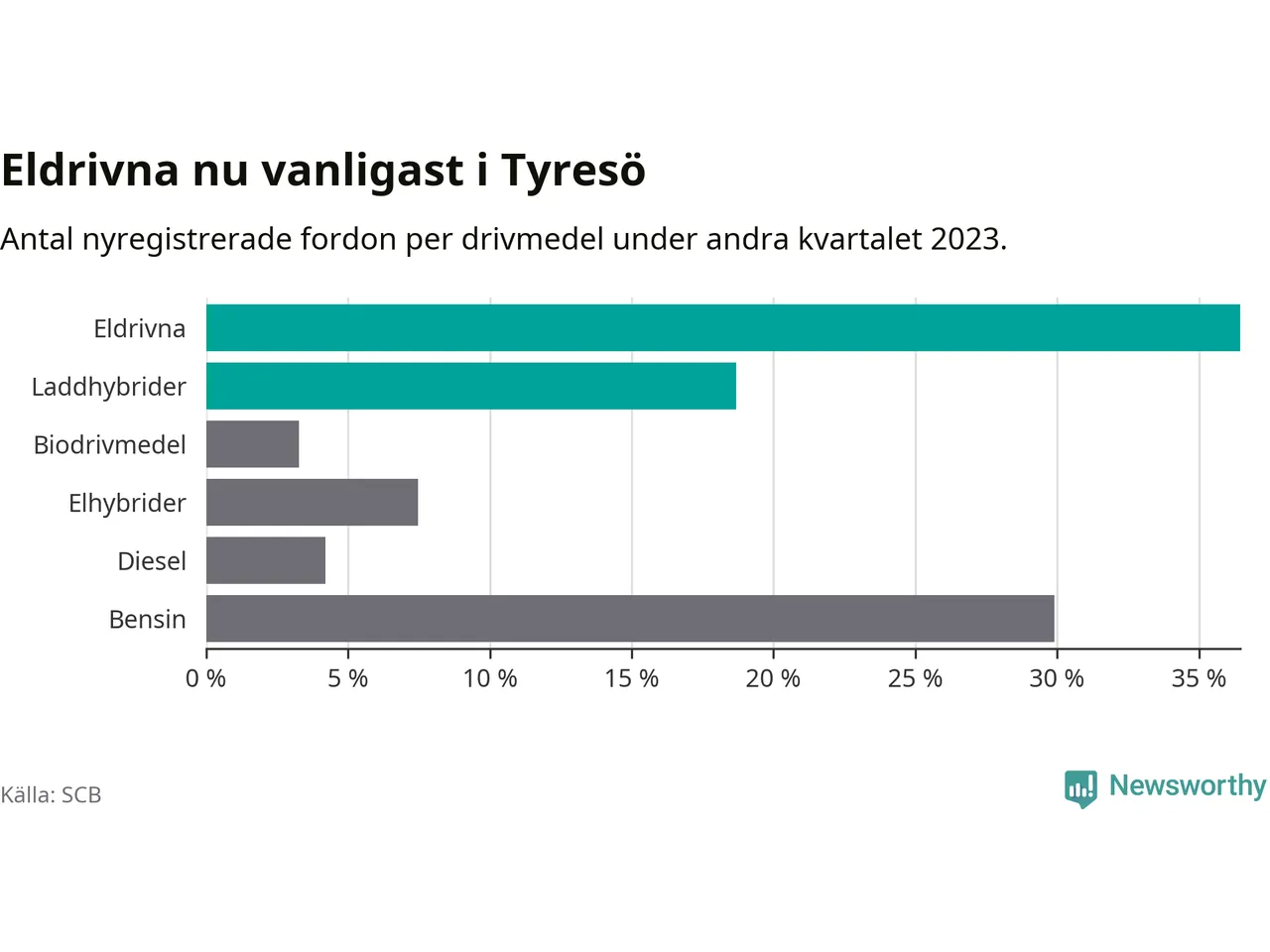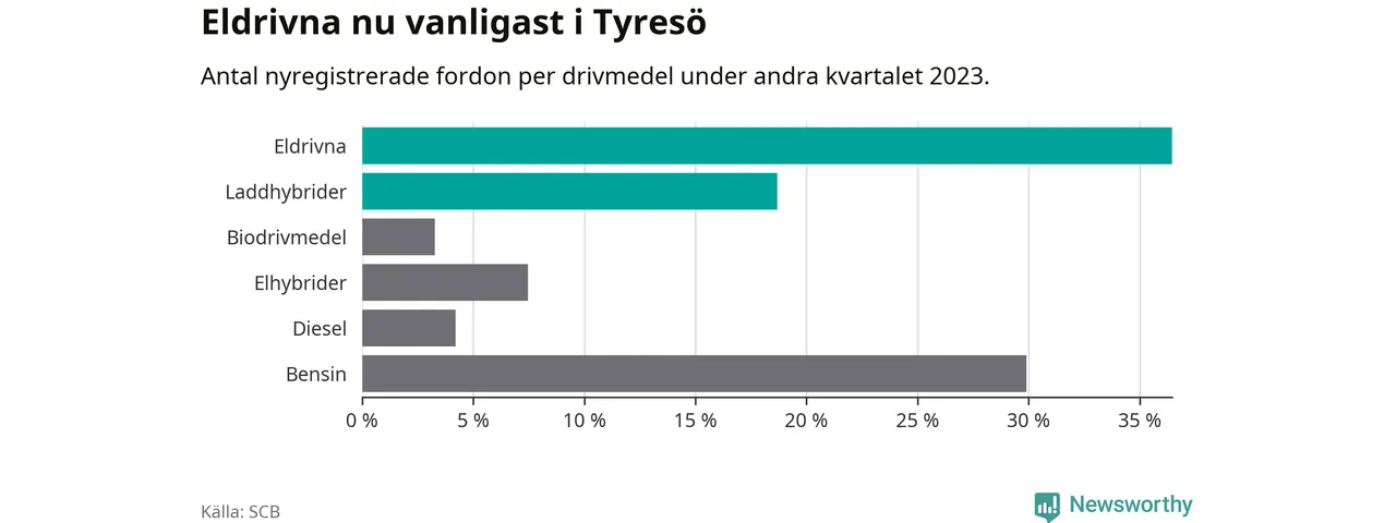 Under andra kvartalet 2023 var 55 procent av alla nyregistrerade personbilar i Tyresö laddbara (sammanlagt registrerades 214 nya bilar). Merparten av de laddbara bilarna var rena elbilar (36 procent av alla).