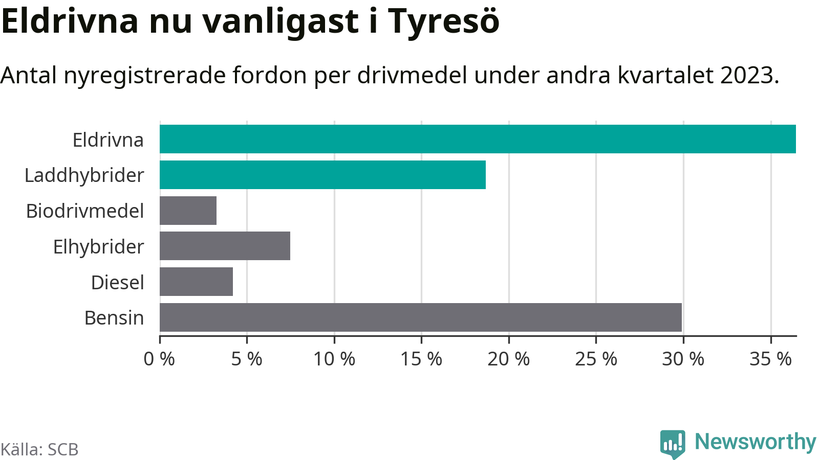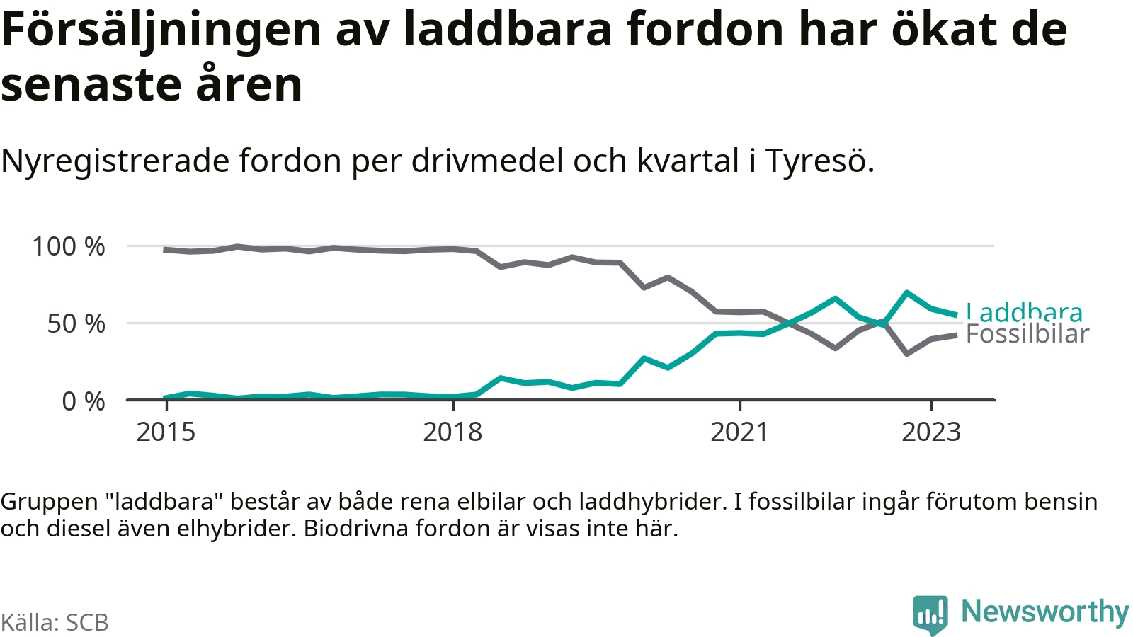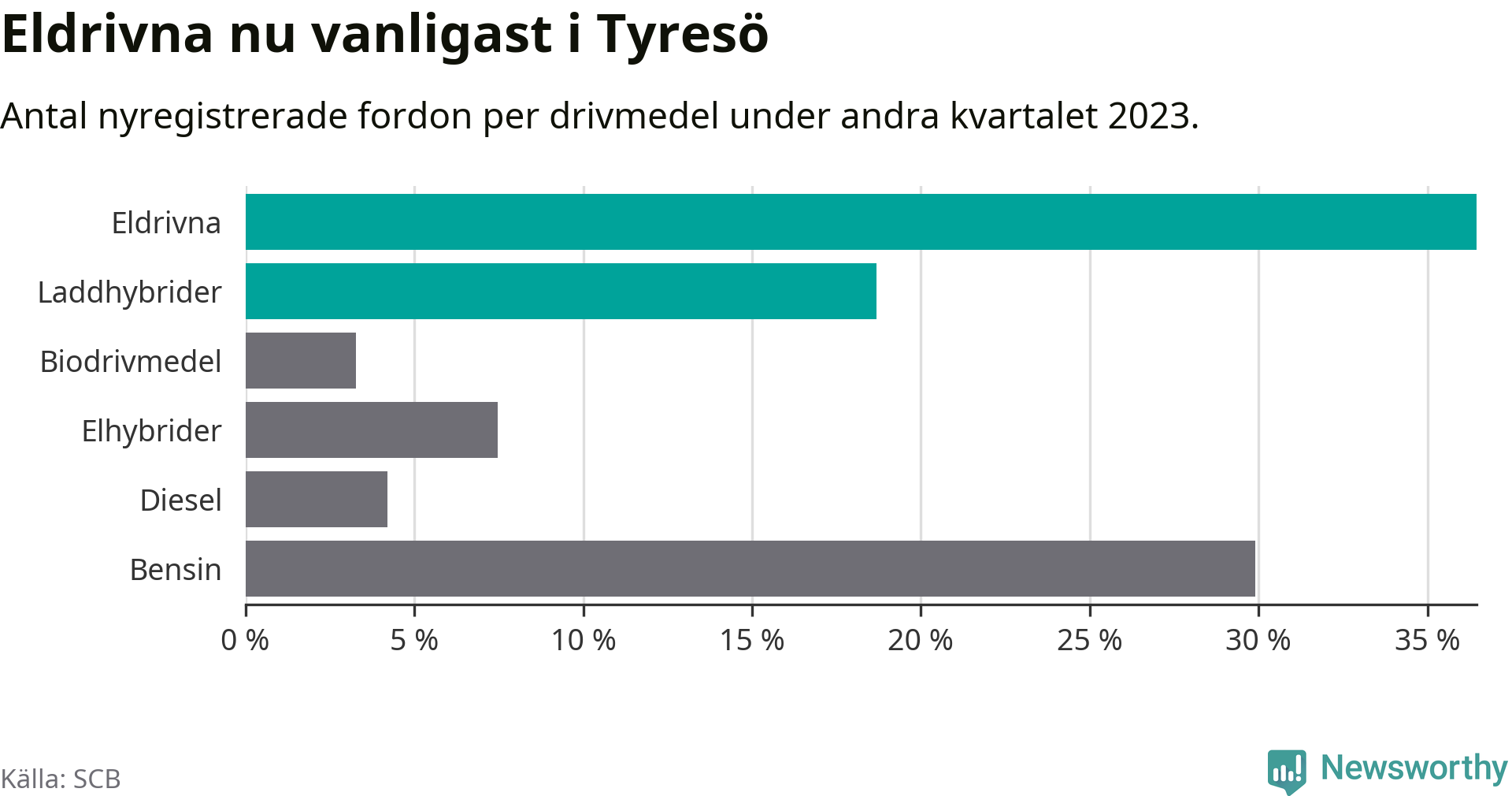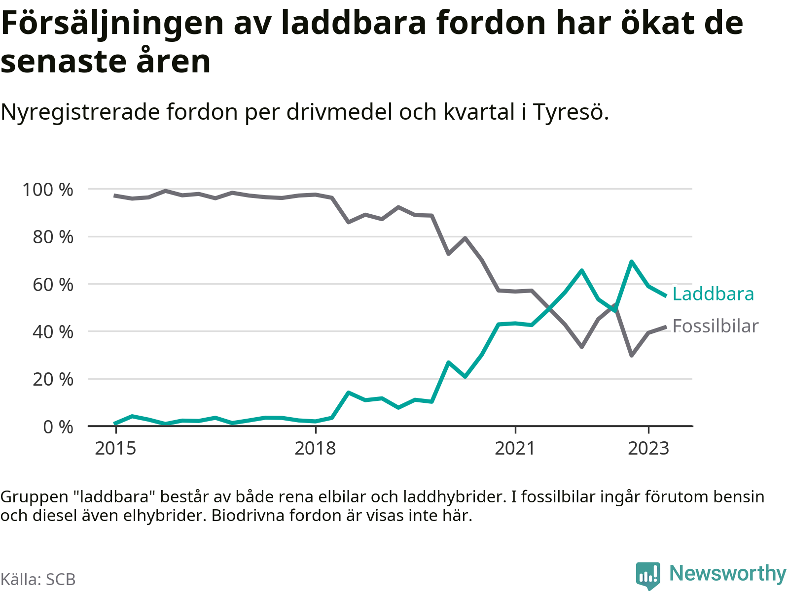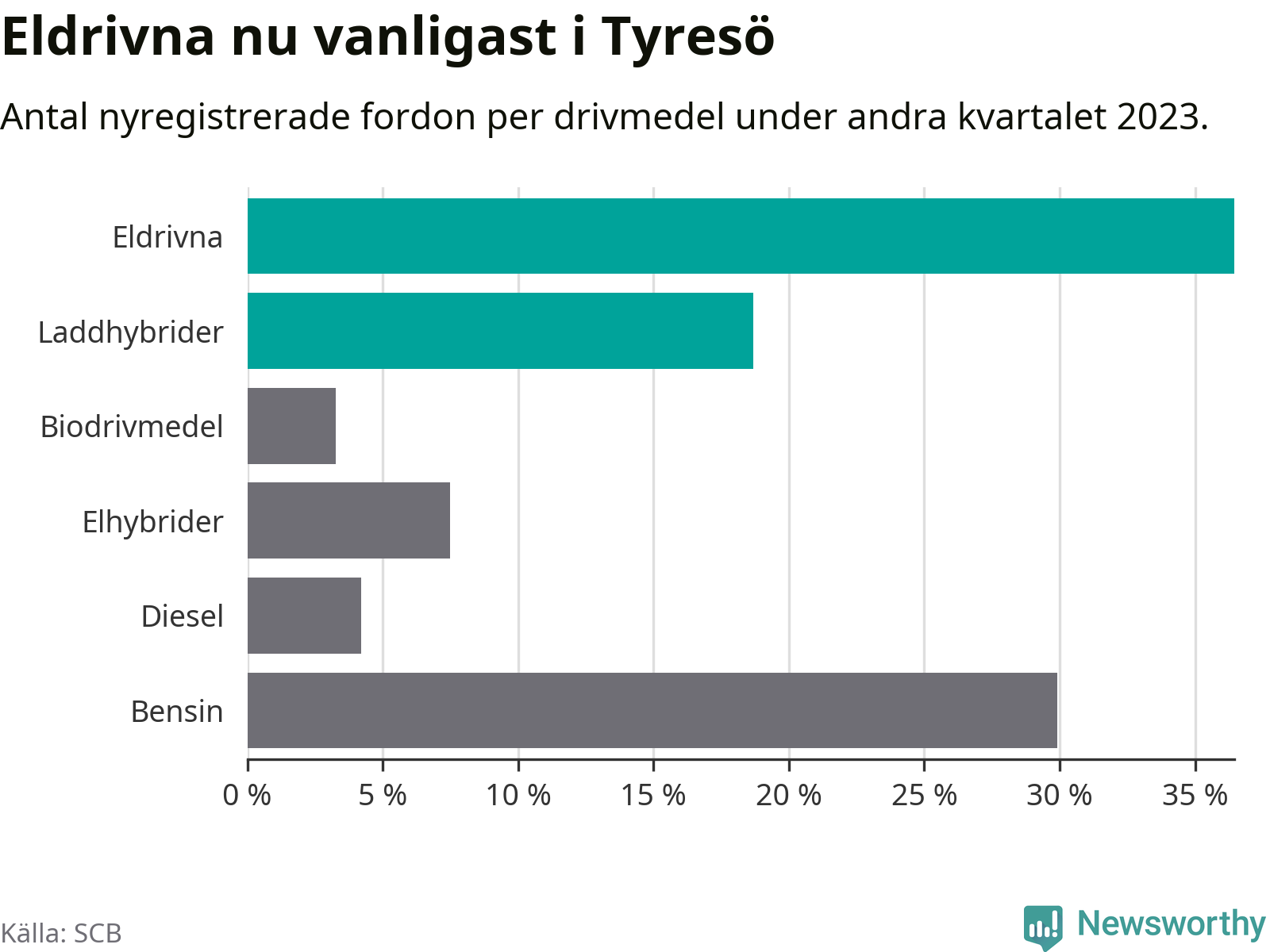 Under andra kvartalet 2023 var 55 procent av alla nyregistrerade personbilar i Tyresö laddbara (sammanlagt registrerades 214 nya bilar). Merparten av de laddbara bilarna var rena elbilar (36 procent av alla).