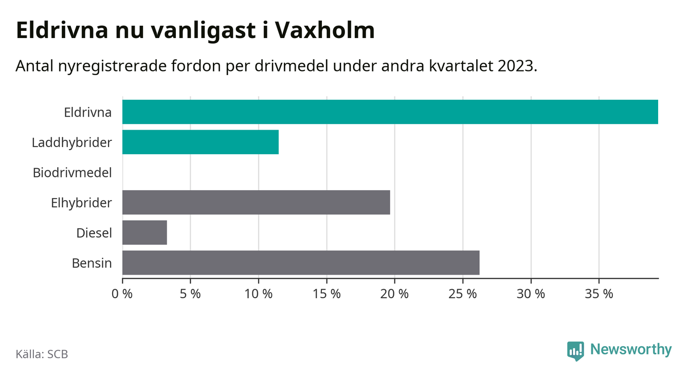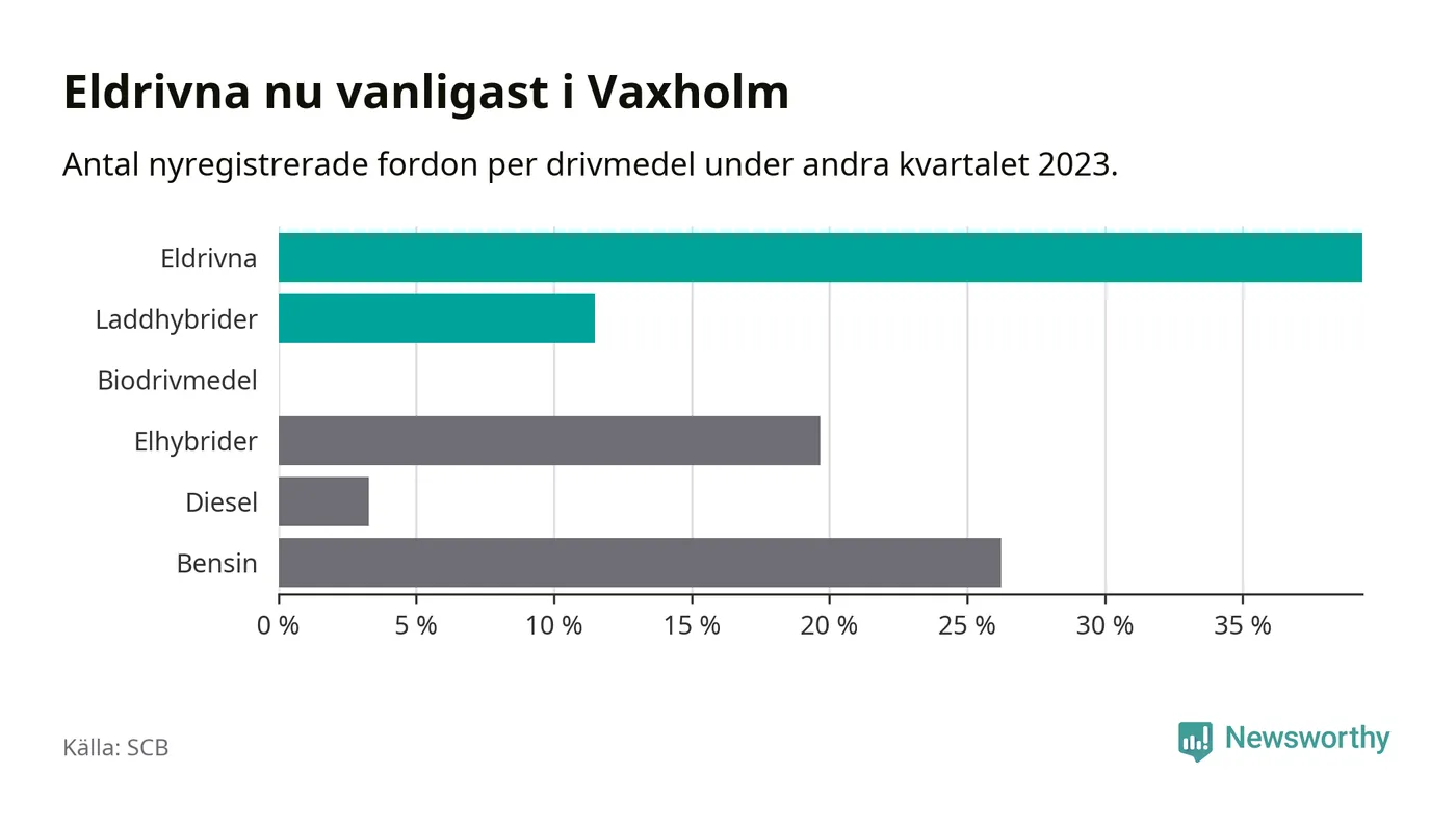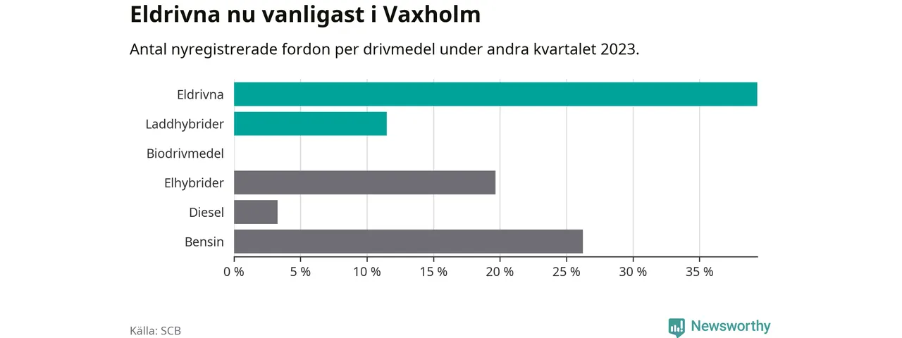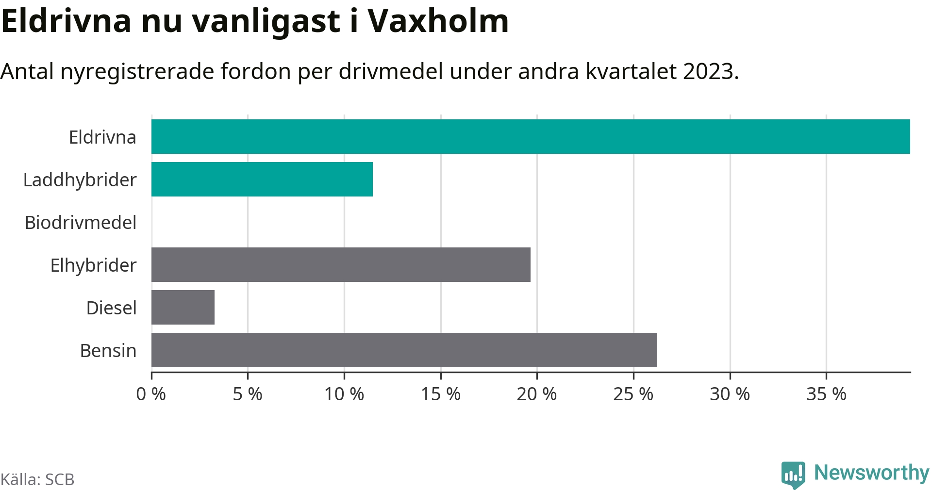 Under andra kvartalet 2023 var 51 procent av alla nyregistrerade personbilar i Vaxholm laddbara (sammanlagt registrerades 61 nya bilar). Merparten av de laddbara bilarna var rena elbilar (39 procent av alla).