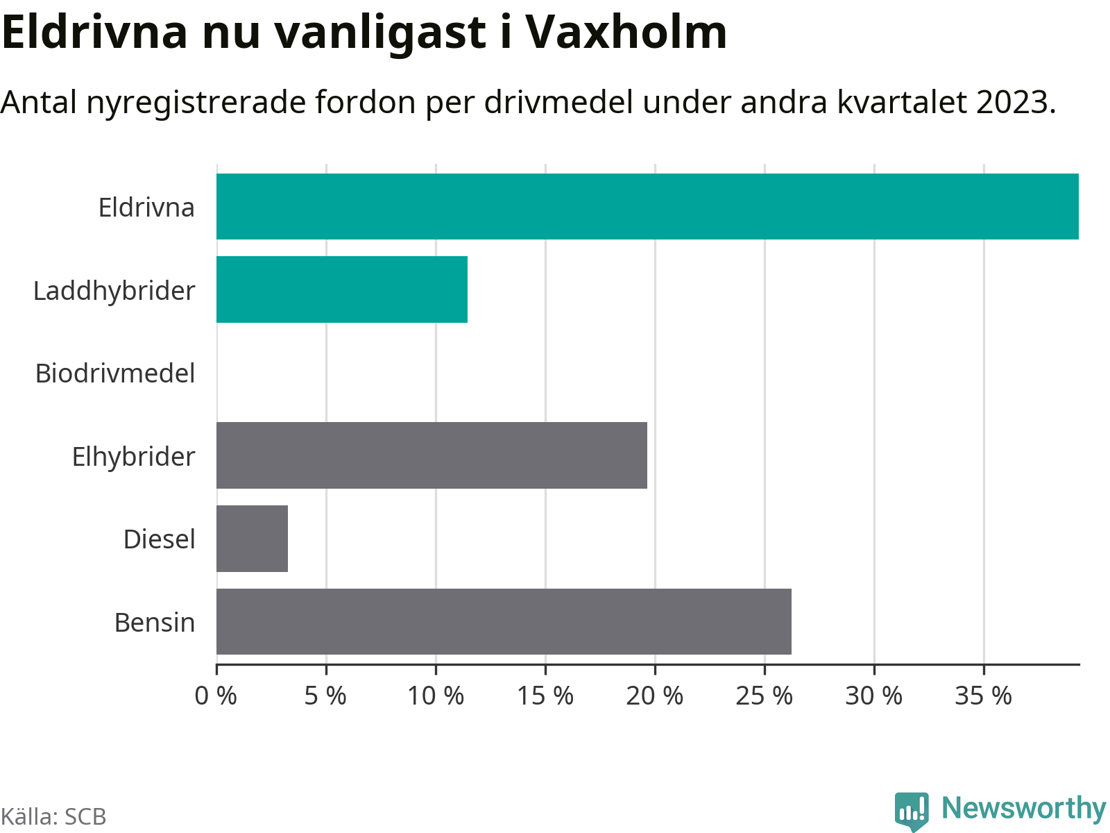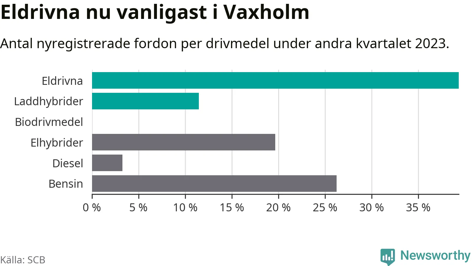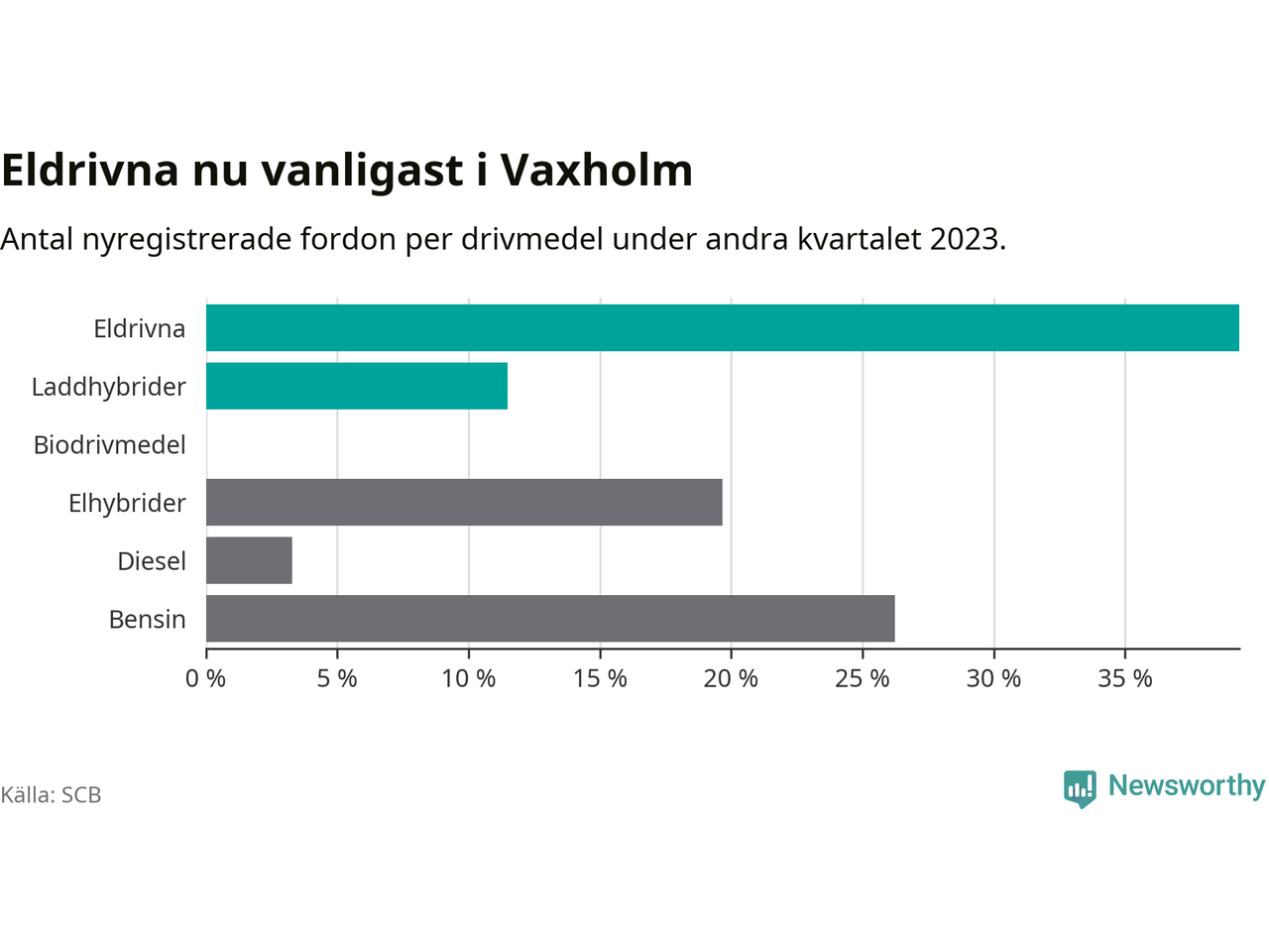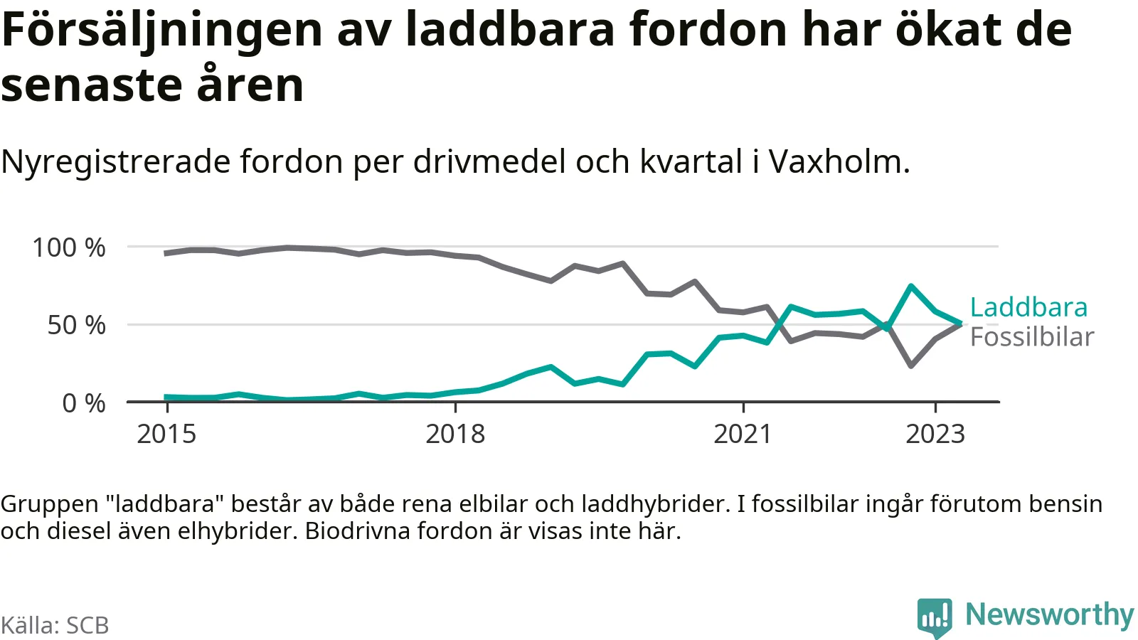 Under andra kvartalet 2023 var 51 procent av alla nyregistrerade personbilar i Vaxholm laddbara (sammanlagt registrerades 61 nya bilar). Merparten av de laddbara bilarna var rena elbilar (39 procent av alla).