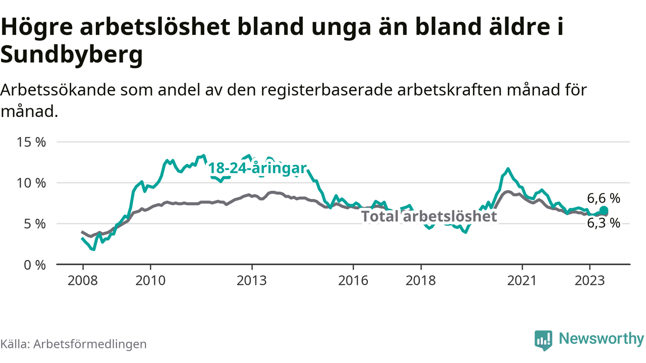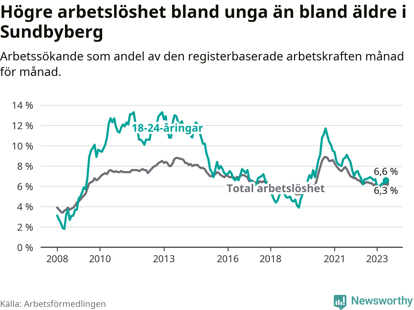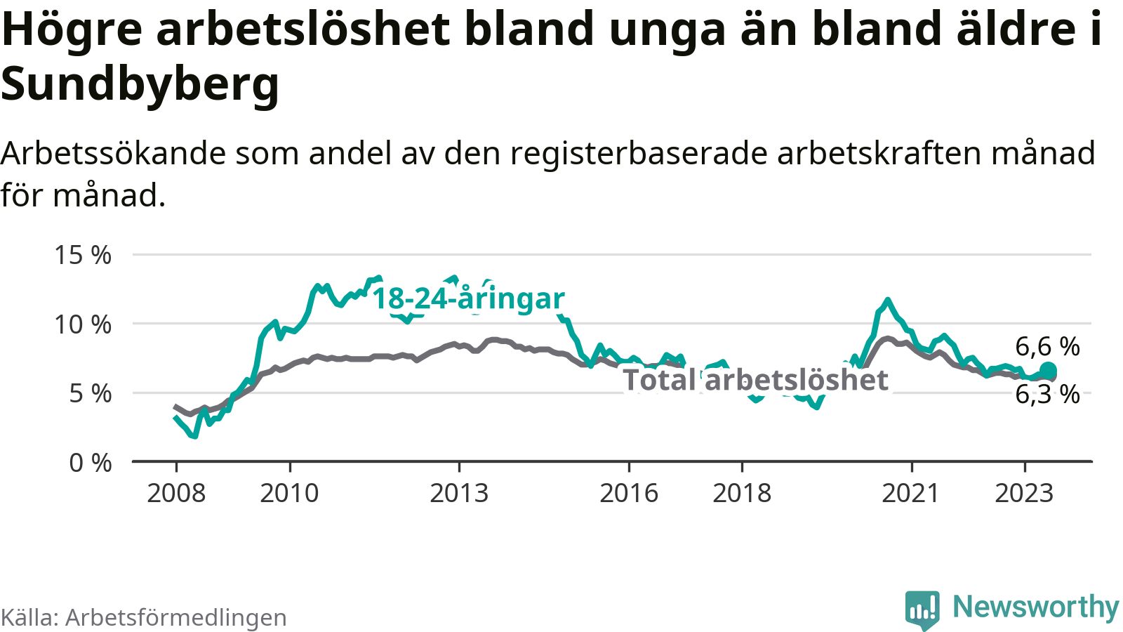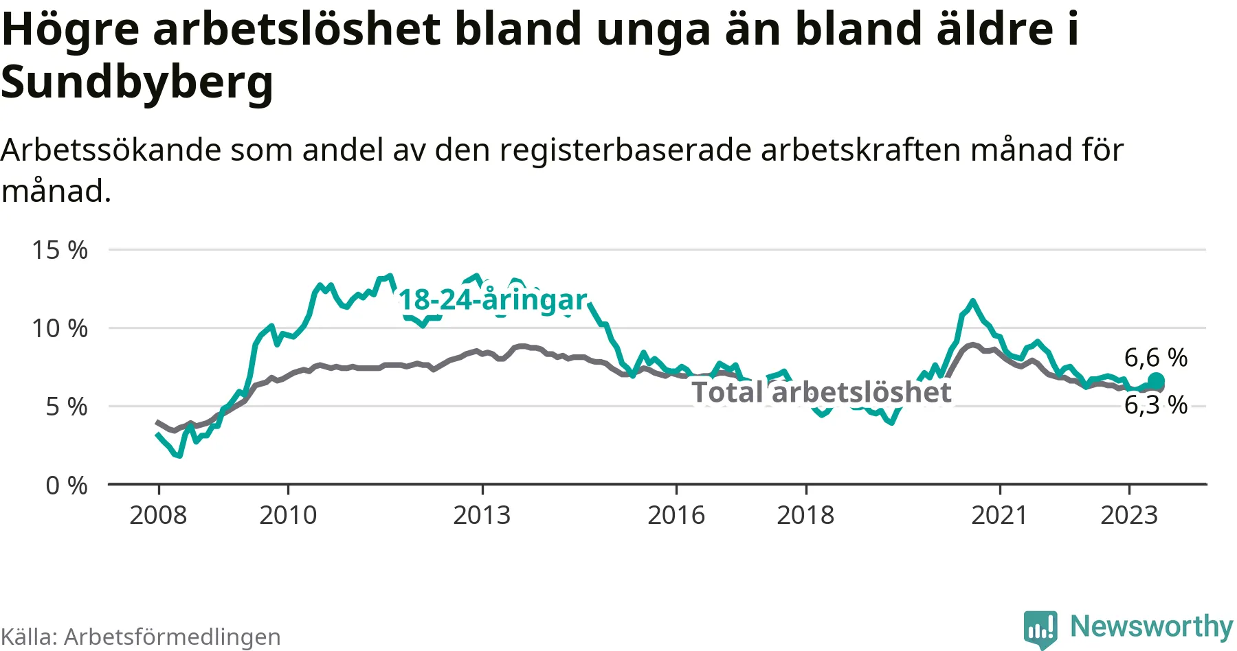 Till skillnad från den totala arbetslösheten sjunker arbetslösheten bland unga (−0,1 procentenheter). I juni var 6,6 procent av 18–24-åringarna inskrivna som arbetssökande (motsvarande 149 personer). Mäter vi antalet inskrivna ser vi en ökning med åtta personer på ett års sikt.