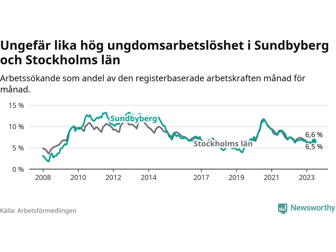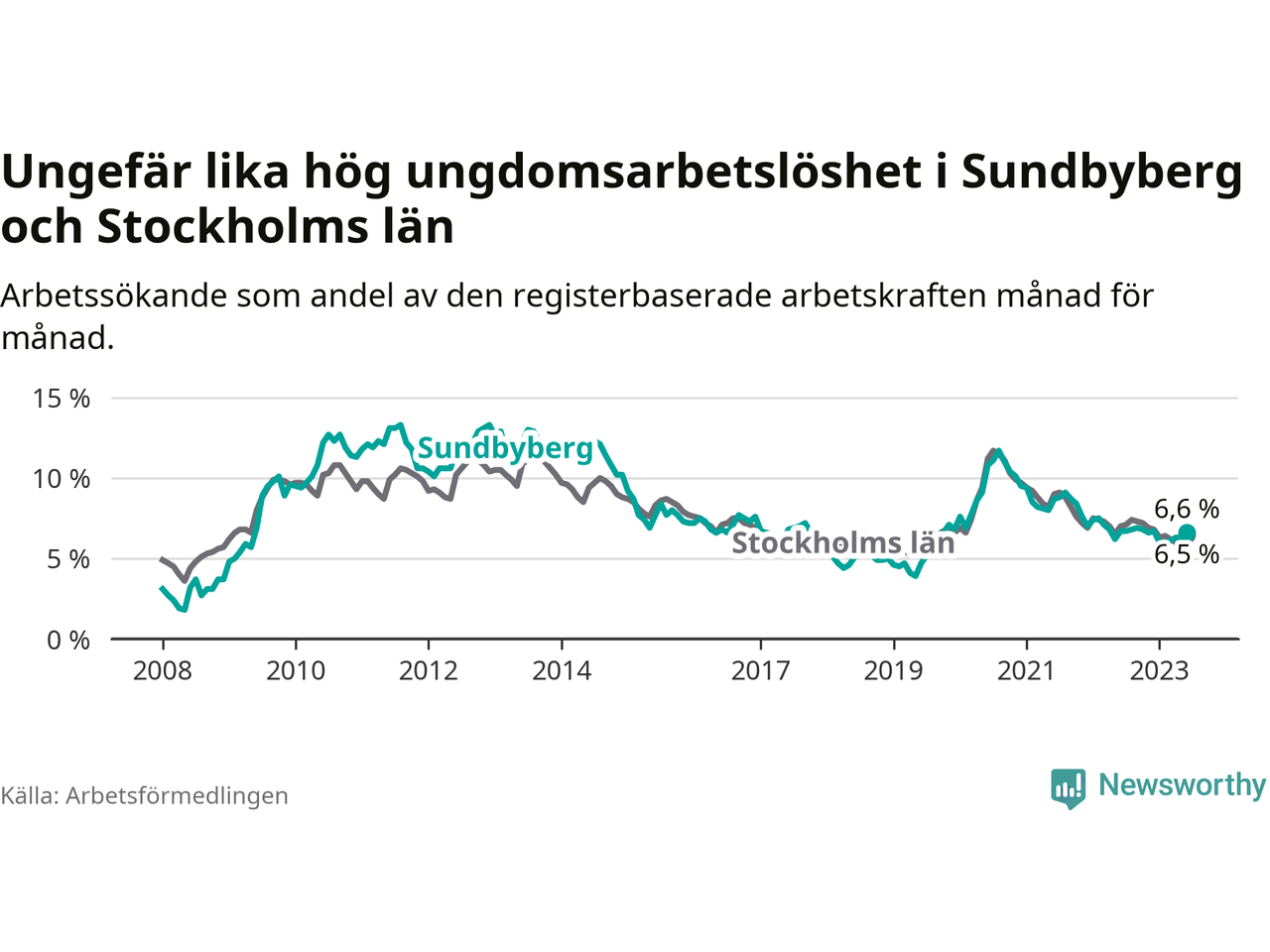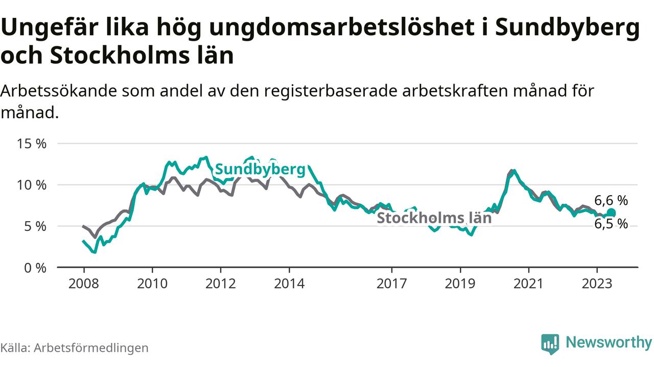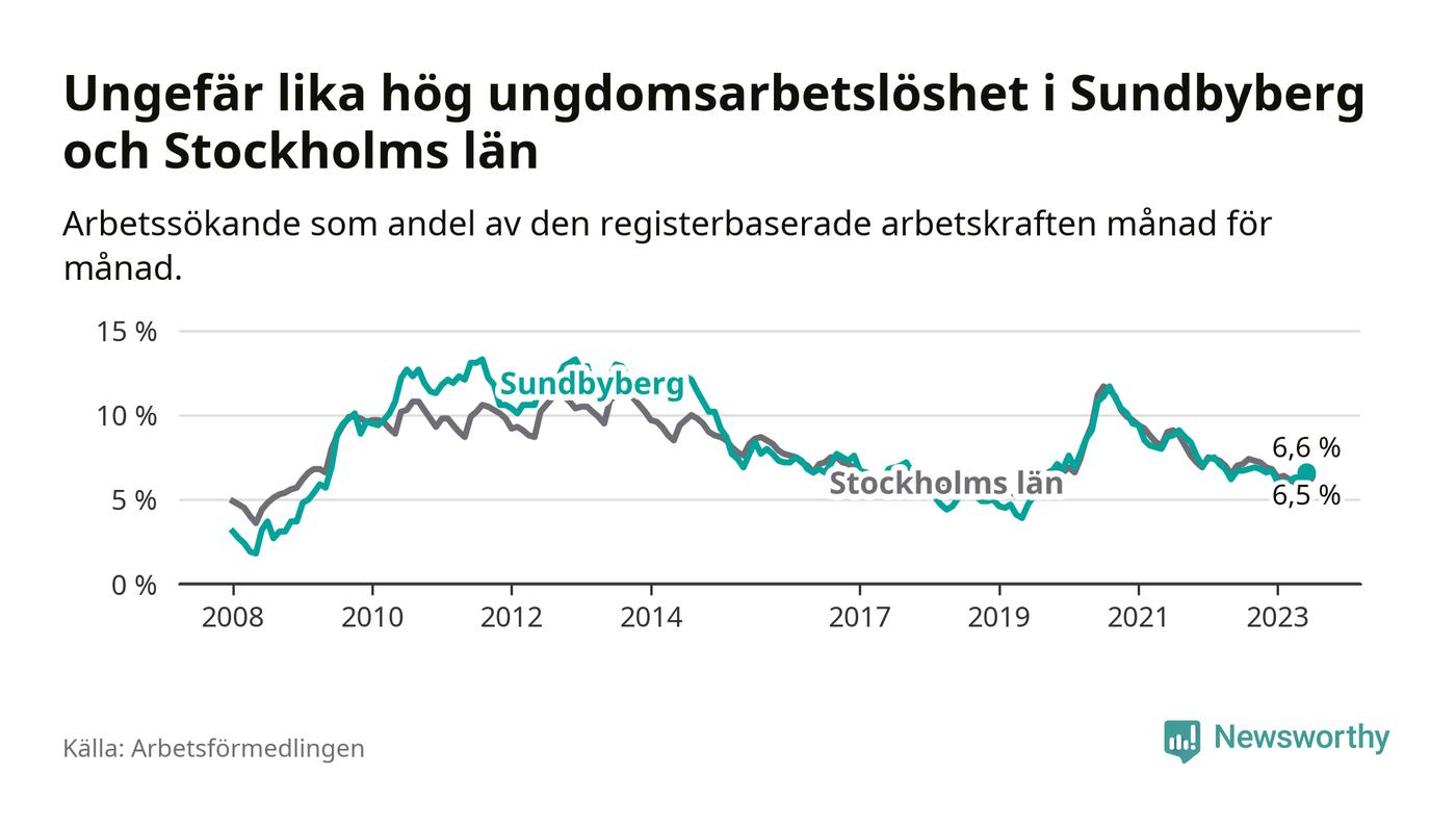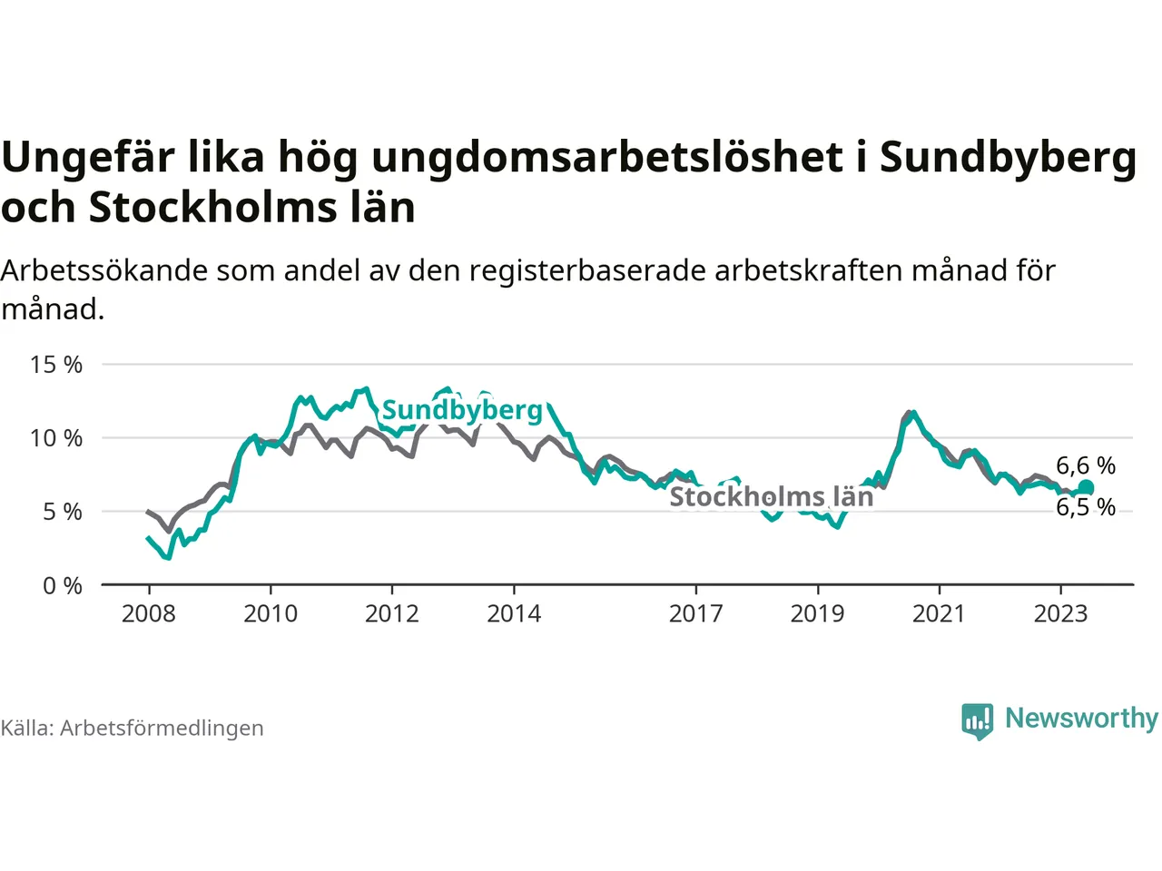 Medan Sundbyberg har högre total arbetslöshet än Stockholms län, ligger ungdomsarbetslösheten på i stort sett samma nivå.