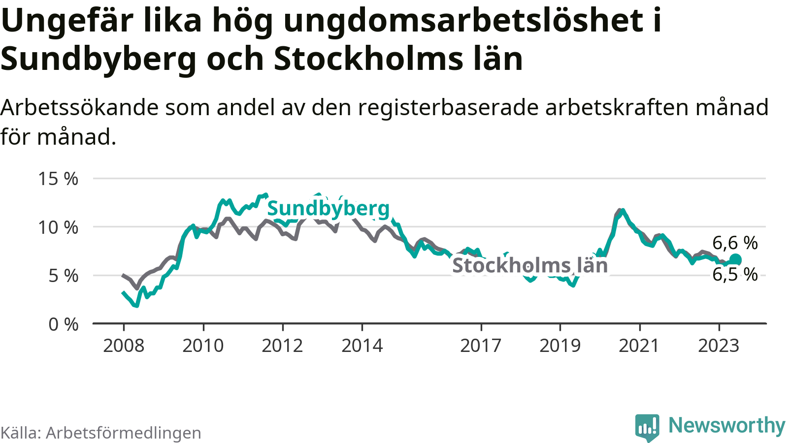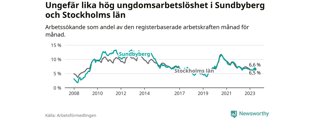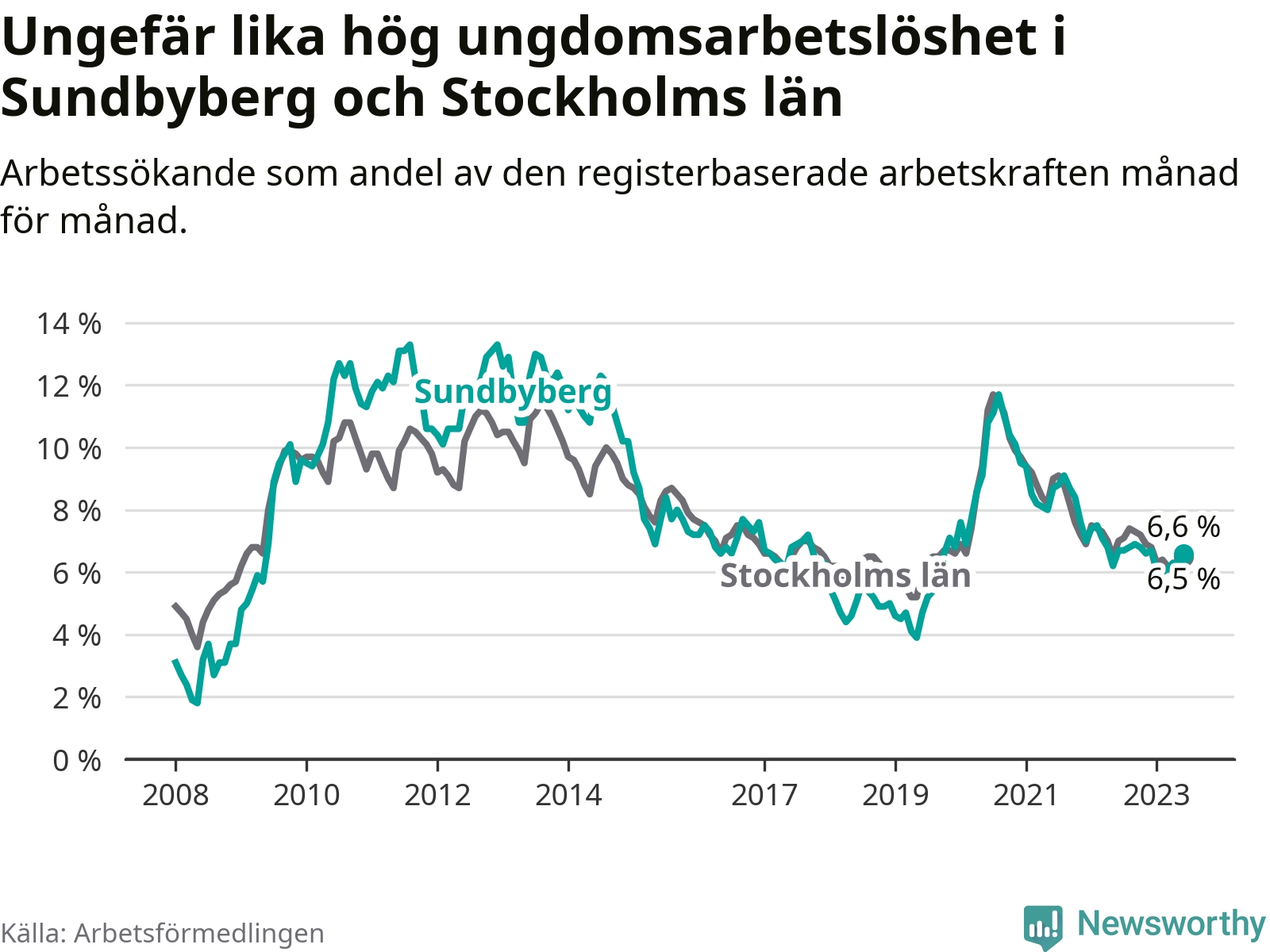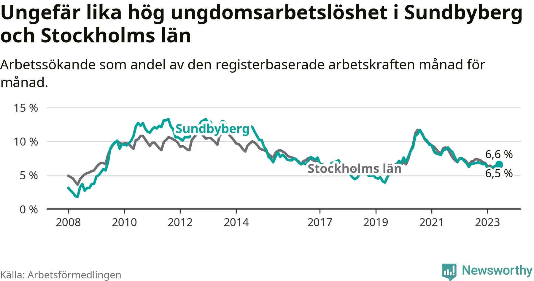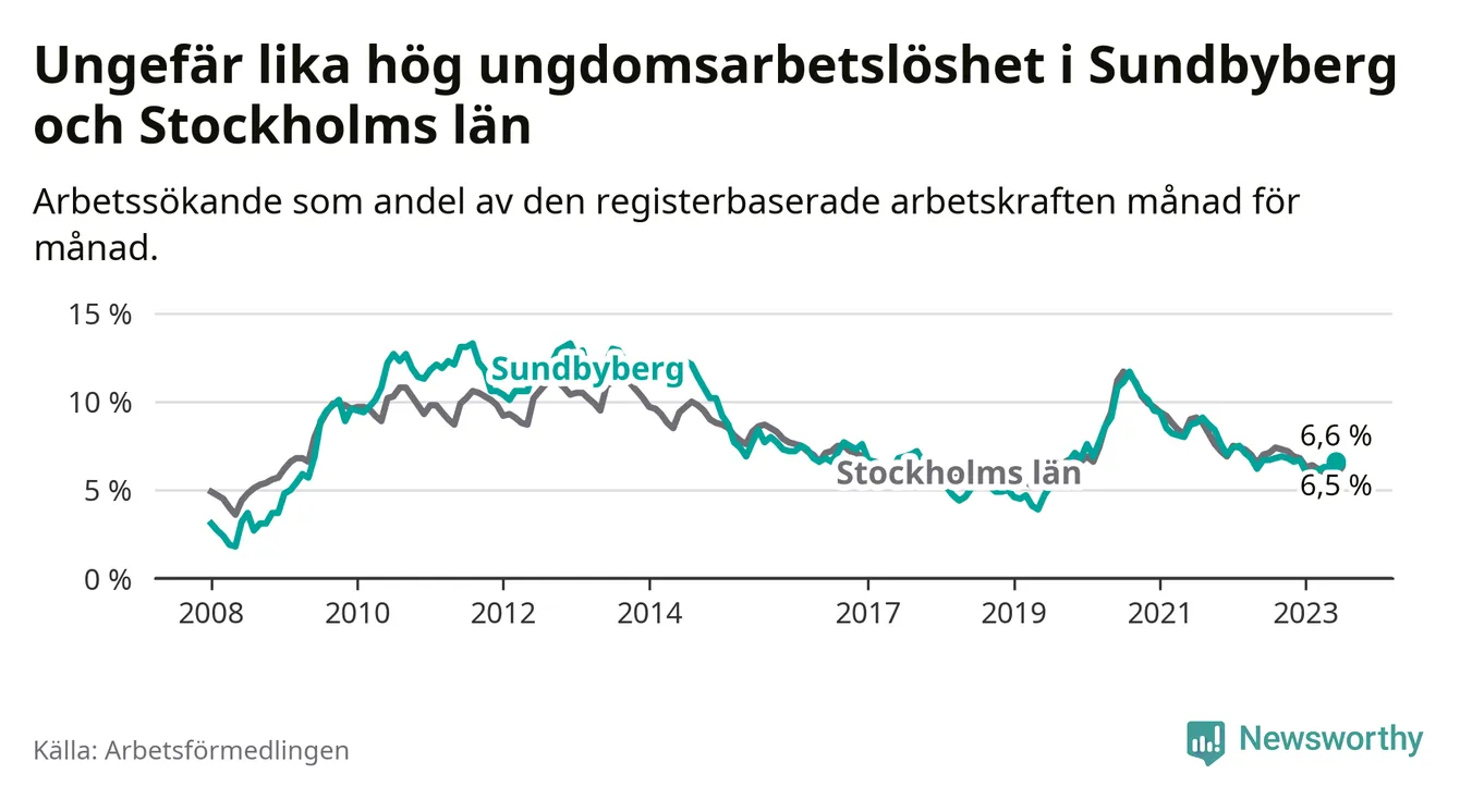 Medan Sundbyberg har högre total arbetslöshet än Stockholms län, ligger ungdomsarbetslösheten på i stort sett samma nivå.