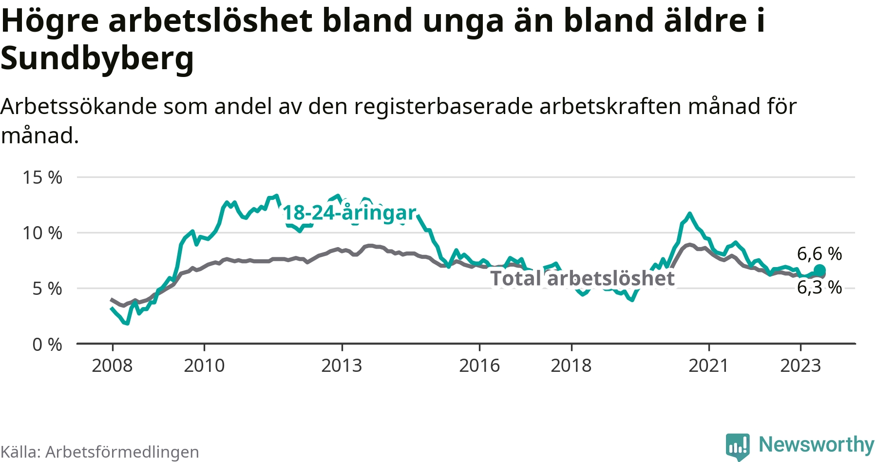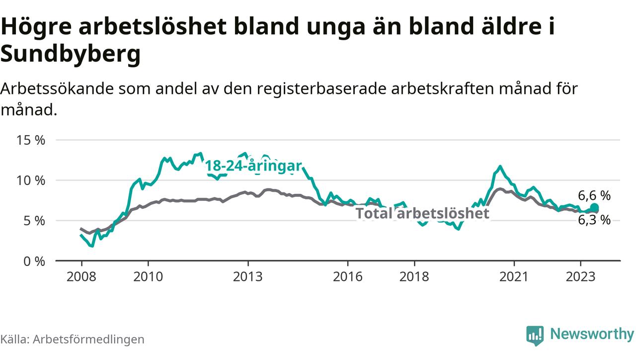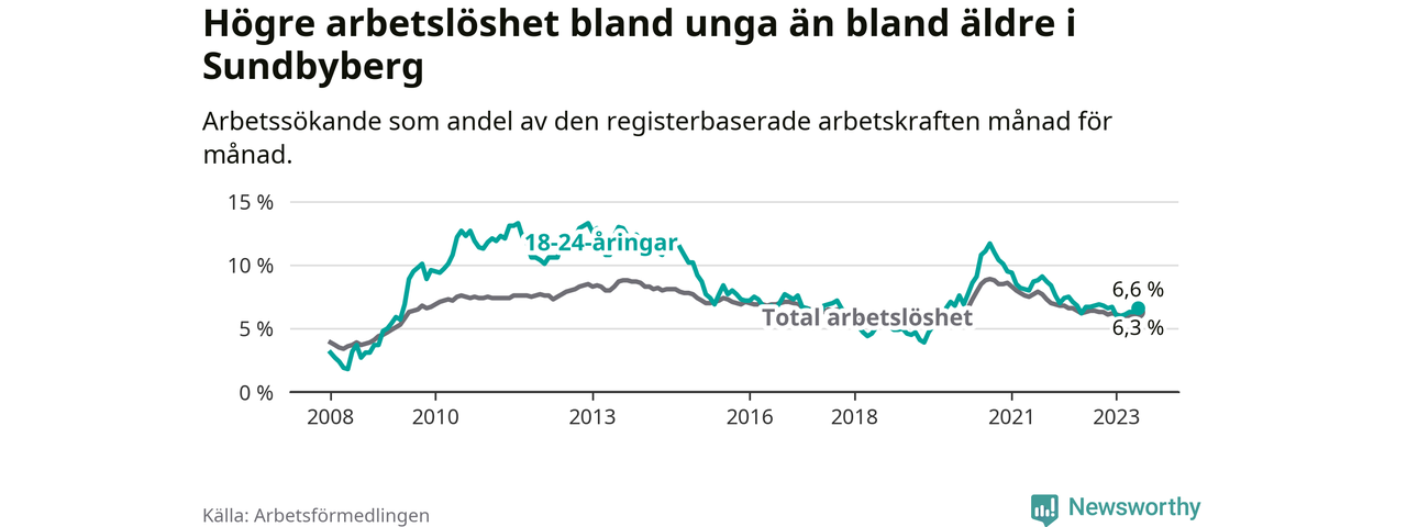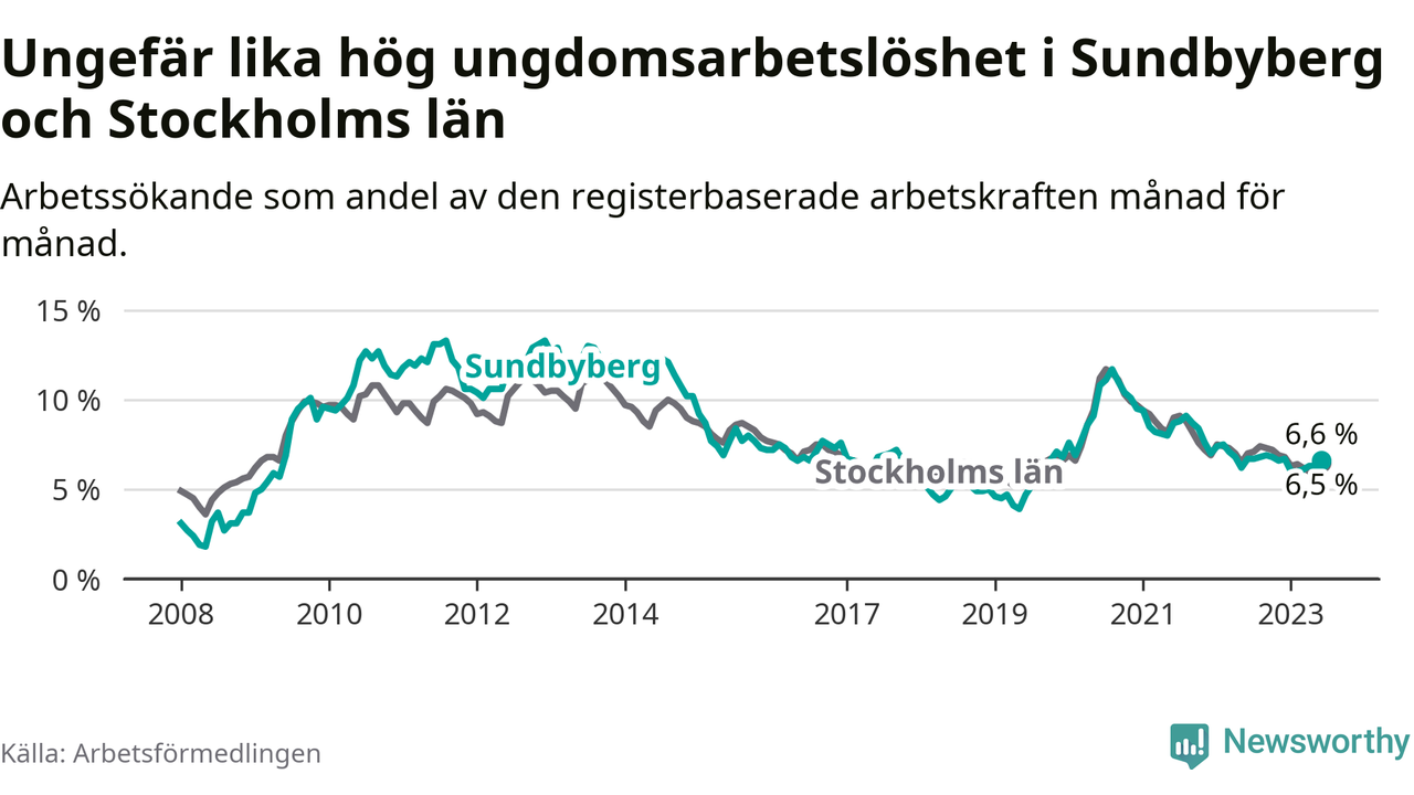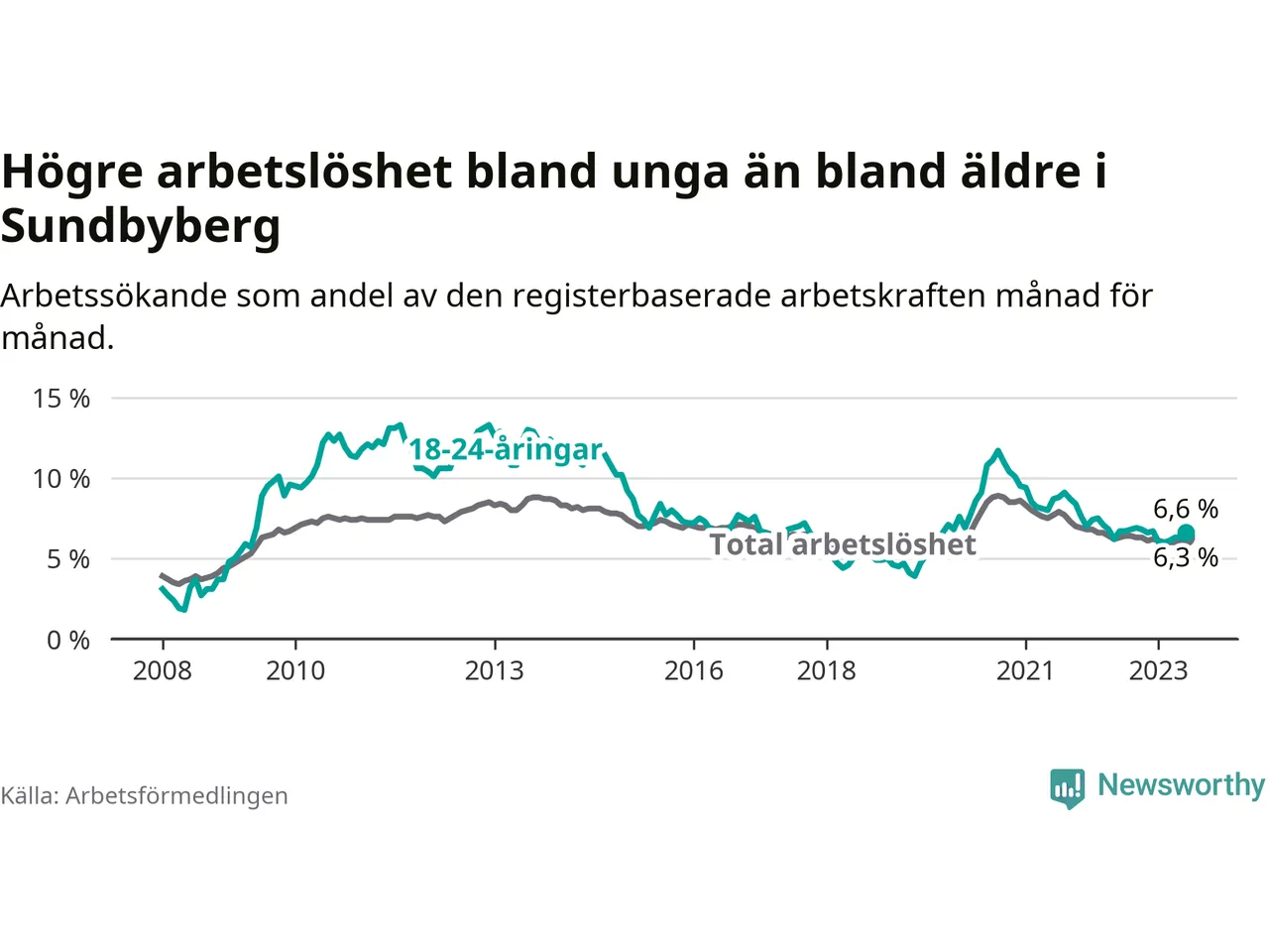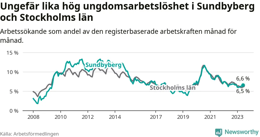 Medan Sundbyberg har högre total arbetslöshet än Stockholms län, ligger ungdomsarbetslösheten på i stort sett samma nivå.
