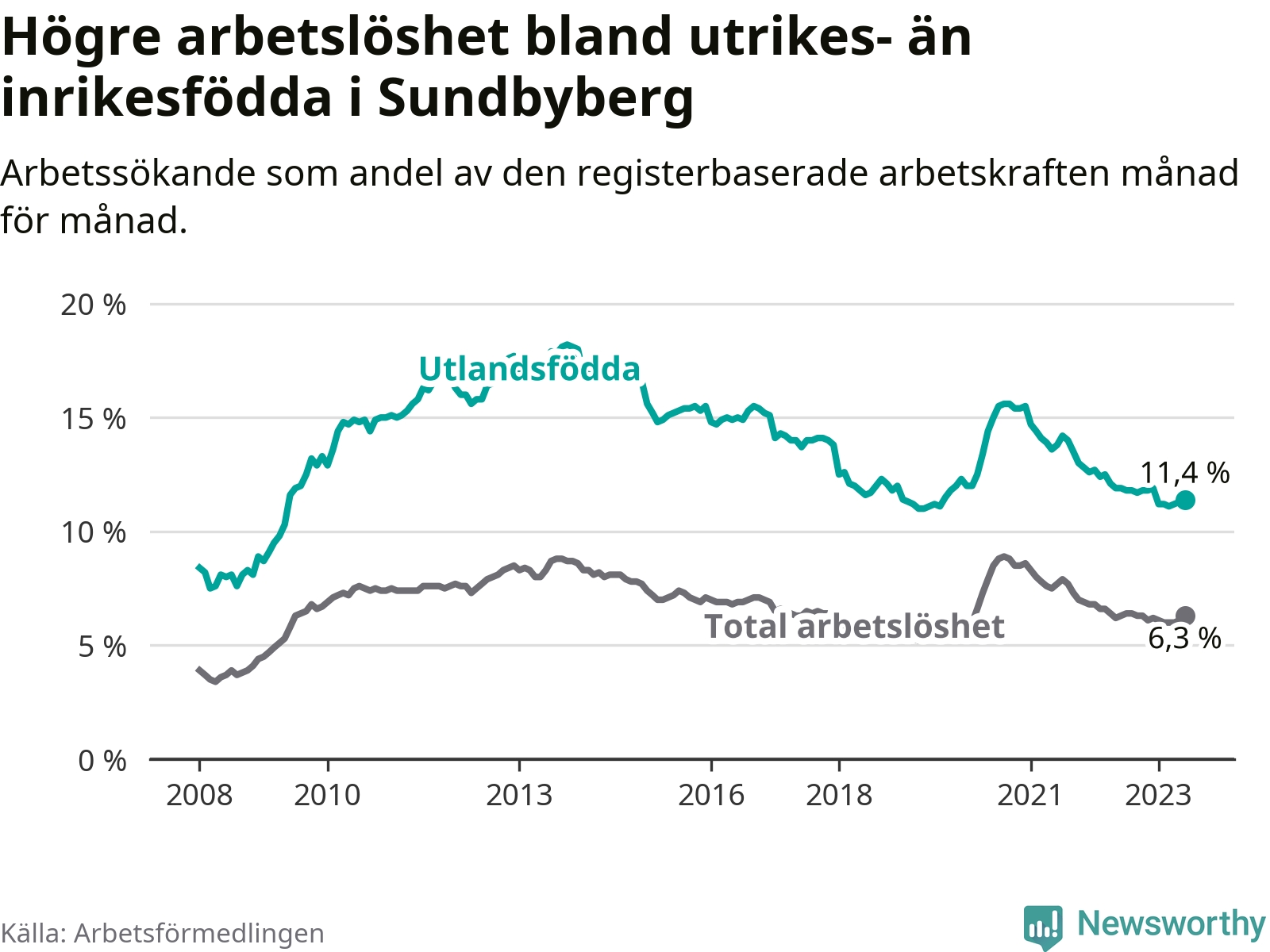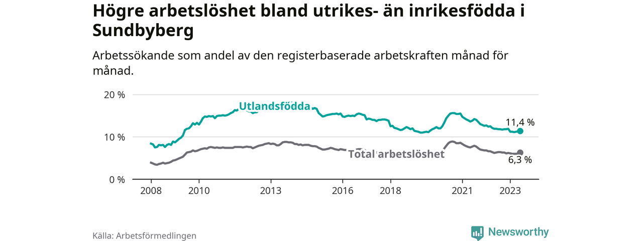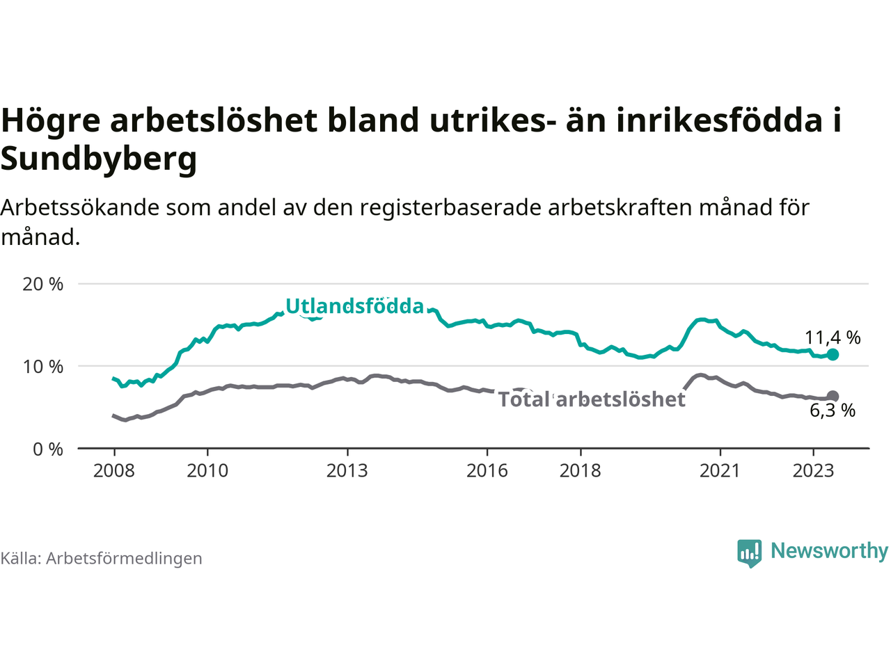 Skillnaden i arbetslöshet mellan utrikesfödda och hela befolkningen är 5,1 procentenheter i Sundbyberg. Det är en mindre skillnad än för ett år sedan (−0,5 procentenheter).