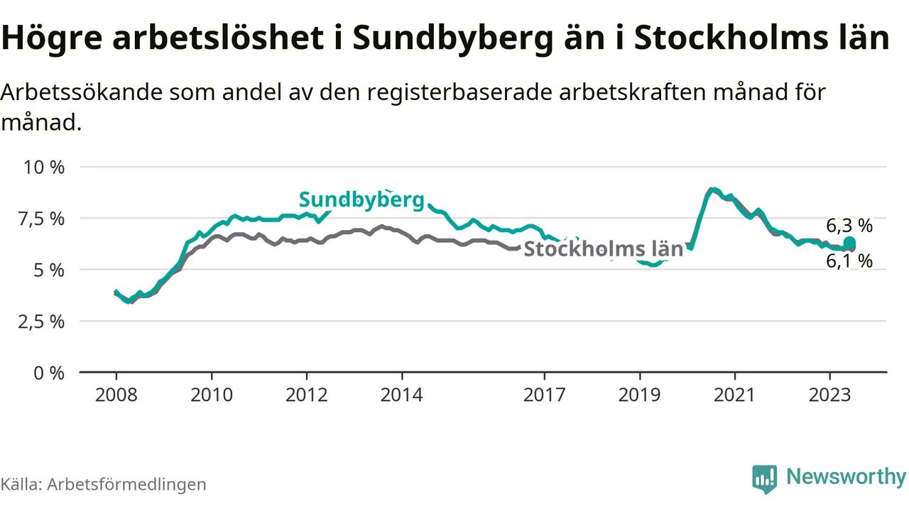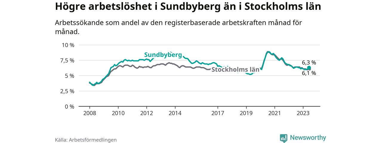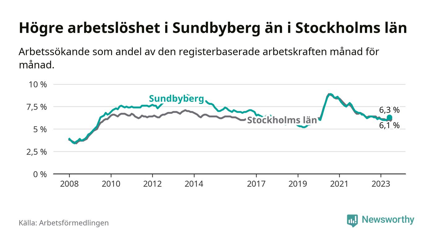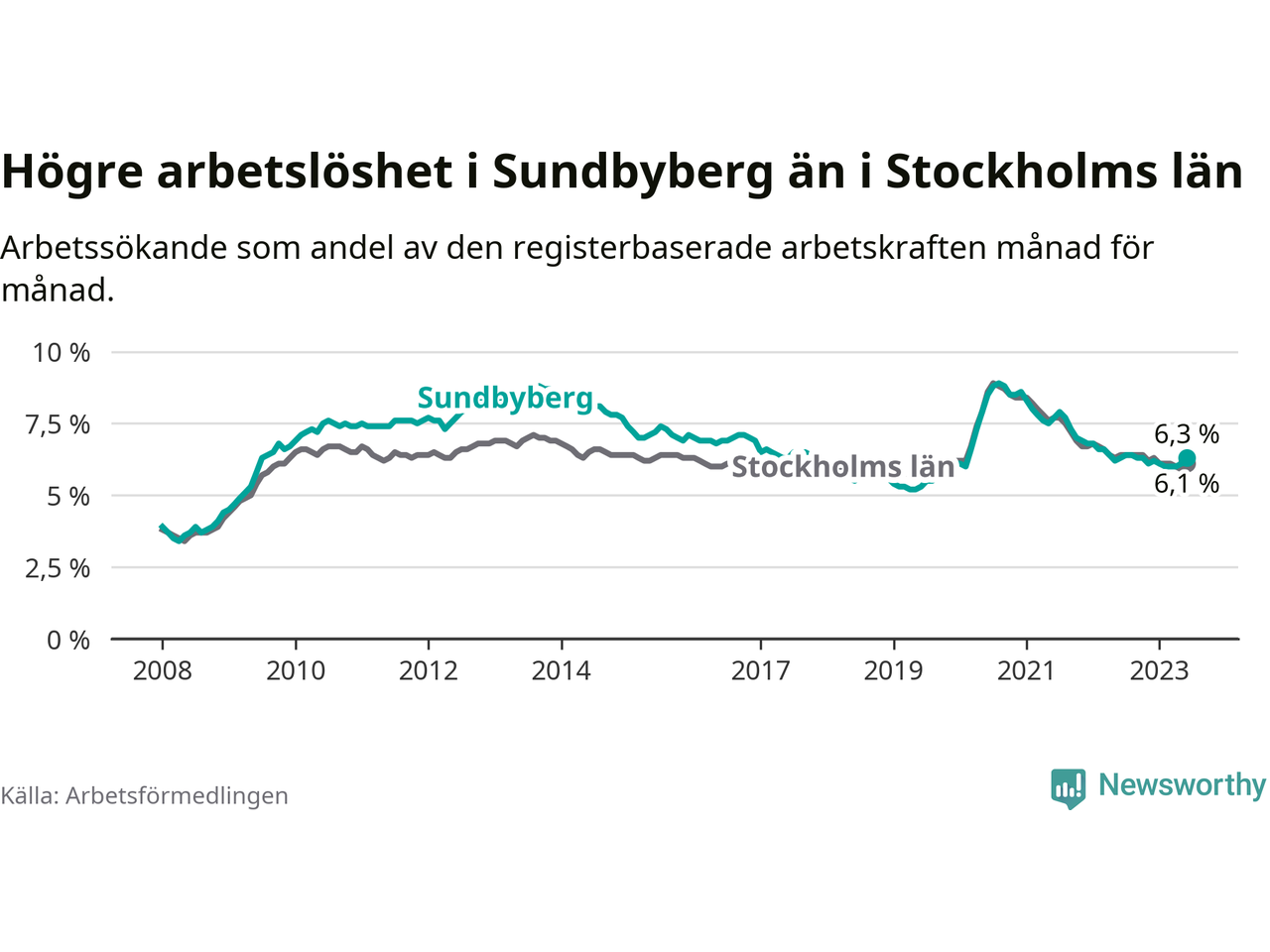 Sundbyberg går därmed mot strömmen i förhållande till andra kommuner i Stockholms län. I de flesta andra kommuner i länet går arbetslösheten nedåt. Störst är minskningen i Södertälje, där arbetslösheten sjunker med 1,2 procentenheter. I tabellen längre ner ser du utvecklingen i samtliga kommuner i länet.