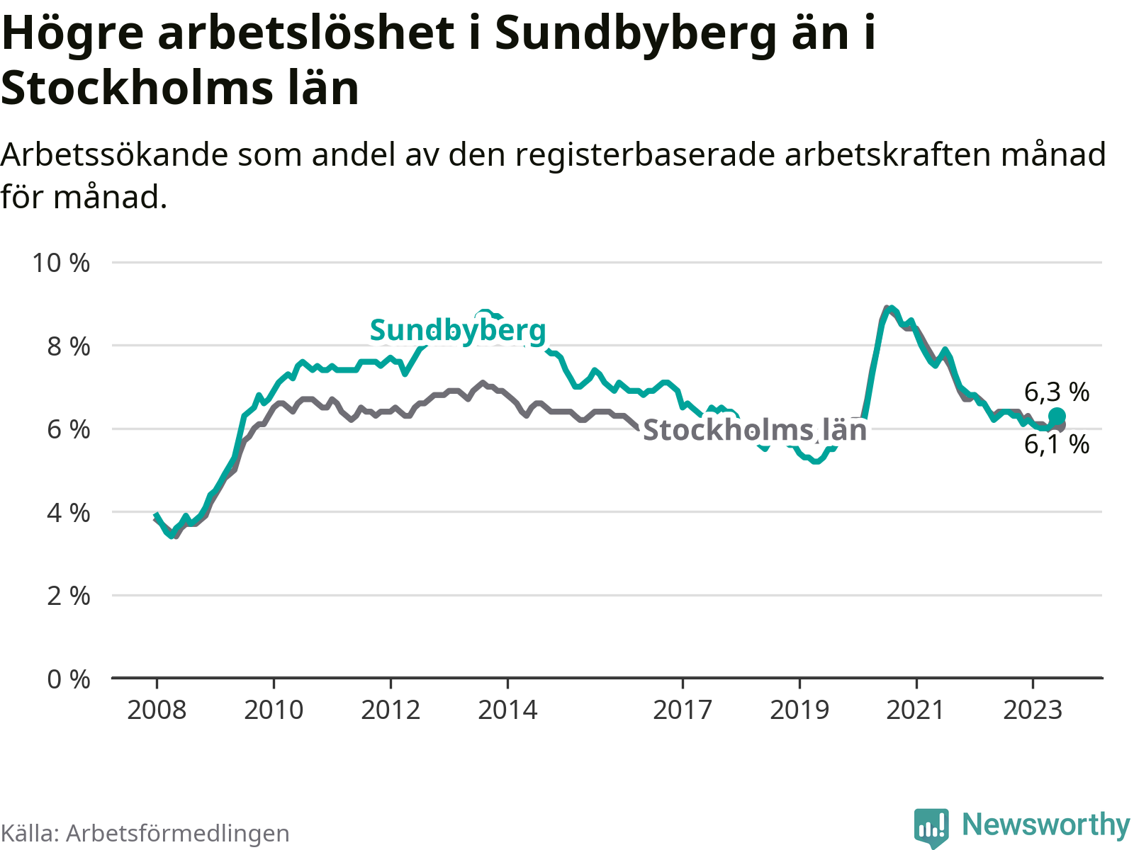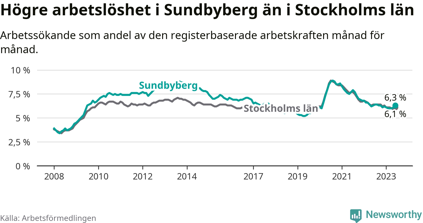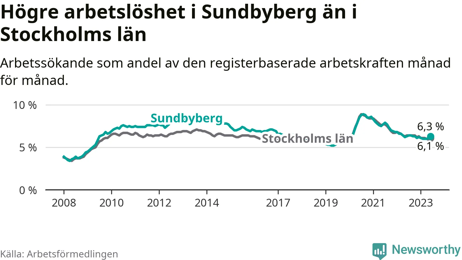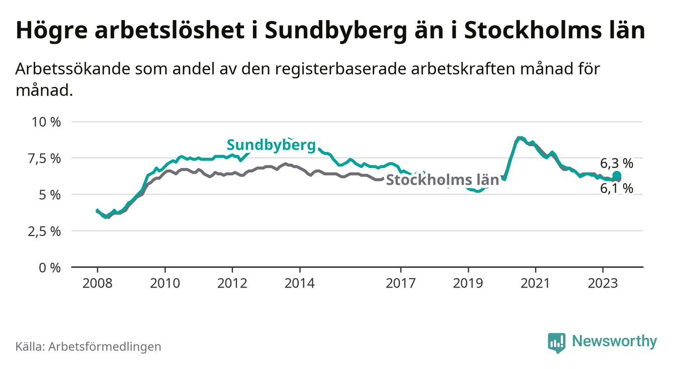 Sundbyberg går därmed mot strömmen i förhållande till andra kommuner i Stockholms län. I de flesta andra kommuner i länet går arbetslösheten nedåt. Störst är minskningen i Södertälje, där arbetslösheten sjunker med 1,2 procentenheter. I tabellen längre ner ser du utvecklingen i samtliga kommuner i länet.