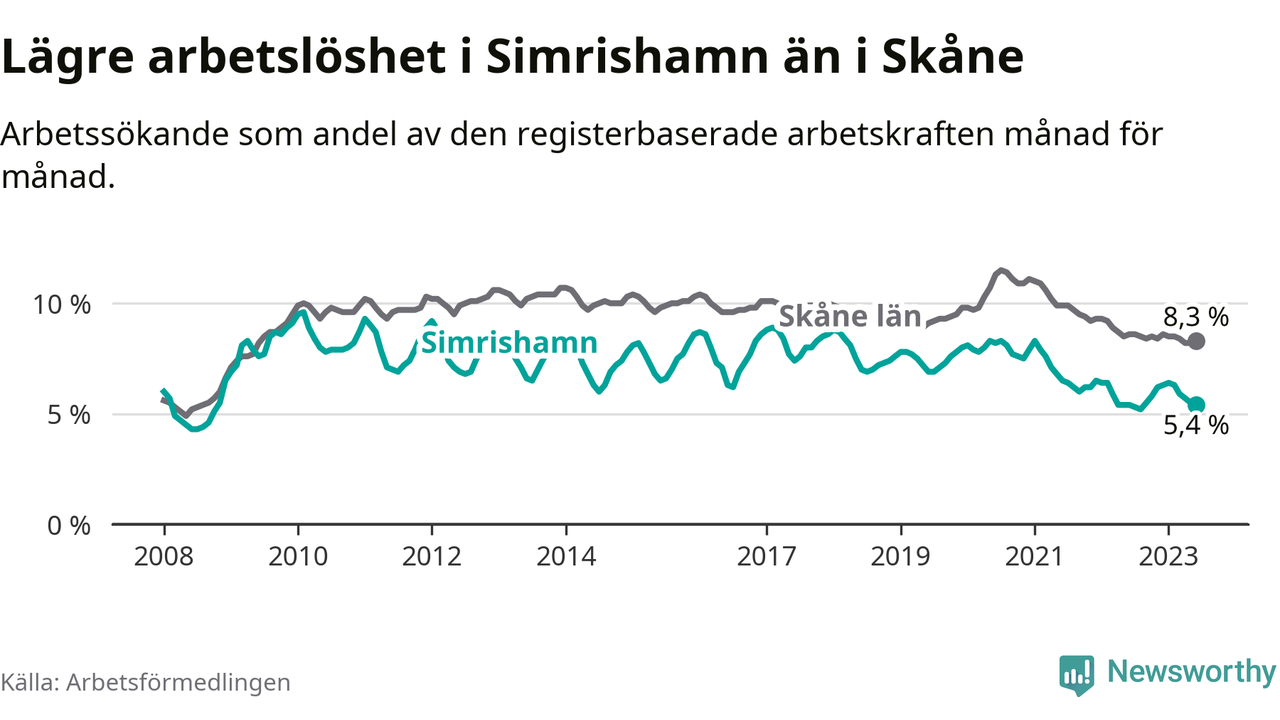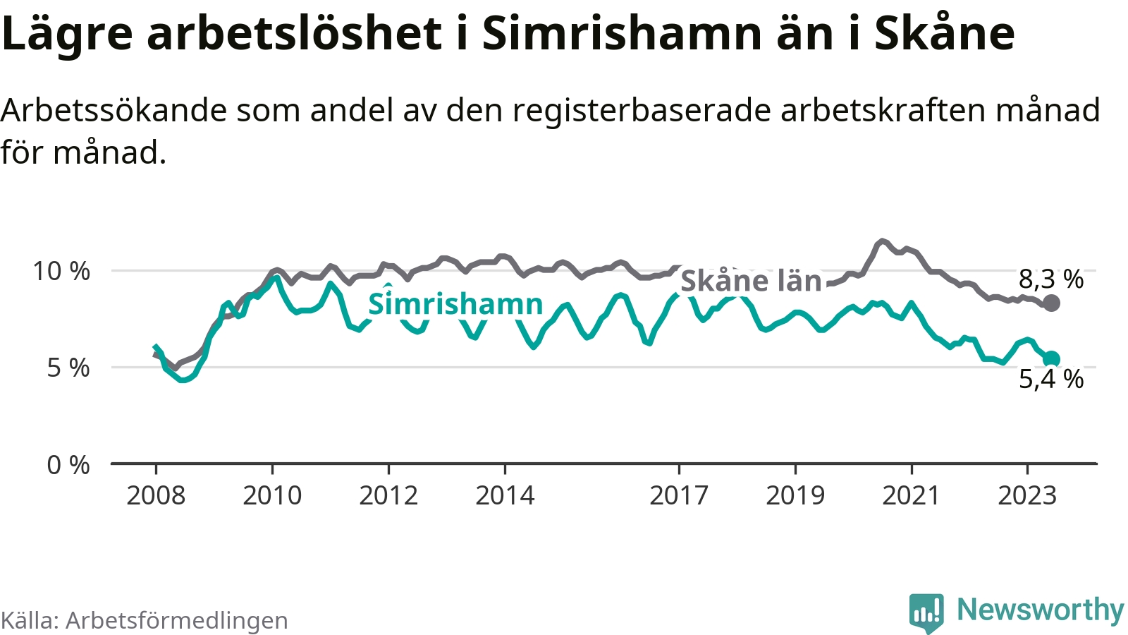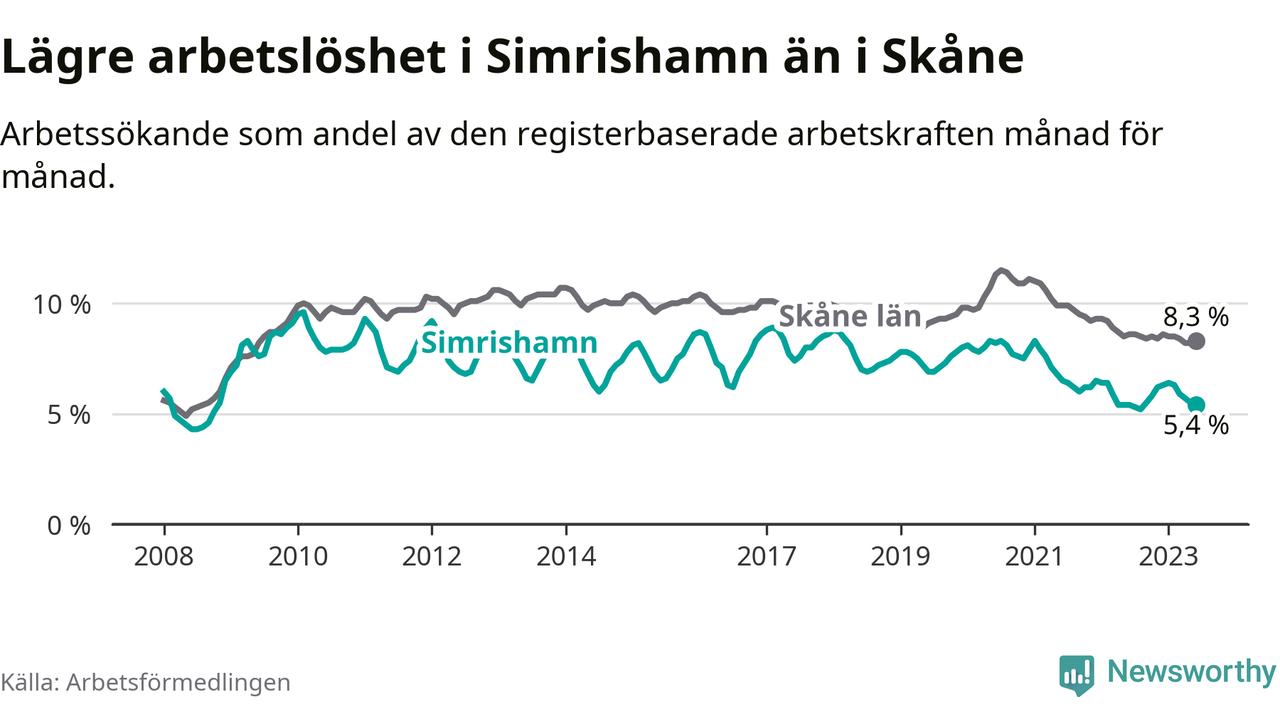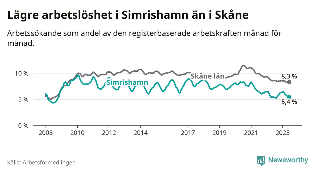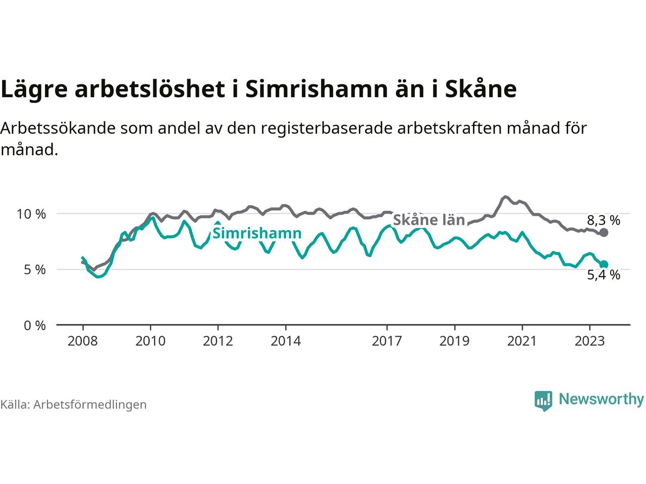 Ny statistik från Arbetsförmedlingen visar på en oförändrad i arbetslöshet i Simrishamns kommun. I Skåne däremot minskar arbetslösheten.