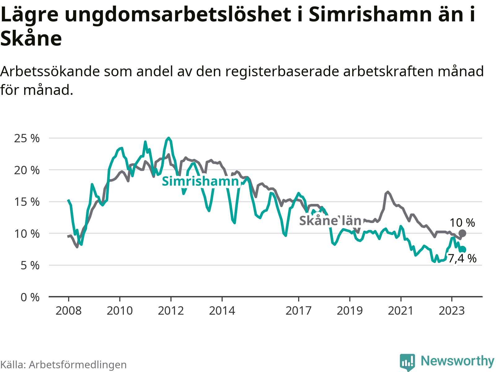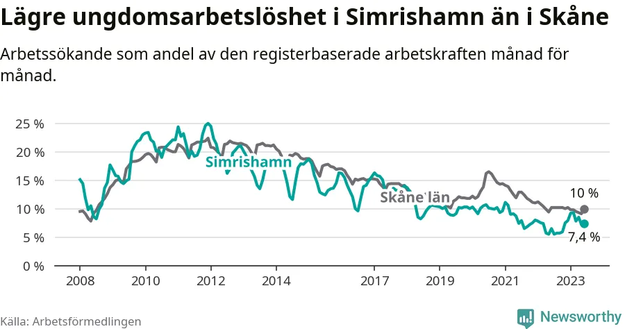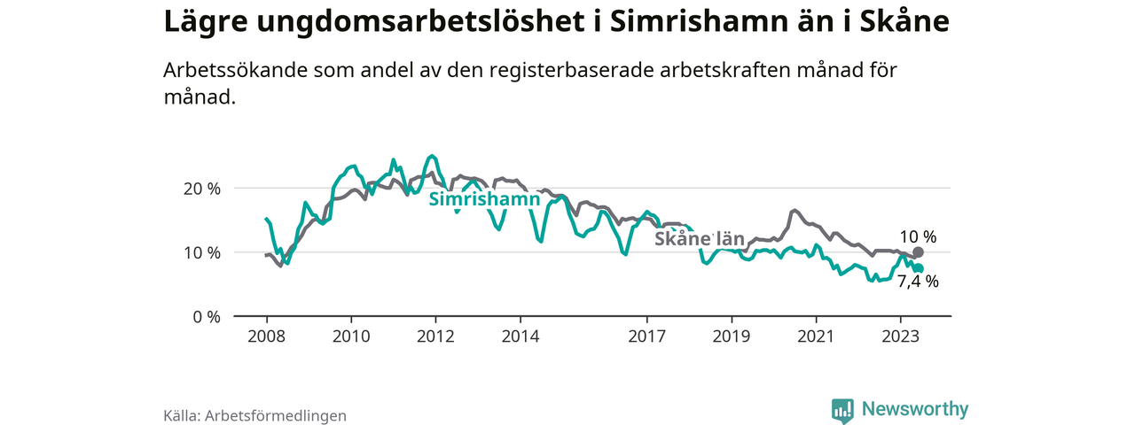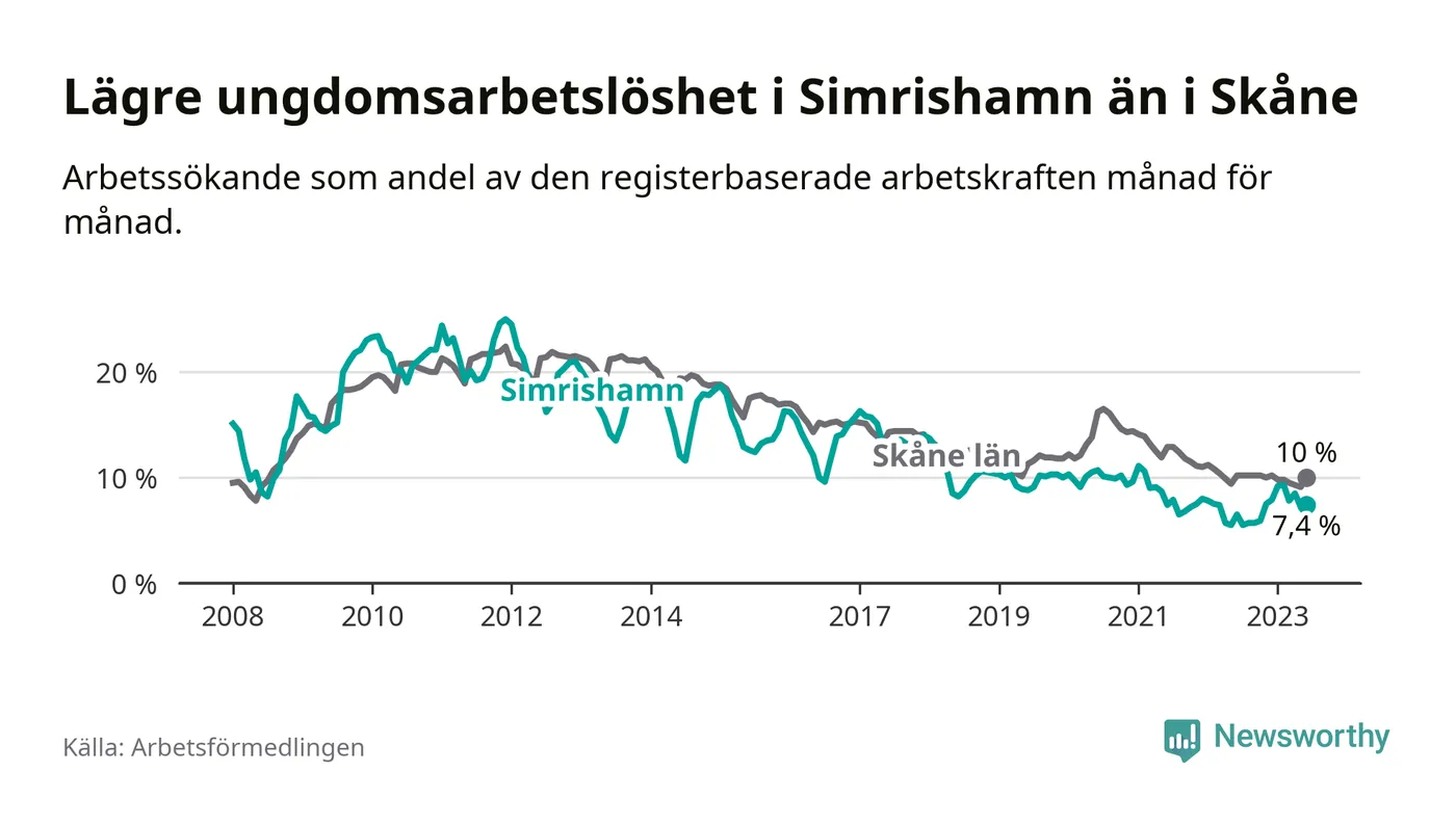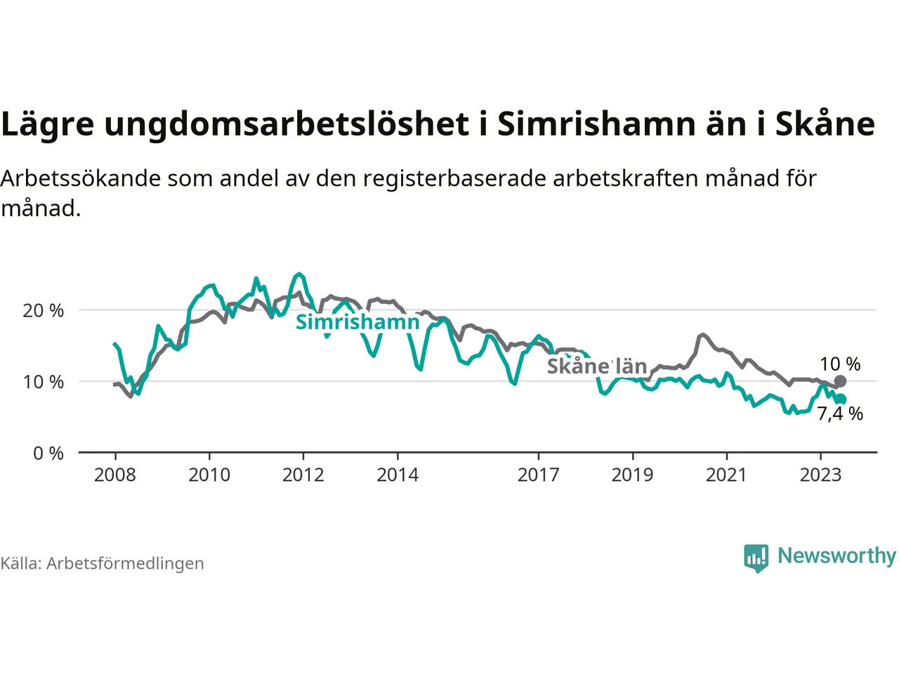 Precis som den totala arbetslösheten ligger ungdomsarbetslösheten i Simrishamn lägre än i Skåne som helhet. Skillnaden mellan kommunen och länet är 2,6 procentenheter.