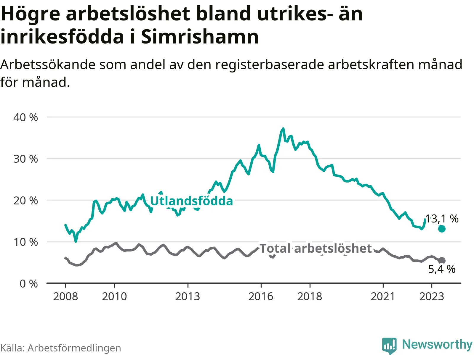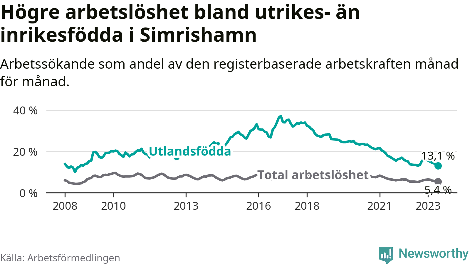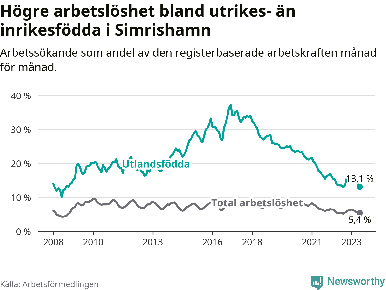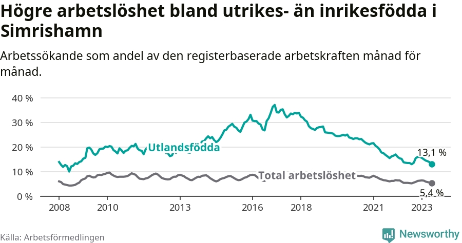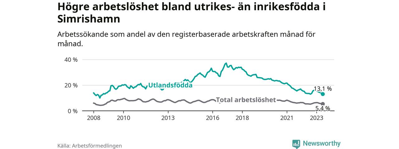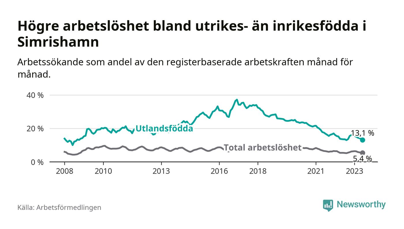Arbetslösheten bland utlandsfödda var 13,1 procent i Simrishamn under juni månad, motsvarande 165 av 1 260 personer. Det är 0,4 procentenheter färre än vid samma tidpunkt i fjol (+3 om man räknar personer). Den senaste månadens nedgång innebär ett trendbrott. Under de två föregående månaderna hade arbetslösheten bland utlandsfödda varit högre än motsvarande tidpunkt året innan.