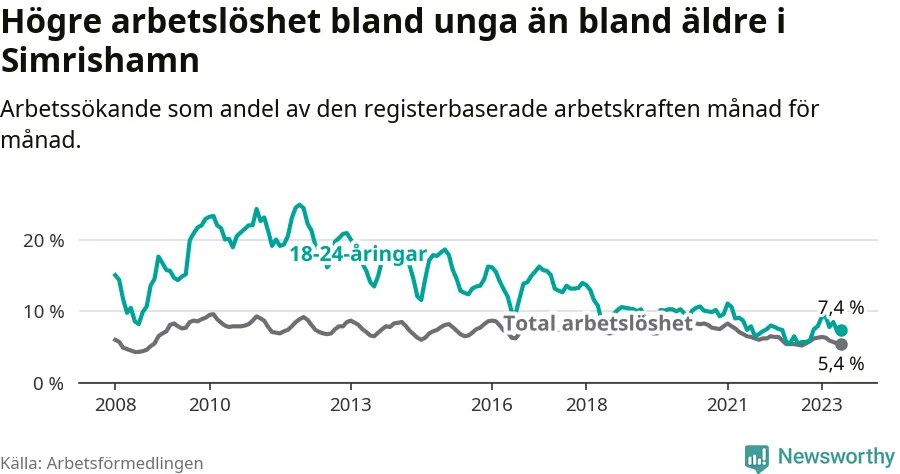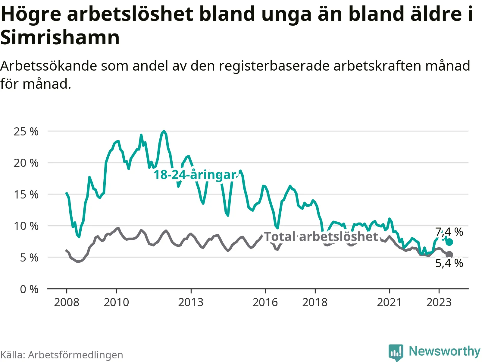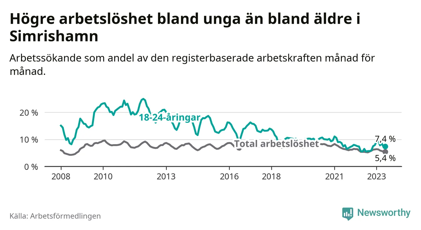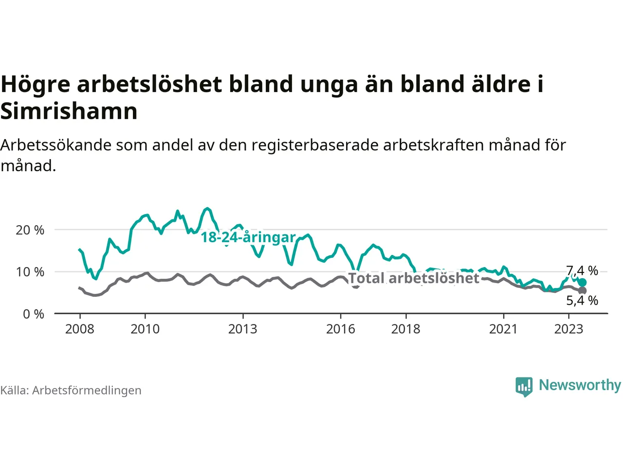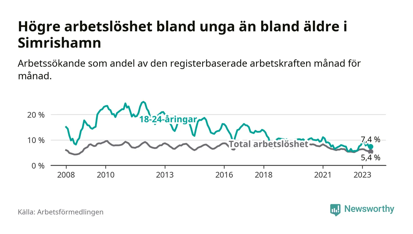 Till skillnad från den totala arbetslösheten stiger arbetslösheten bland unga (+0,9 procentenheter). I juni var 7,4 procent av 18–24-åringarna inskrivna som arbetssökande (motsvarande 53 personer). Mäter vi antalet inskrivna ser vi en ökning med sju personer på ett års sikt.