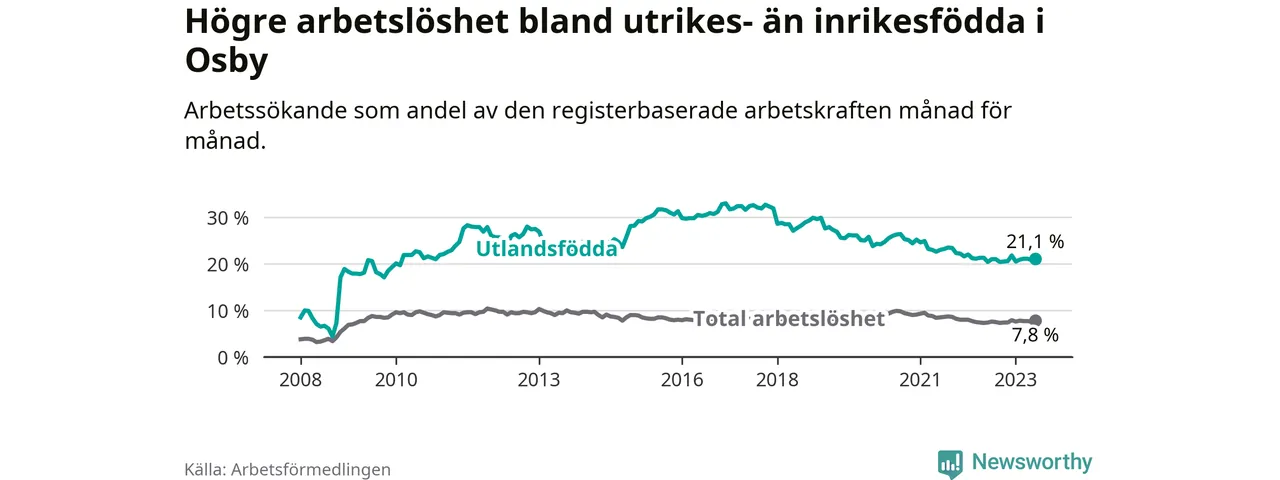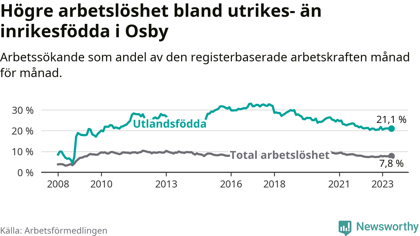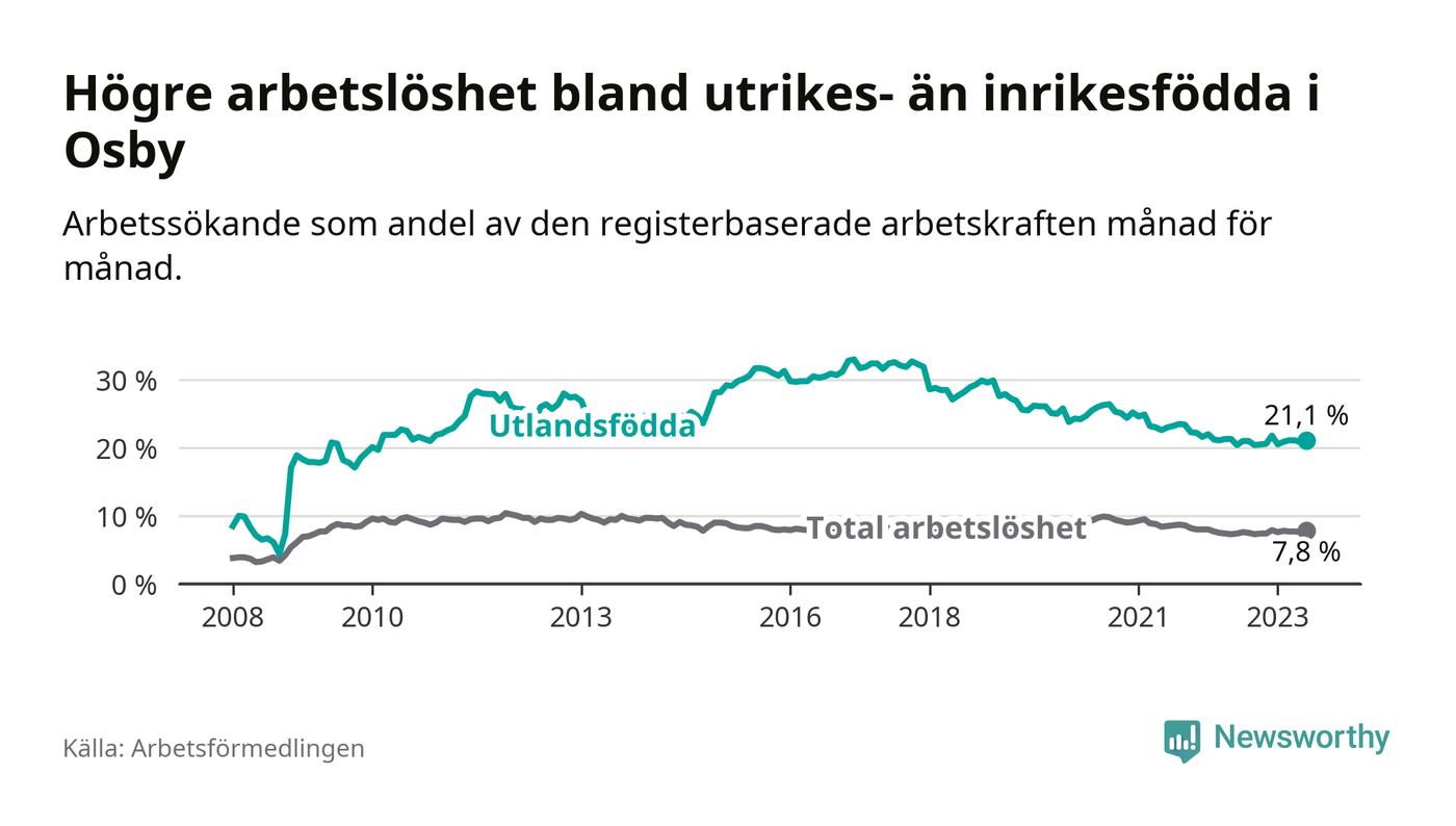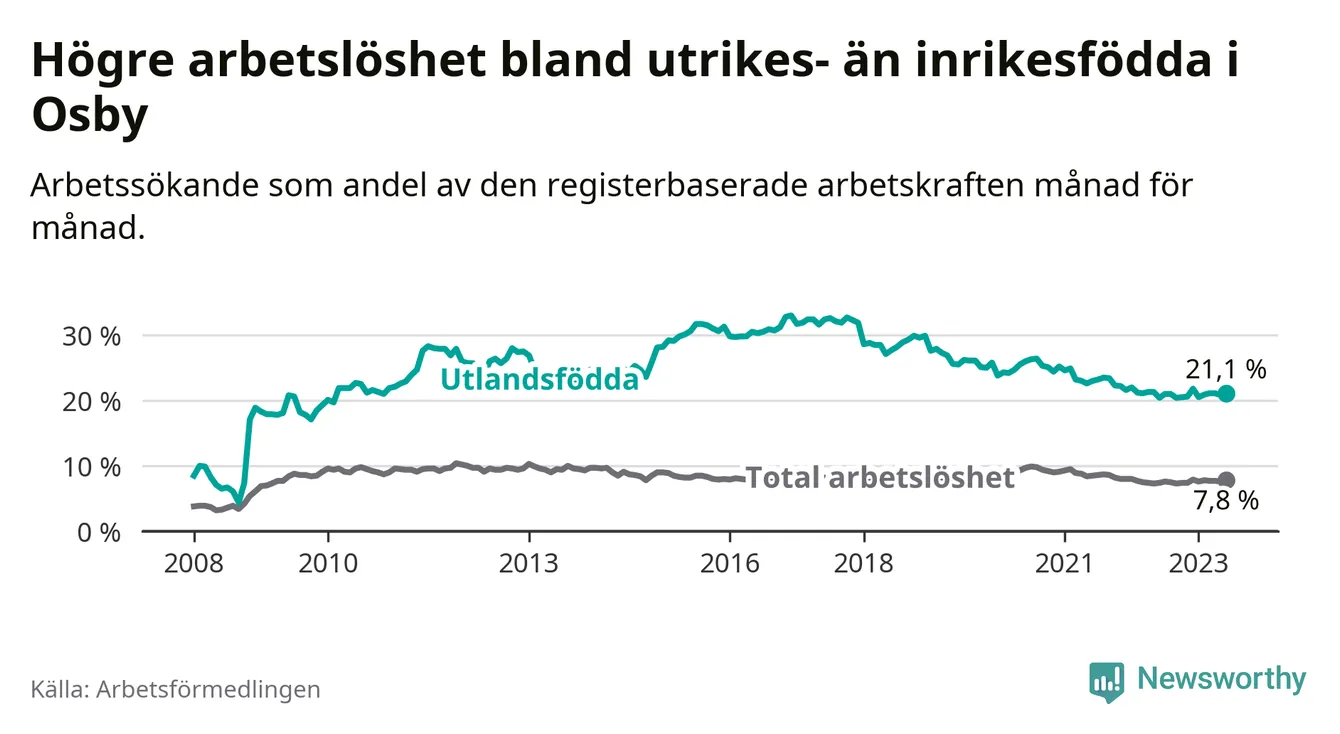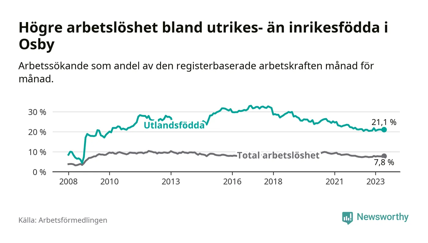 Skillnaden i arbetslöshet mellan utrikesfödda och hela befolkningen är 13,3 procentenheter i Osby.