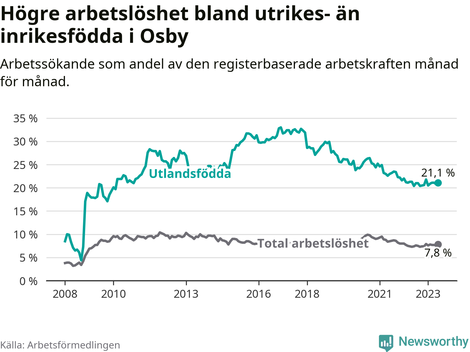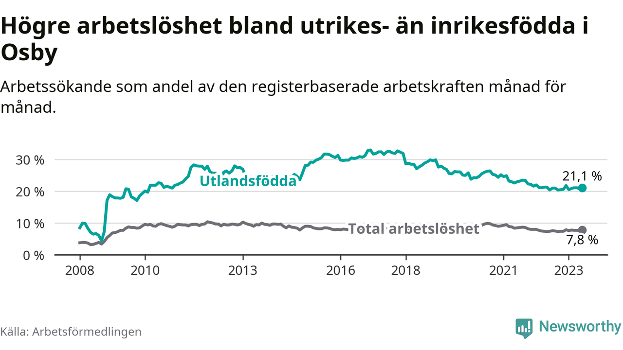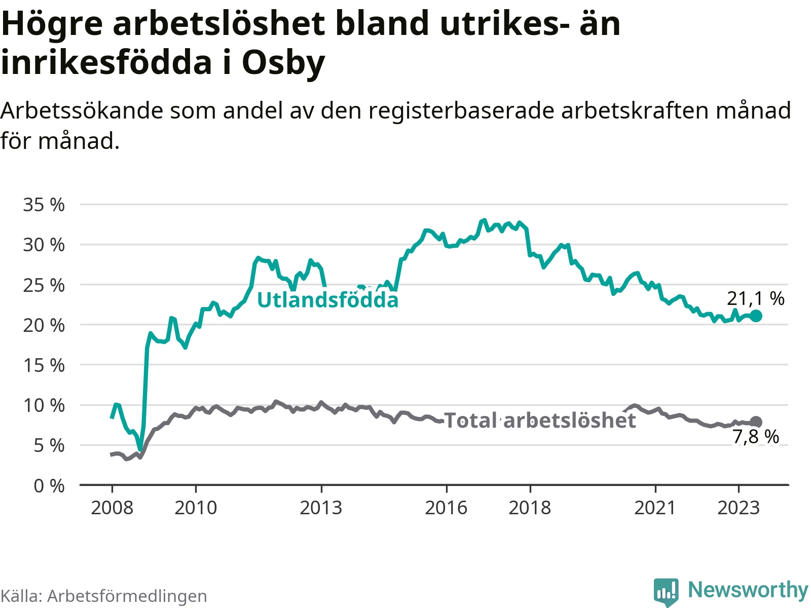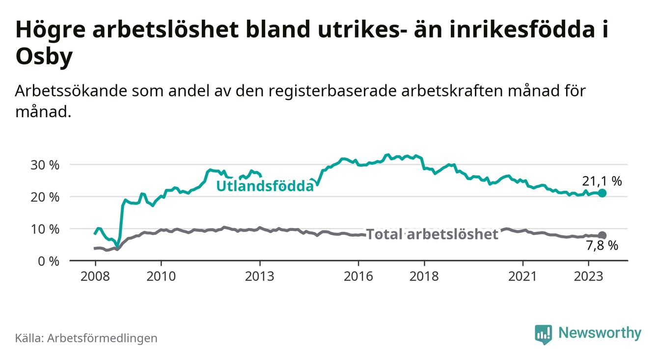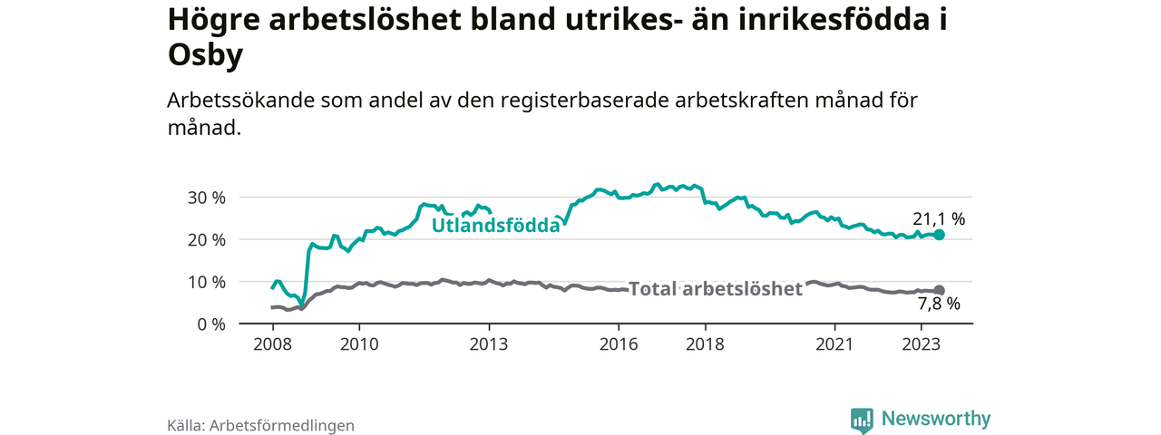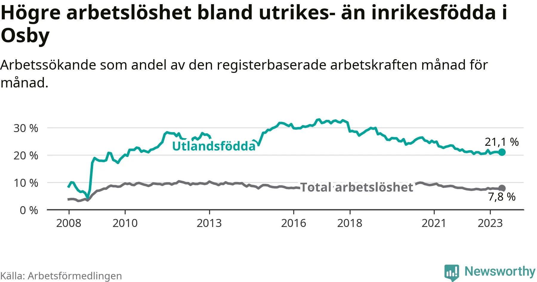 Skillnaden i arbetslöshet mellan utrikesfödda och hela befolkningen är 13,3 procentenheter i Osby.