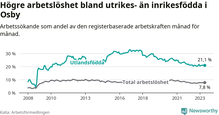 Arbetslösheten bland utlandsfödda var 21,1 procent i Osby under juni månad, motsvarande 277 av 1 313 personer. Det är 0,7 procentenheter fler än vid samma tidpunkt i fjol (+32 om man räknar personer). Den senaste månadens uppgång innebär ett trendbrott. Under de två föregående månaderna hade arbetslösheten bland utlandsfödda varit lägre än motsvarande tidpunkt året innan.