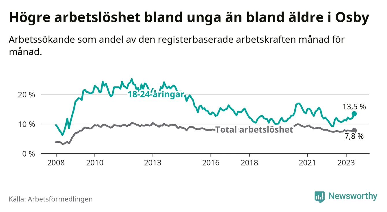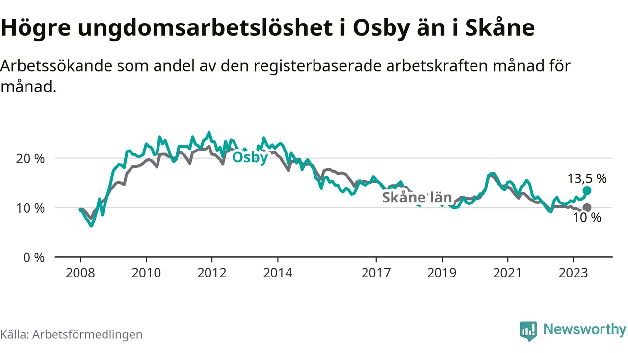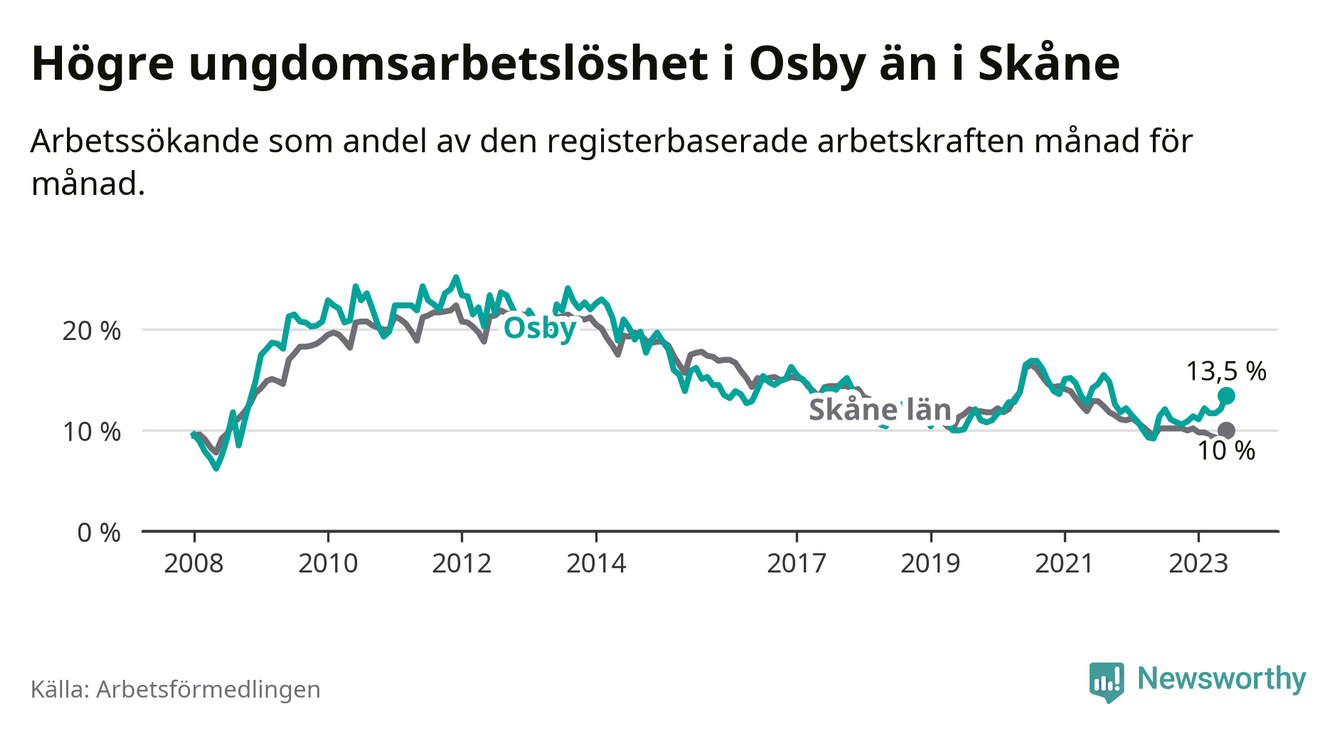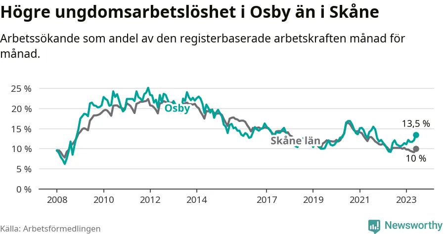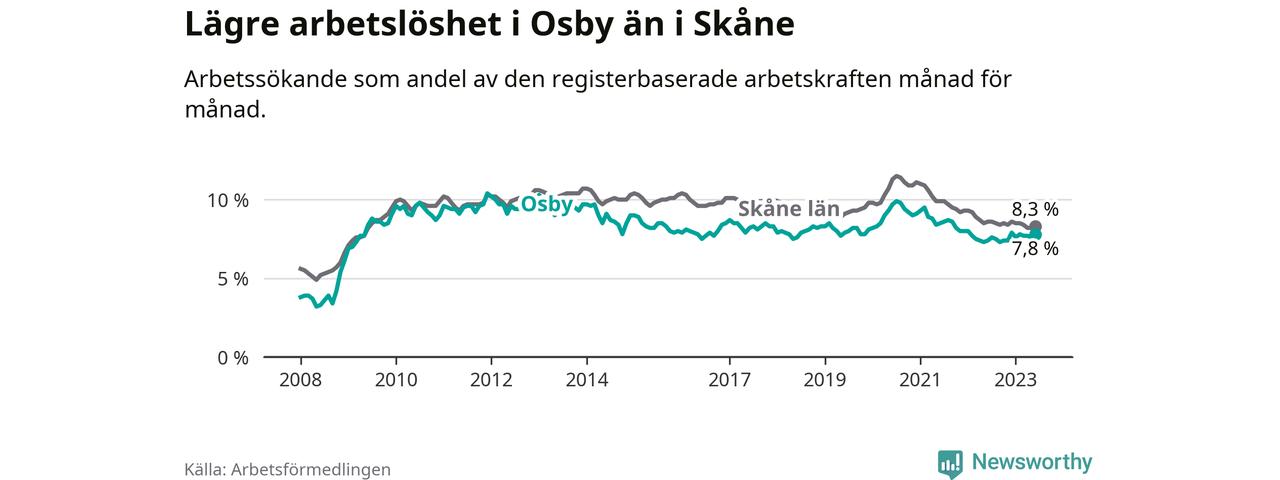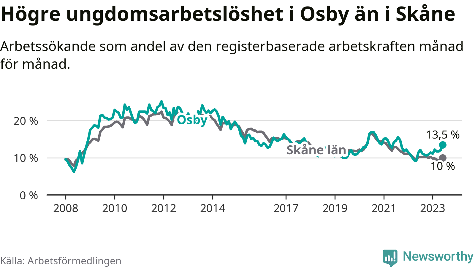 Medan Osby har lägre total arbetslöshet än Skåne, ligger ungdomsarbetslösheten 3,5 procentenheter högre i Osby.