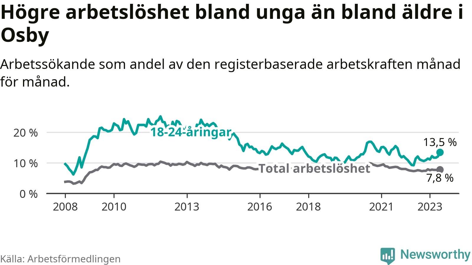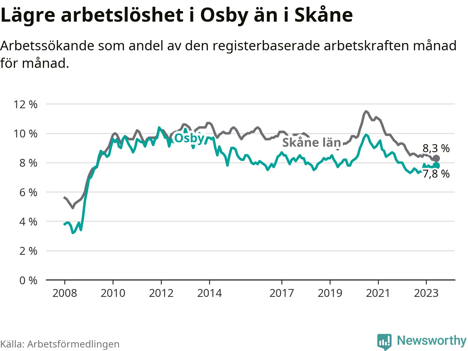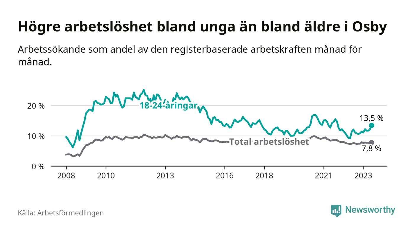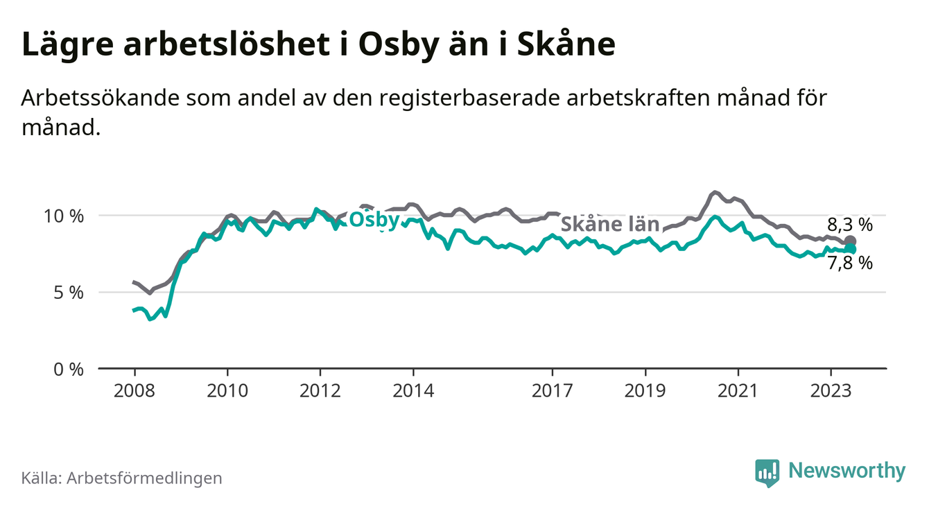 Medan Osby har lägre total arbetslöshet än Skåne, ligger ungdomsarbetslösheten 3,5 procentenheter högre i Osby.