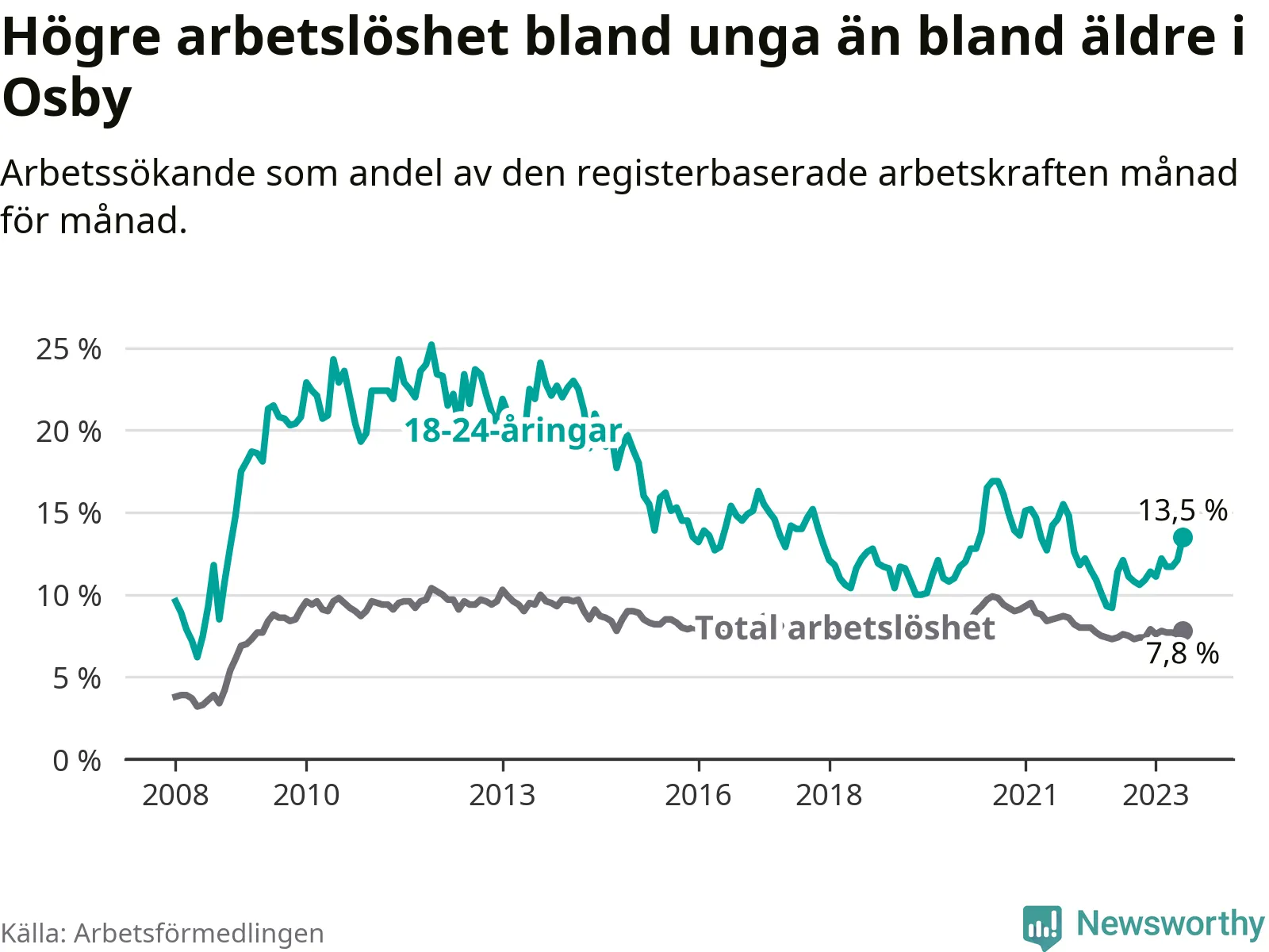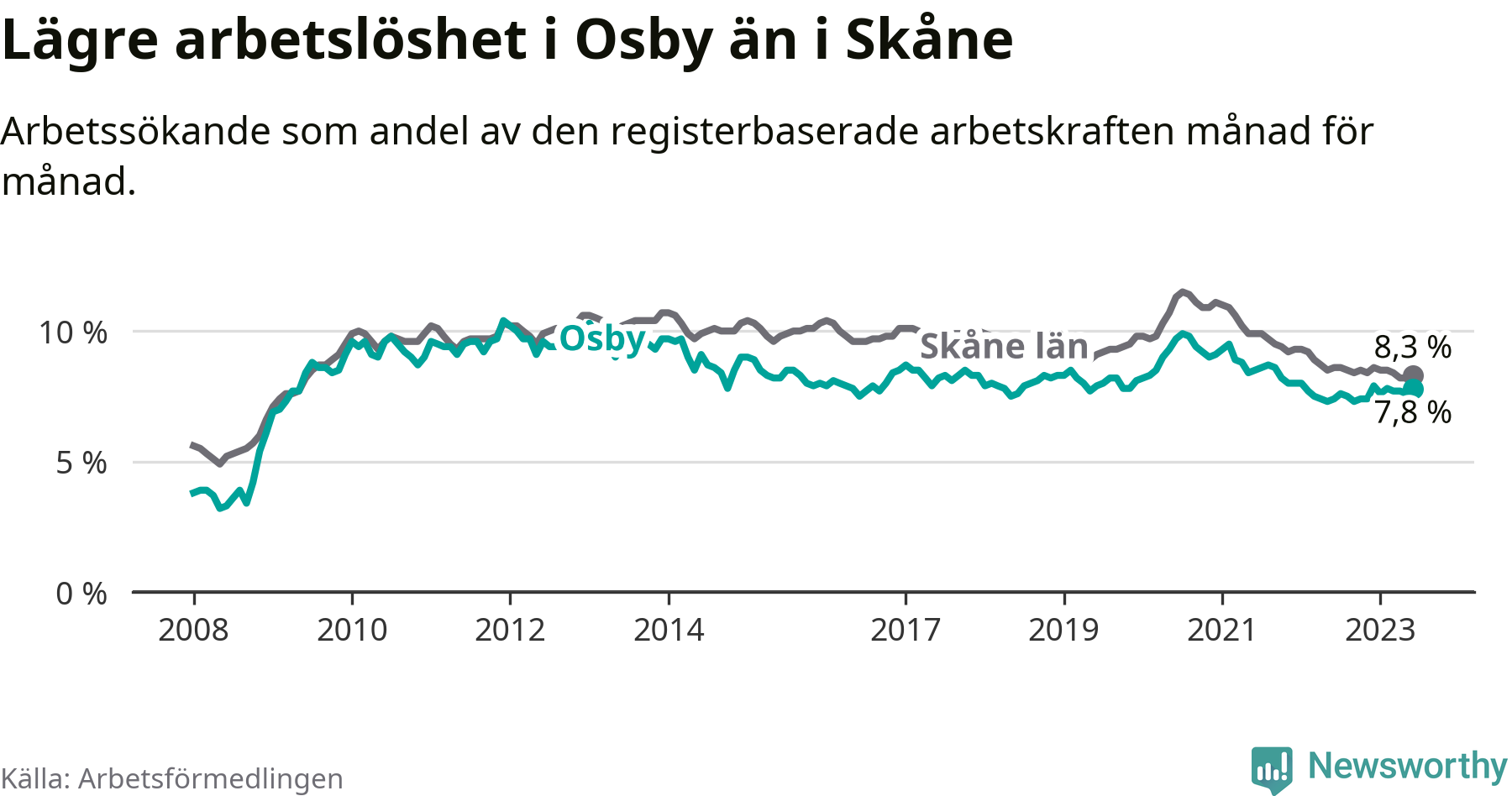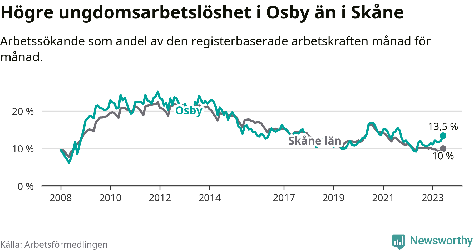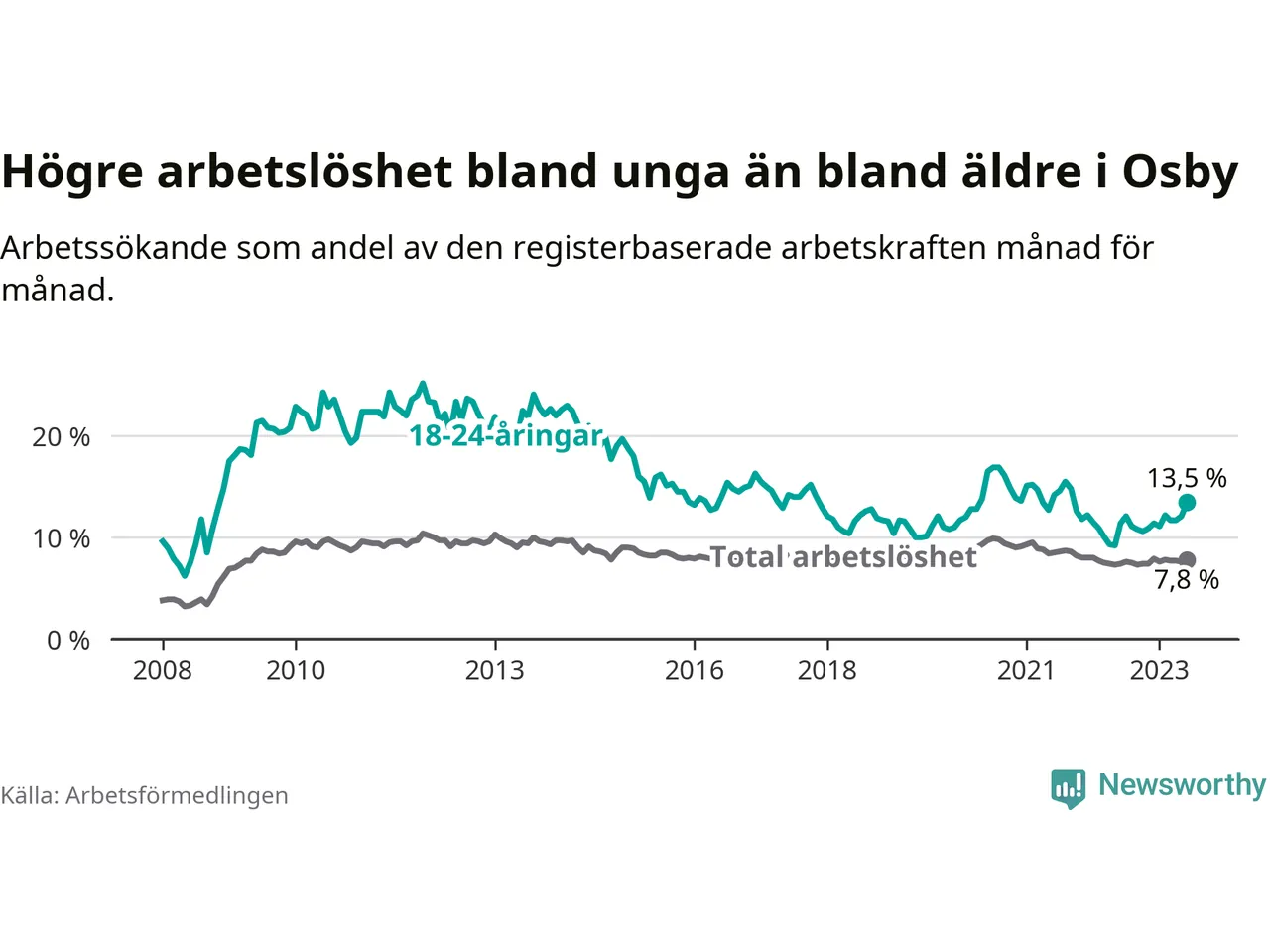 Medan Osby har lägre total arbetslöshet än Skåne, ligger ungdomsarbetslösheten 3,5 procentenheter högre i Osby.