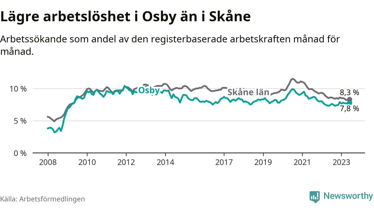 Under juni månad rapporterade Osby kommun en total arbetslöshet på 7,8 procent. Det är en ökning jämfört med samma tidpunkt i fjol (+0,4 procentenheter). I Skåne län däremot sjunker arbetslösheten .