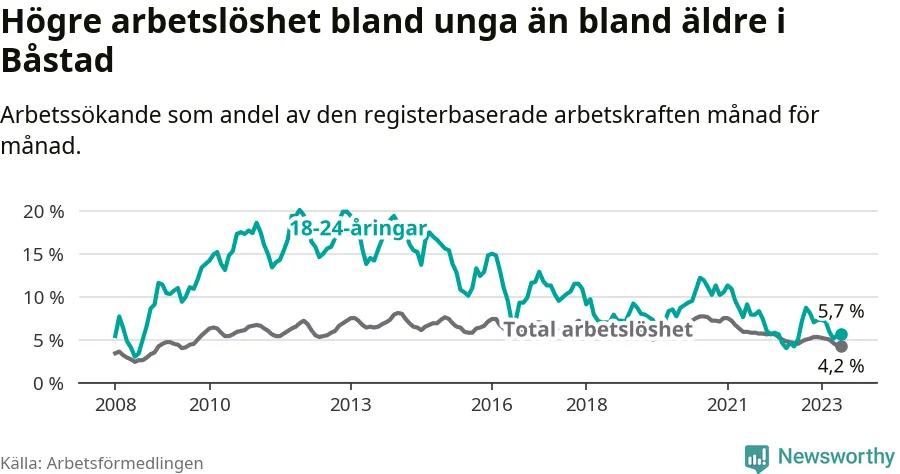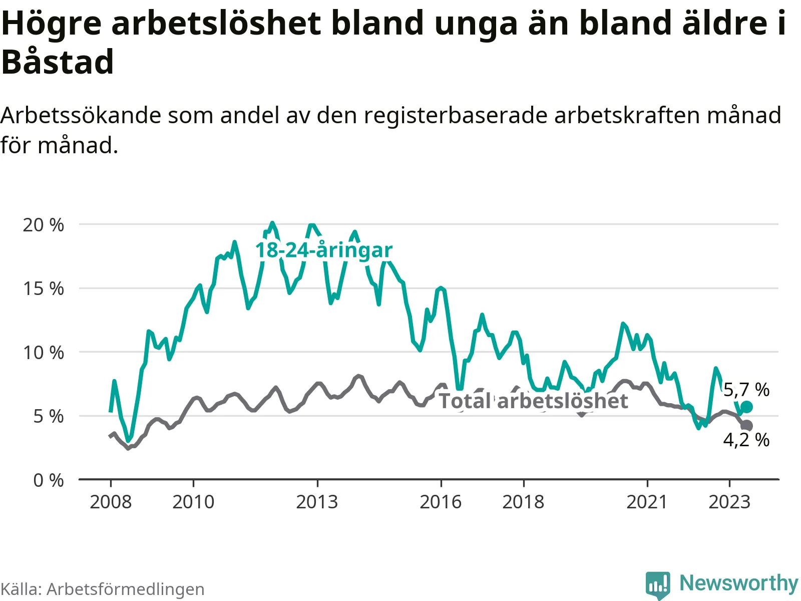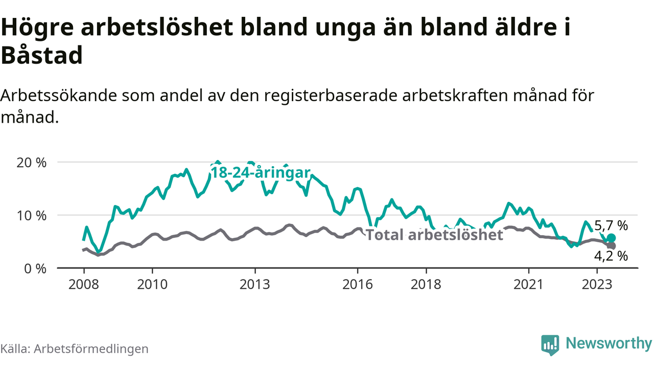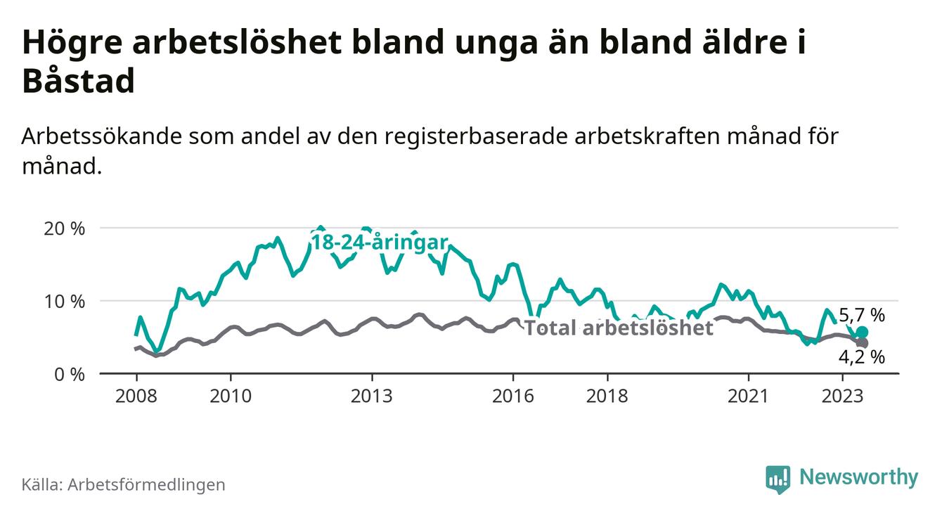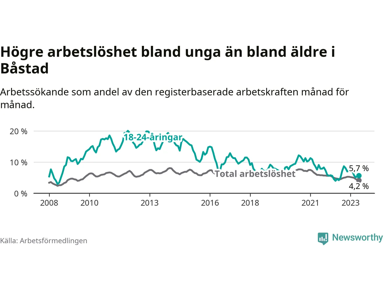 I och med den senaste månadens uppgång har de ungas arbetslöshet i Båstad stigit tio månader i följd (upp från 7,2 procent i augusti 2022 till 5,7 procent nu).