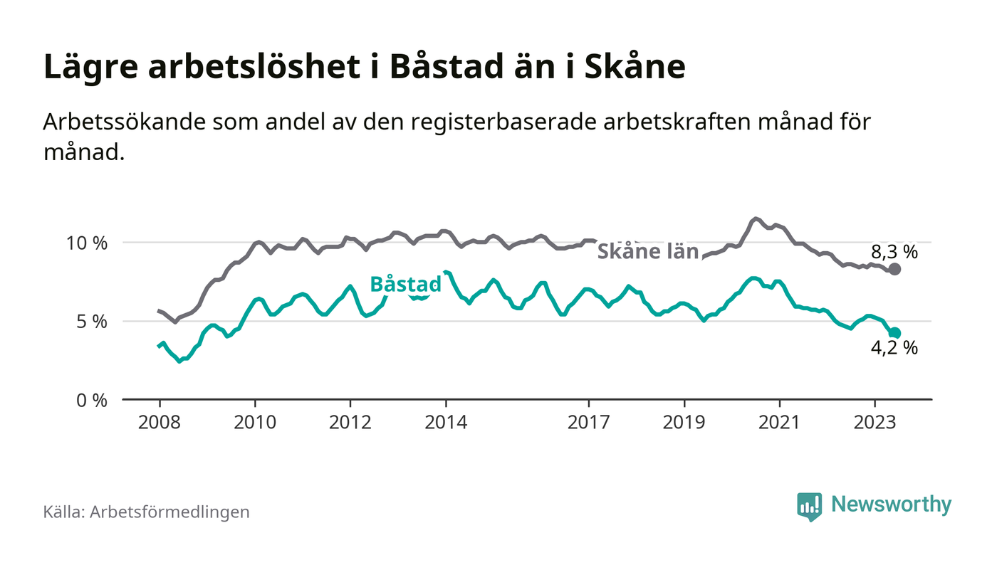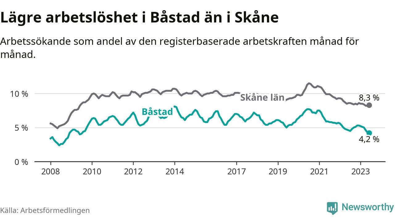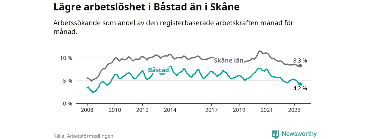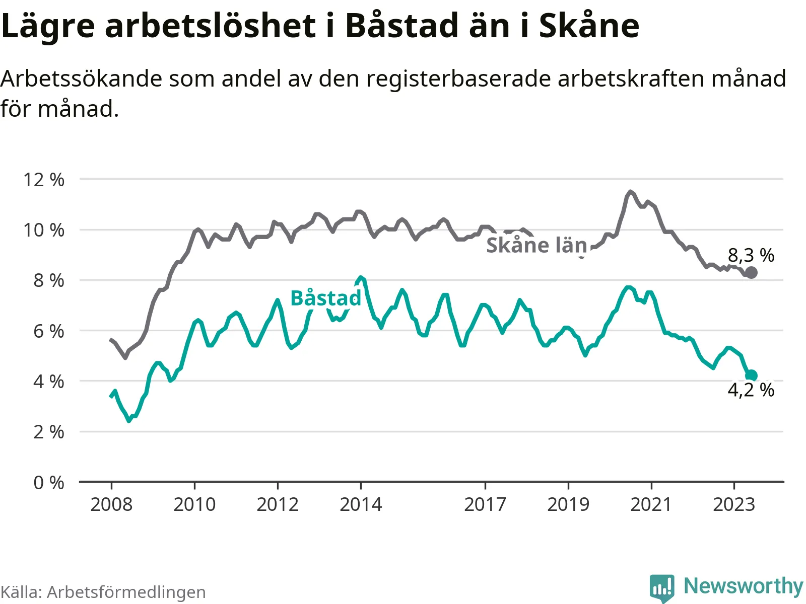 Under juni månad rapporterade Båstads kommun en total arbetslöshet på 4,2 procent. Det är en minskning jämfört med samma tidpunkt i fjol (−0,4 procentenheter). Även i Skåne län sjunker arbetslösheten .