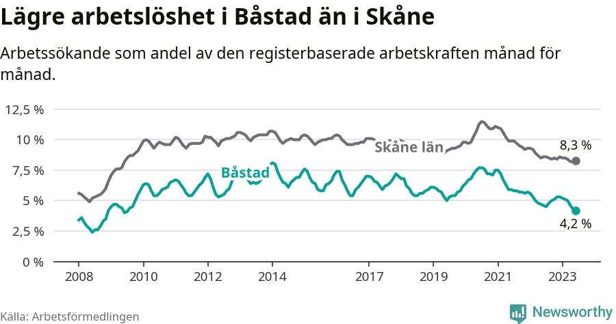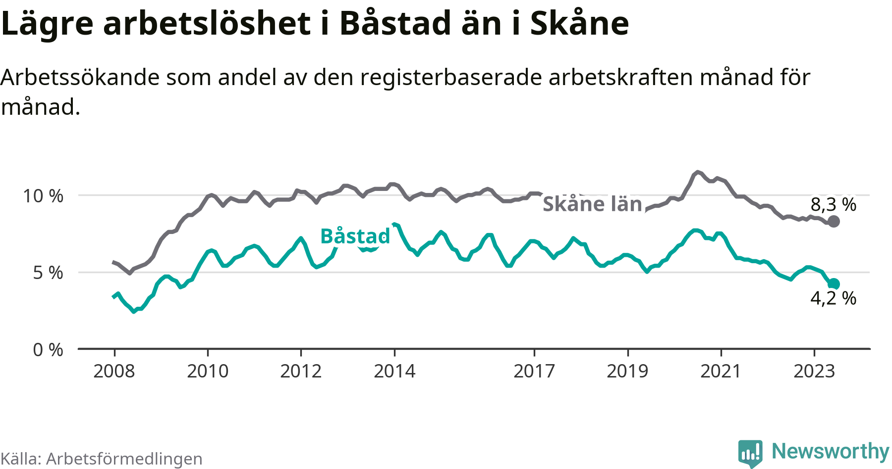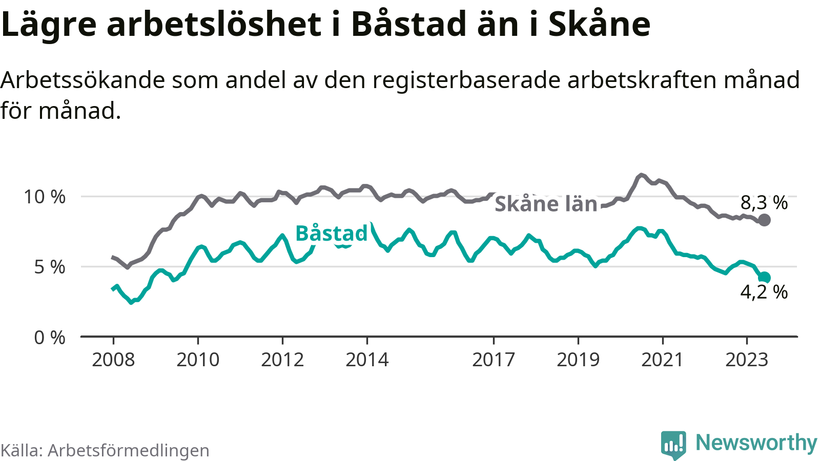 Under juni månad rapporterade Båstads kommun en total arbetslöshet på 4,2 procent. Det är en minskning jämfört med samma tidpunkt i fjol (−0,4 procentenheter). Även i Skåne län sjunker arbetslösheten .
