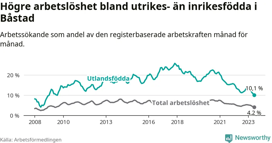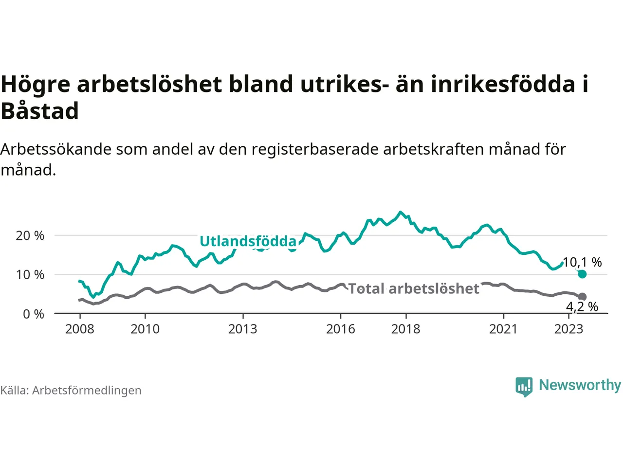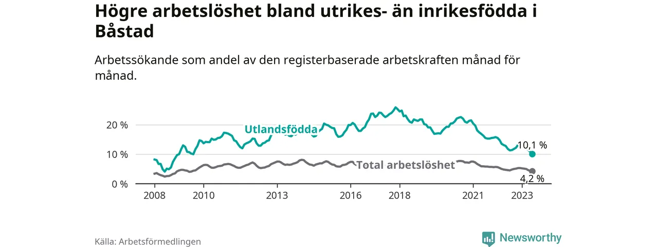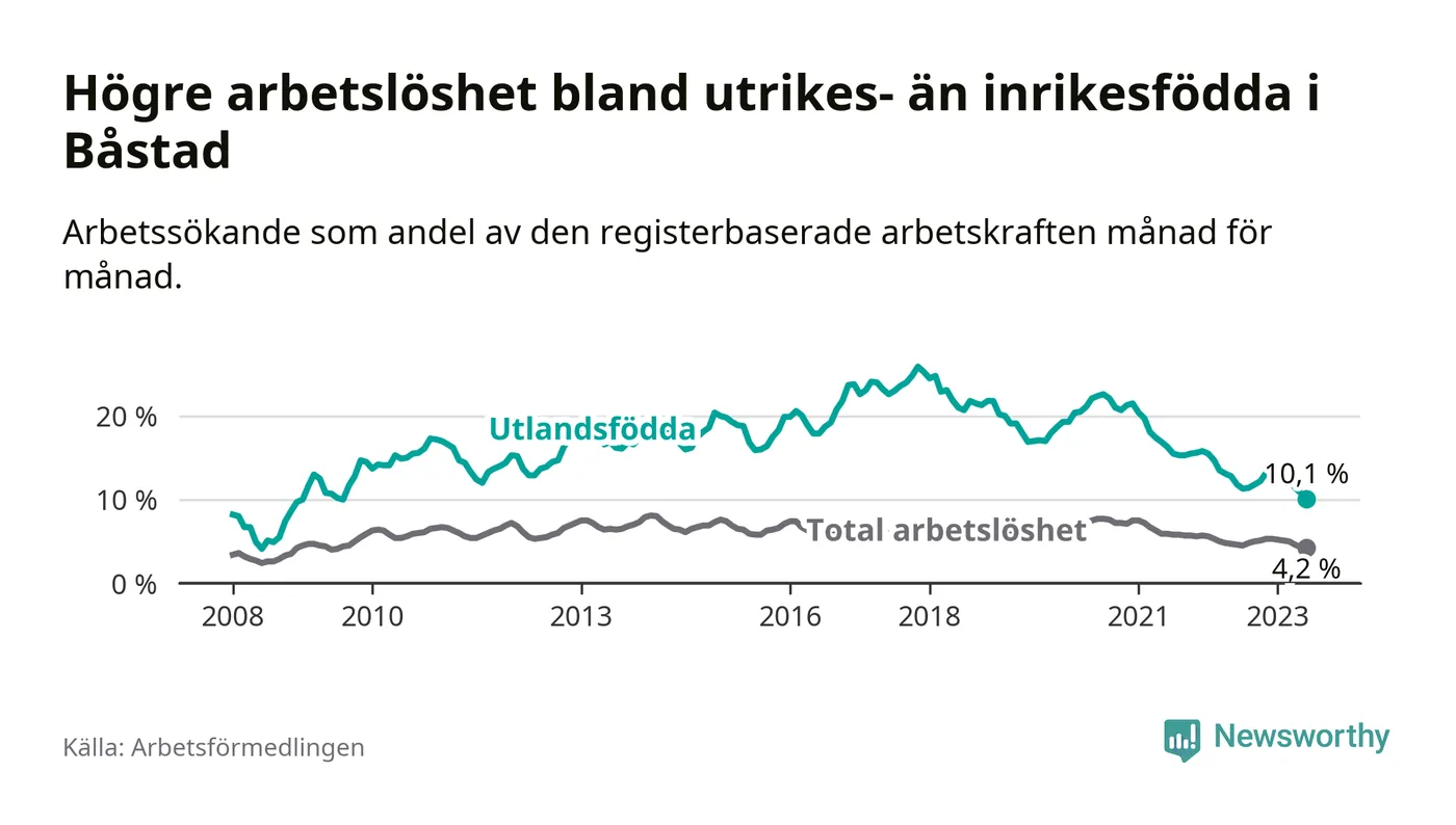 Arbetslösheten bland utlandsfödda var 10,1 procent i Båstad under juni månad, motsvarande 119 av 1 178 personer. Det är 1,7 procentenheter färre än vid samma tidpunkt i fjol (−12 om man räknar personer). Därmed har de utlandsföddas arbetslöshet varit lägre än vid samma tidpunkt i fjol i över två år i sträck. Sedan januari 2021 har arbetslösheten bland utlandsfödda minskat från 20,4 till 10,1 procent. Den nuvarande arbetslöshetsnivån är den lägsta sedan augusti 2009.