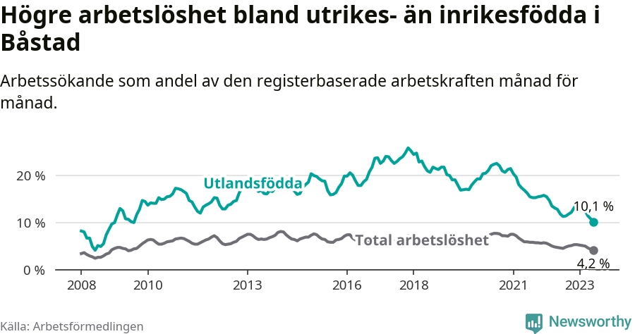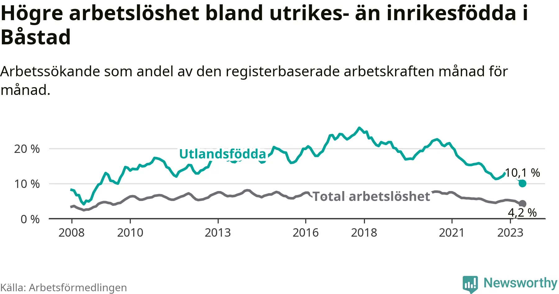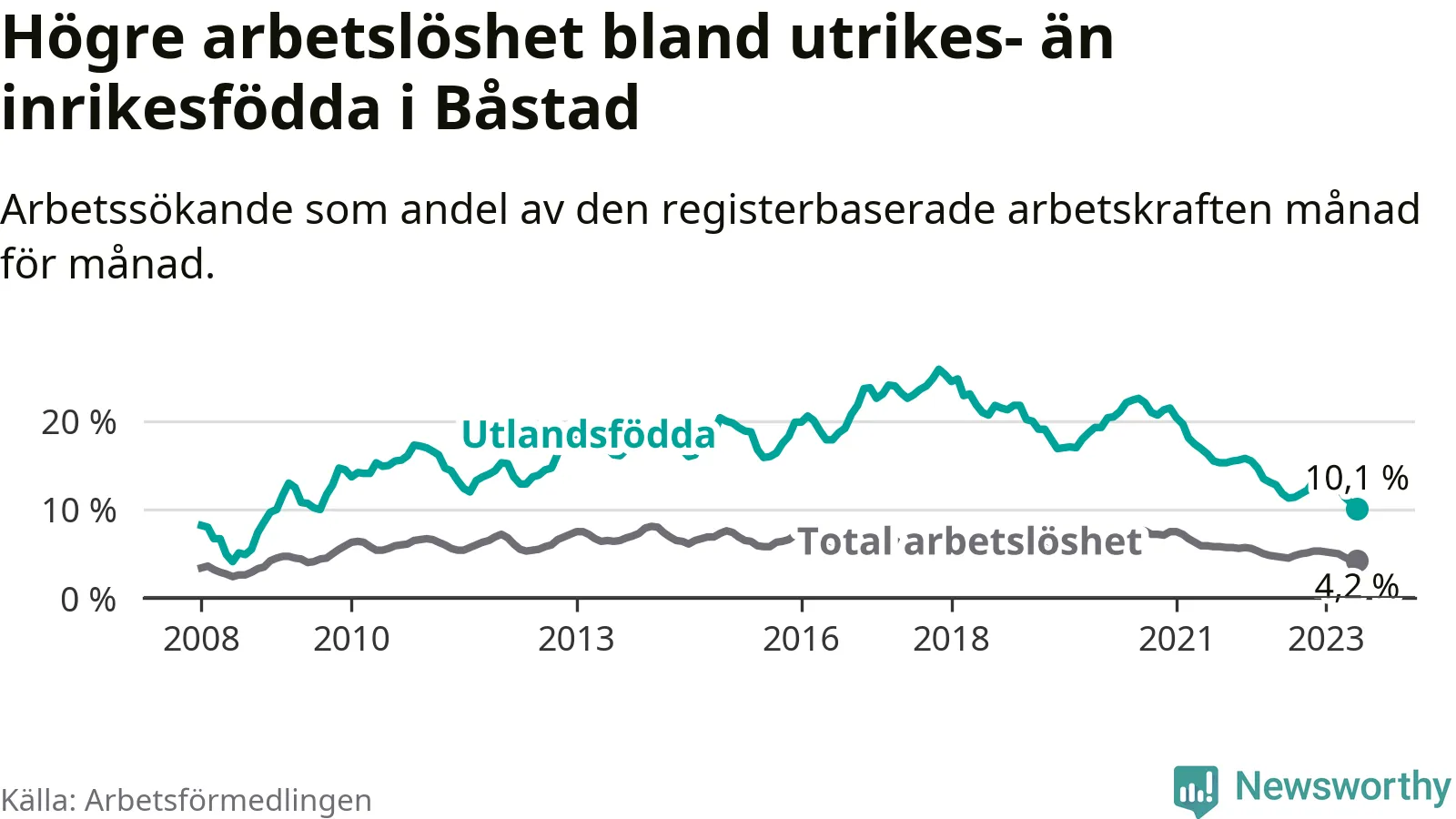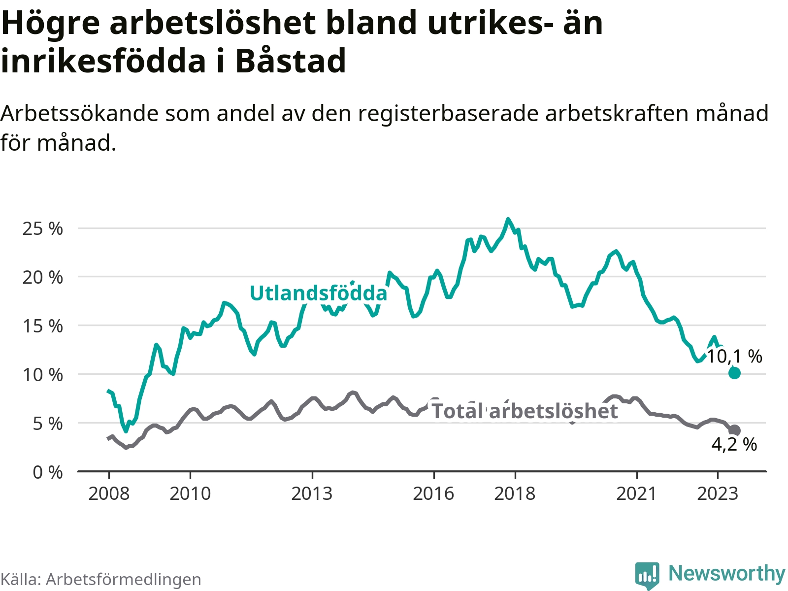 Arbetslösheten bland utlandsfödda var 10,1 procent i Båstad under juni månad, motsvarande 119 av 1 178 personer. Det är 1,7 procentenheter färre än vid samma tidpunkt i fjol (−12 om man räknar personer). Därmed har de utlandsföddas arbetslöshet varit lägre än vid samma tidpunkt i fjol i över två år i sträck. Sedan januari 2021 har arbetslösheten bland utlandsfödda minskat från 20,4 till 10,1 procent. Den nuvarande arbetslöshetsnivån är den lägsta sedan augusti 2009.