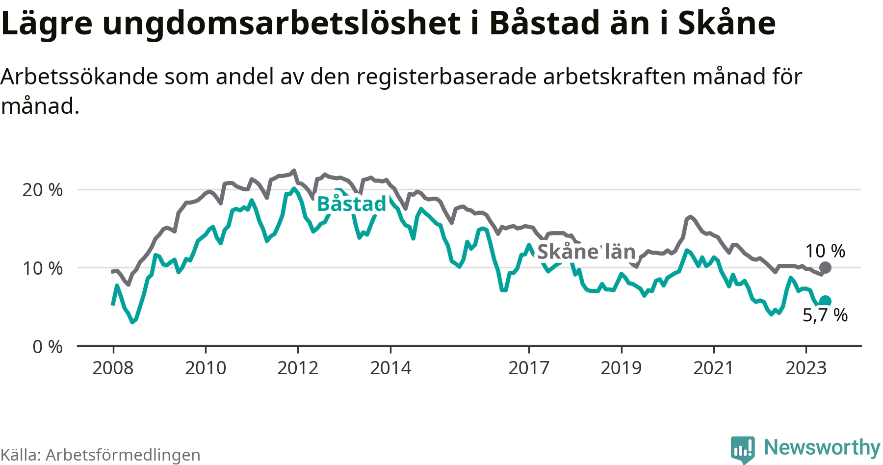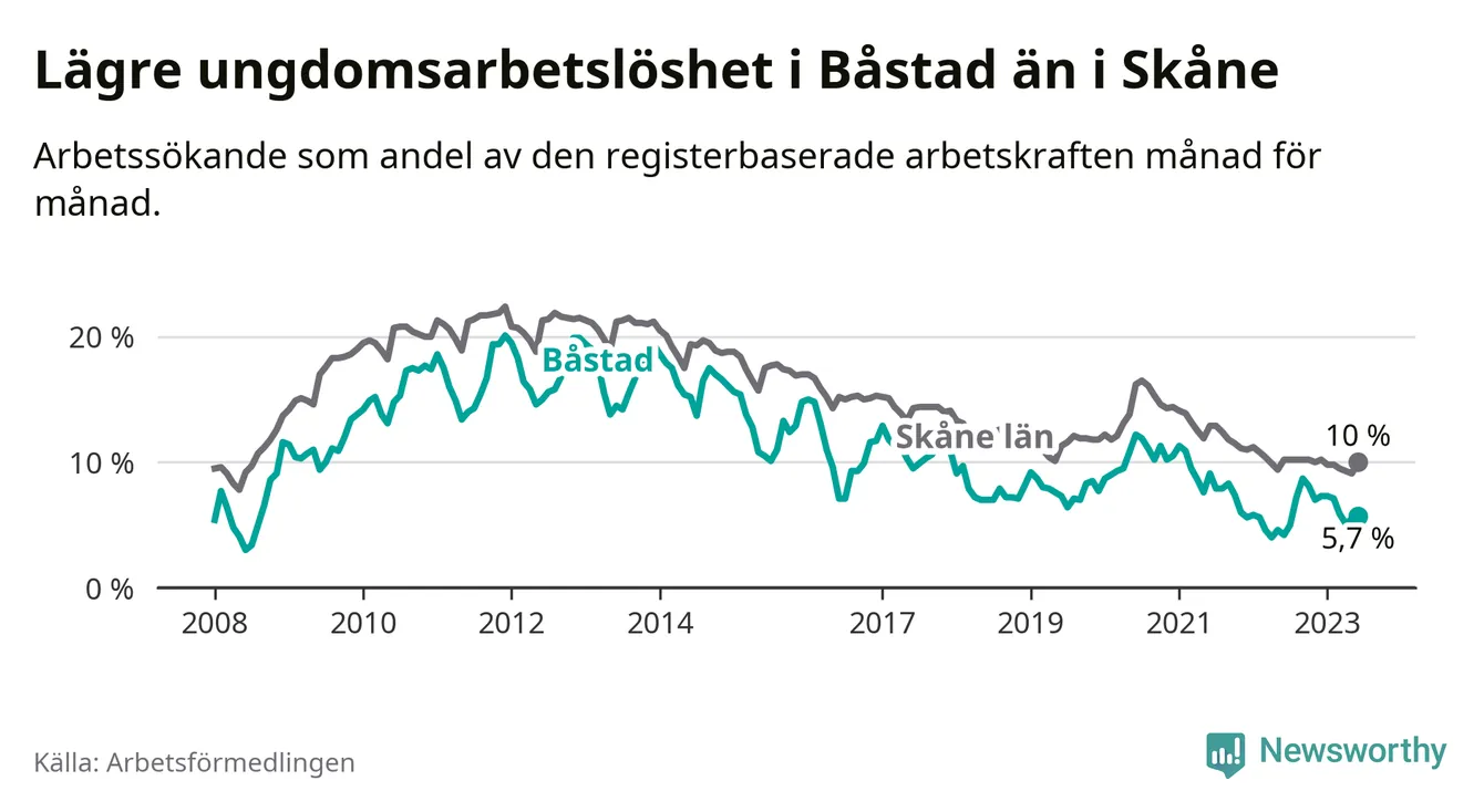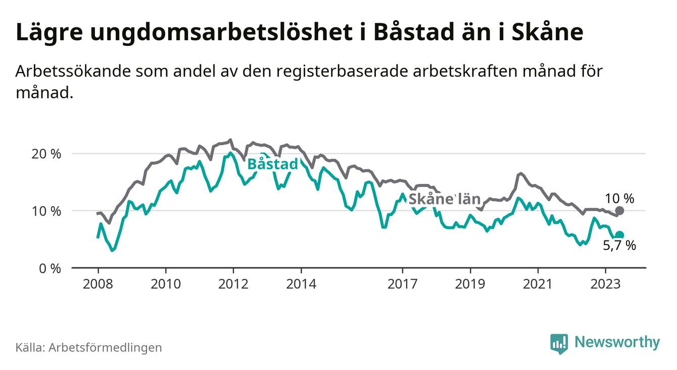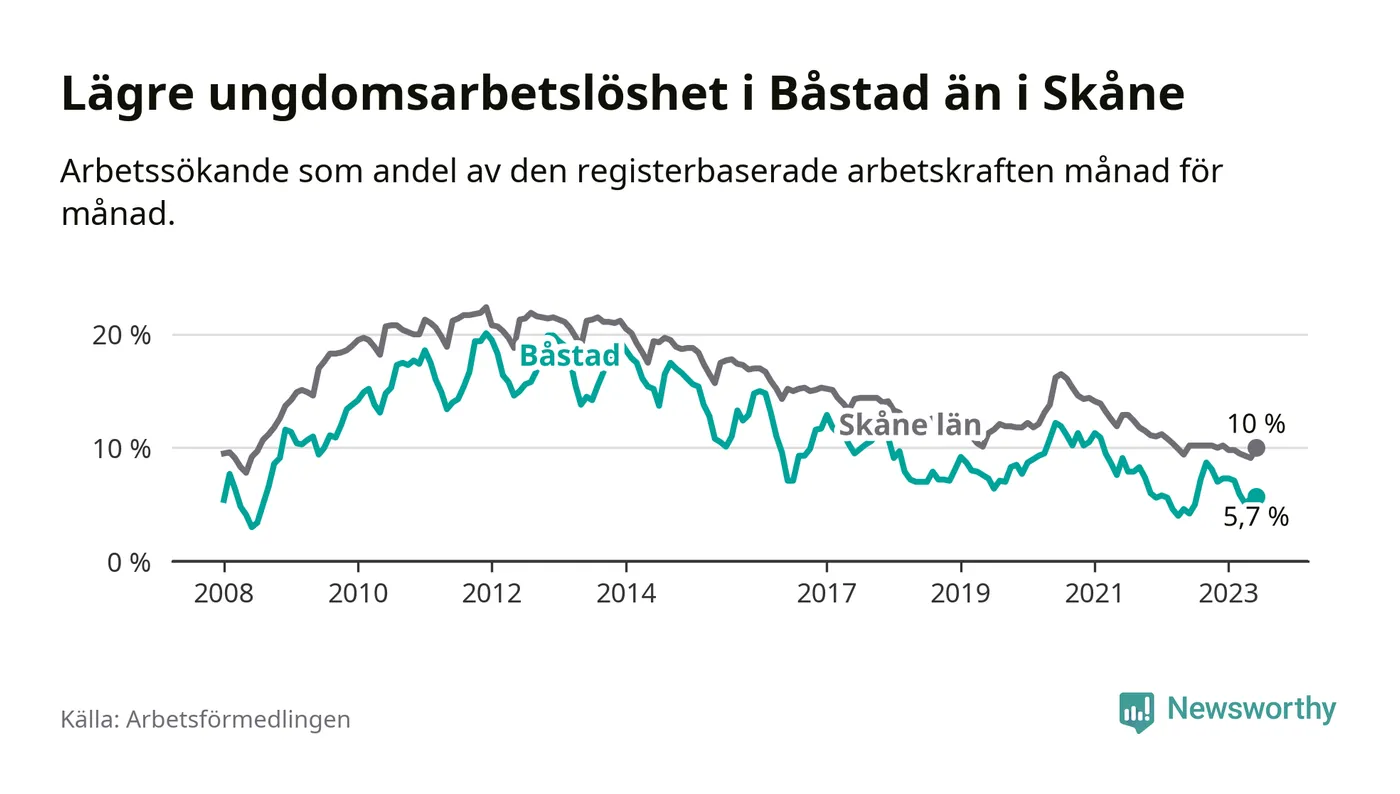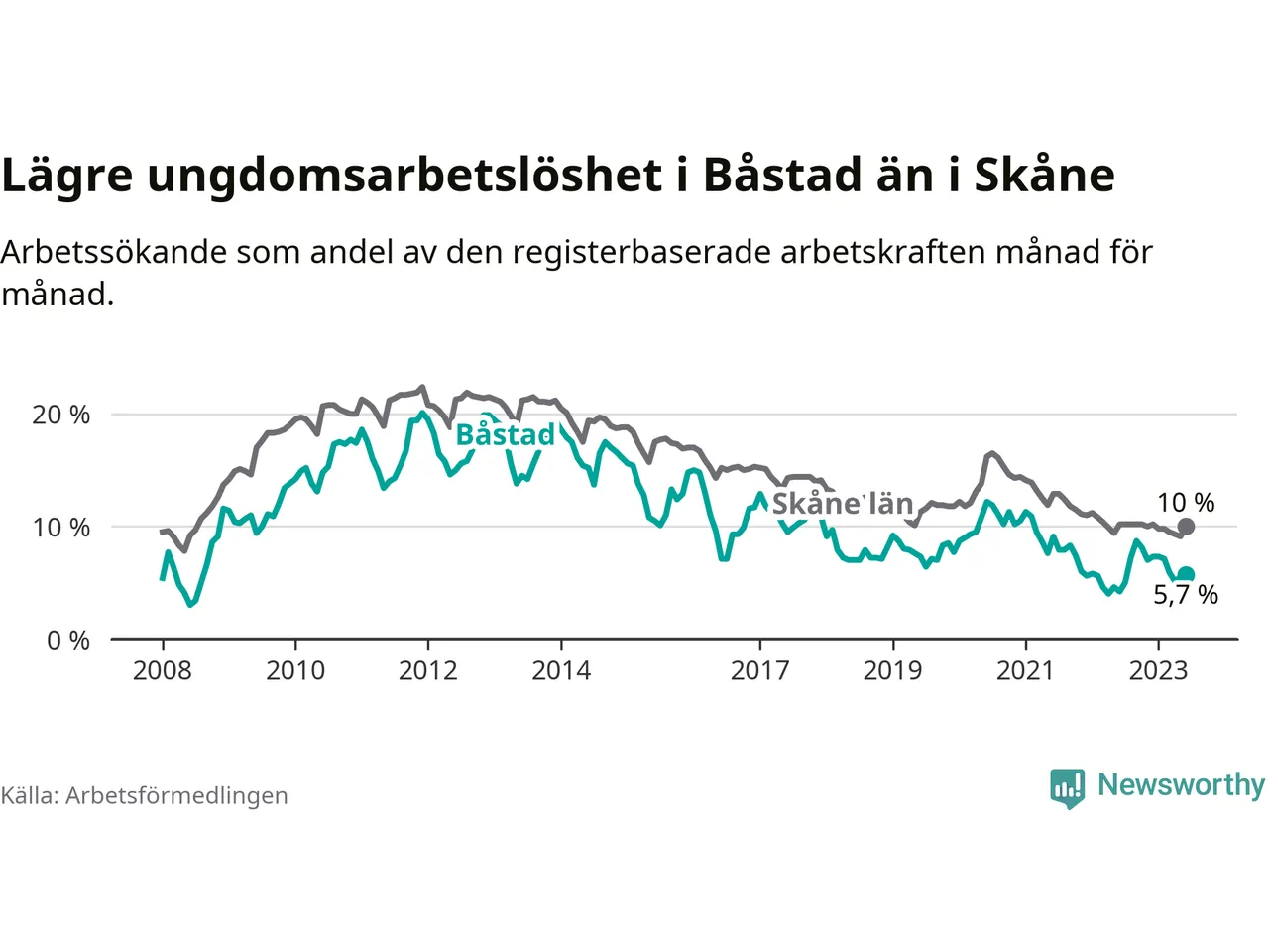 Precis som den totala arbetslösheten ligger ungdomsarbetslösheten i Båstad lägre än i Skåne som helhet. Skillnaden mellan kommunen och länet är 4,3 procentenheter.