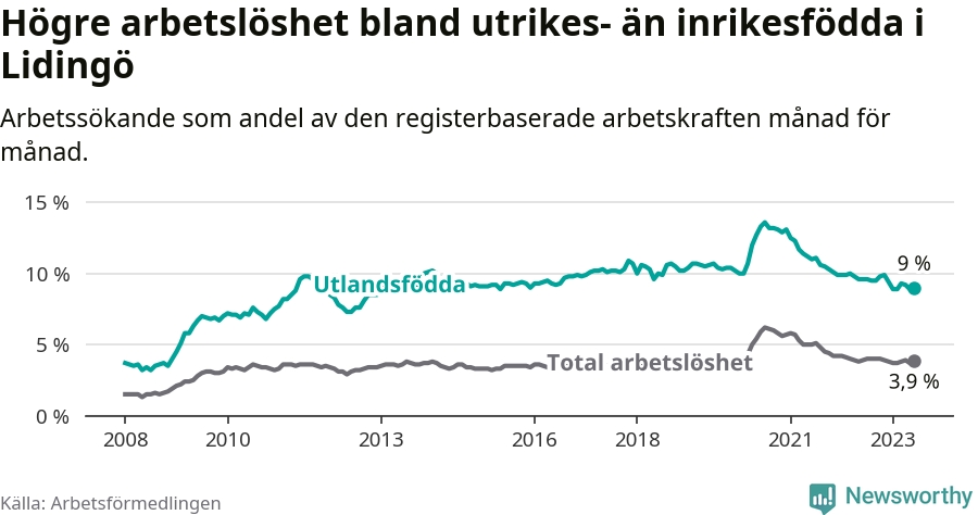 Arbetslösheten bland utlandsfödda var 9,0 procent på Lidingö under juni månad, motsvarande 443 av 4 922 personer. Det är 0,6 procentenheter färre än vid samma tidpunkt i fjol (−14 om man räknar personer). Därmed har de utlandsföddas arbetslöshet varit lägre än vid samma tidpunkt i fjol i över två år i sträck. Sedan mars 2021 har arbetslösheten bland utlandsfödda minskat från 11,7 till 9,0 procent.