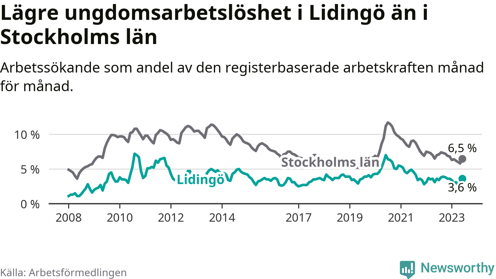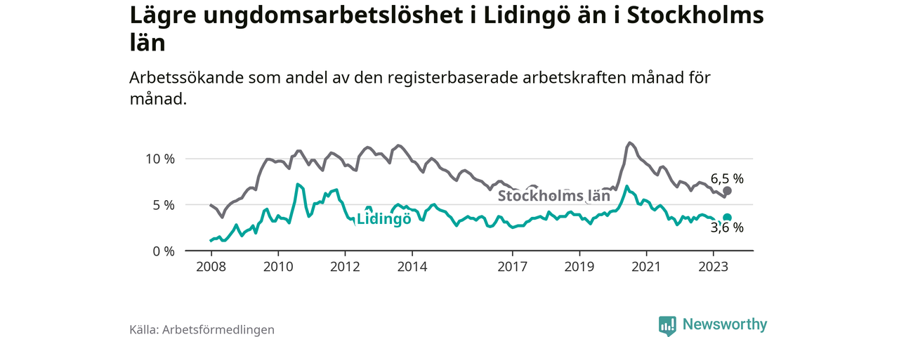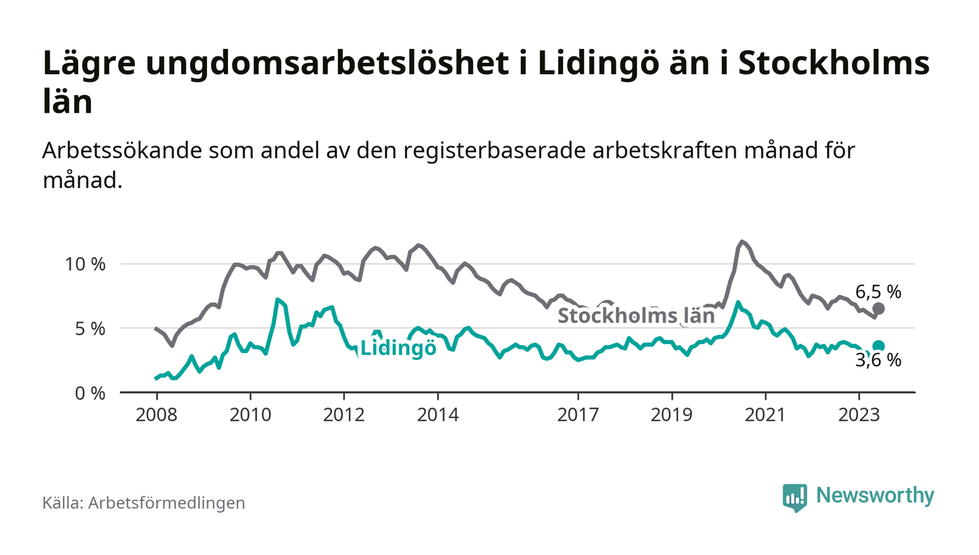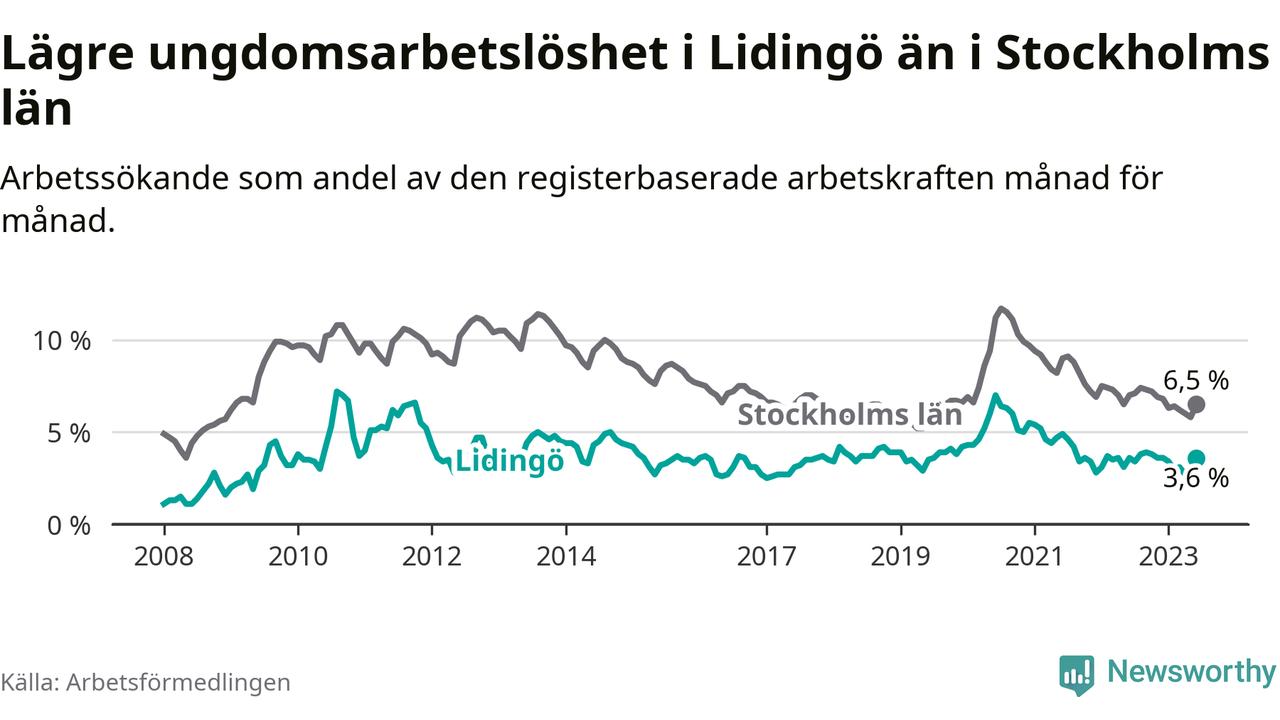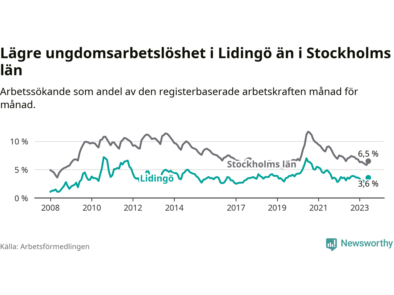 Precis som den totala arbetslösheten ligger ungdomsarbetslösheten på Lidingö lägre än i Stockholms län som helhet. Skillnaden mellan kommunen och länet är 2,9 procentenheter.