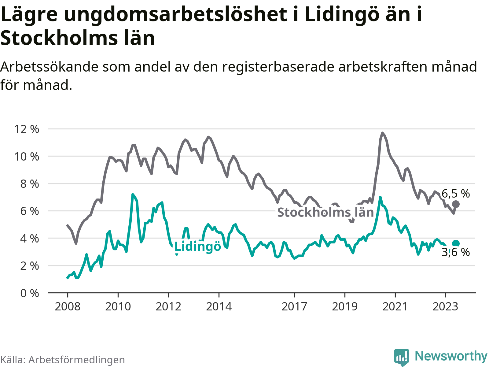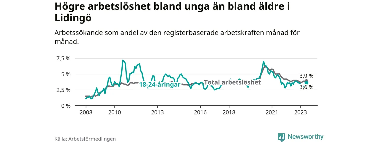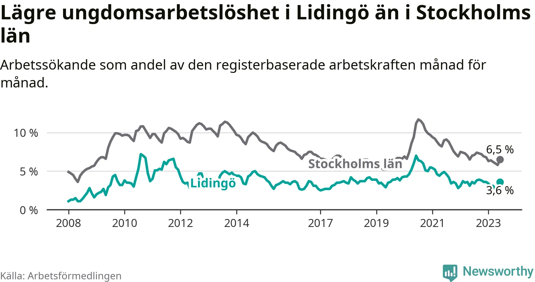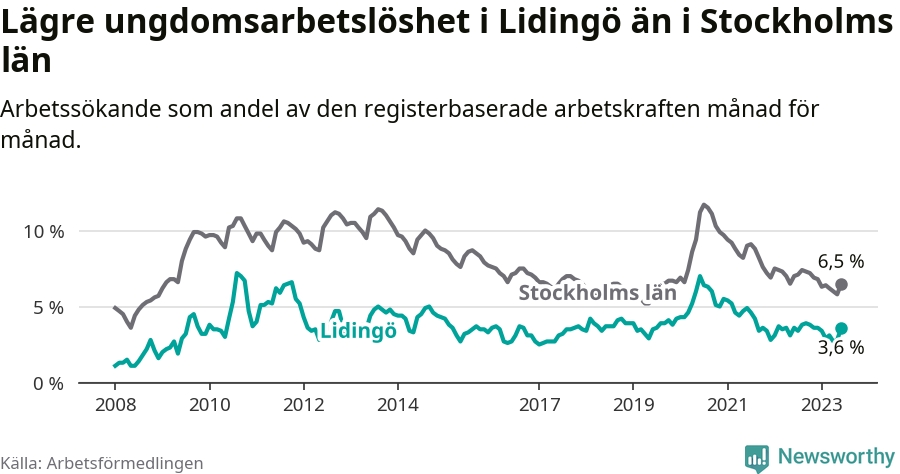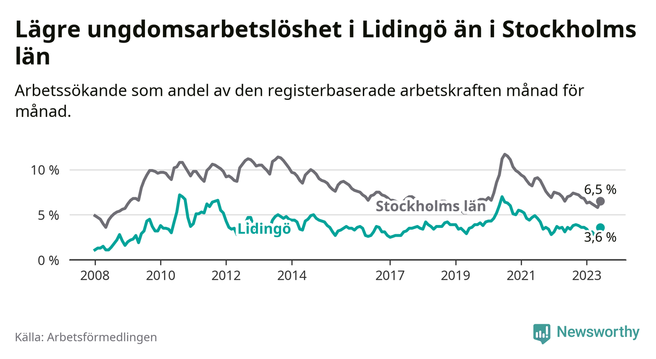 Precis som den totala arbetslösheten ligger ungdomsarbetslösheten på Lidingö lägre än i Stockholms län som helhet. Skillnaden mellan kommunen och länet är 2,9 procentenheter.