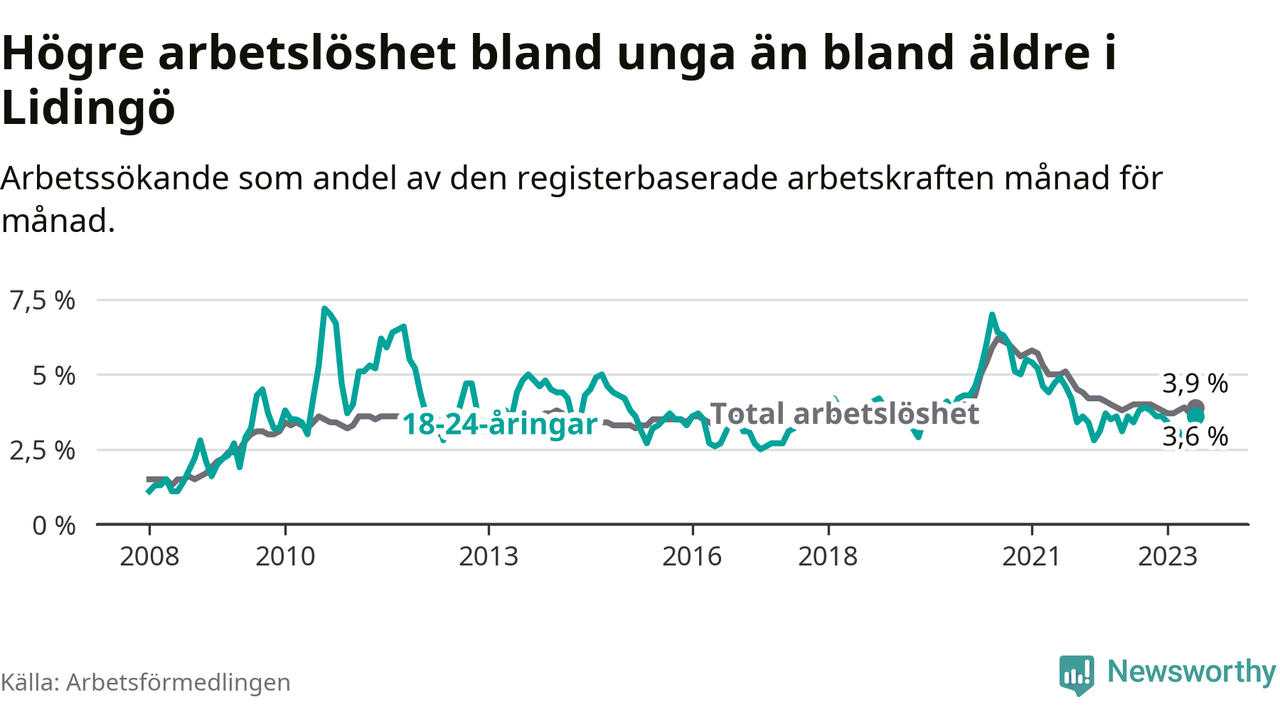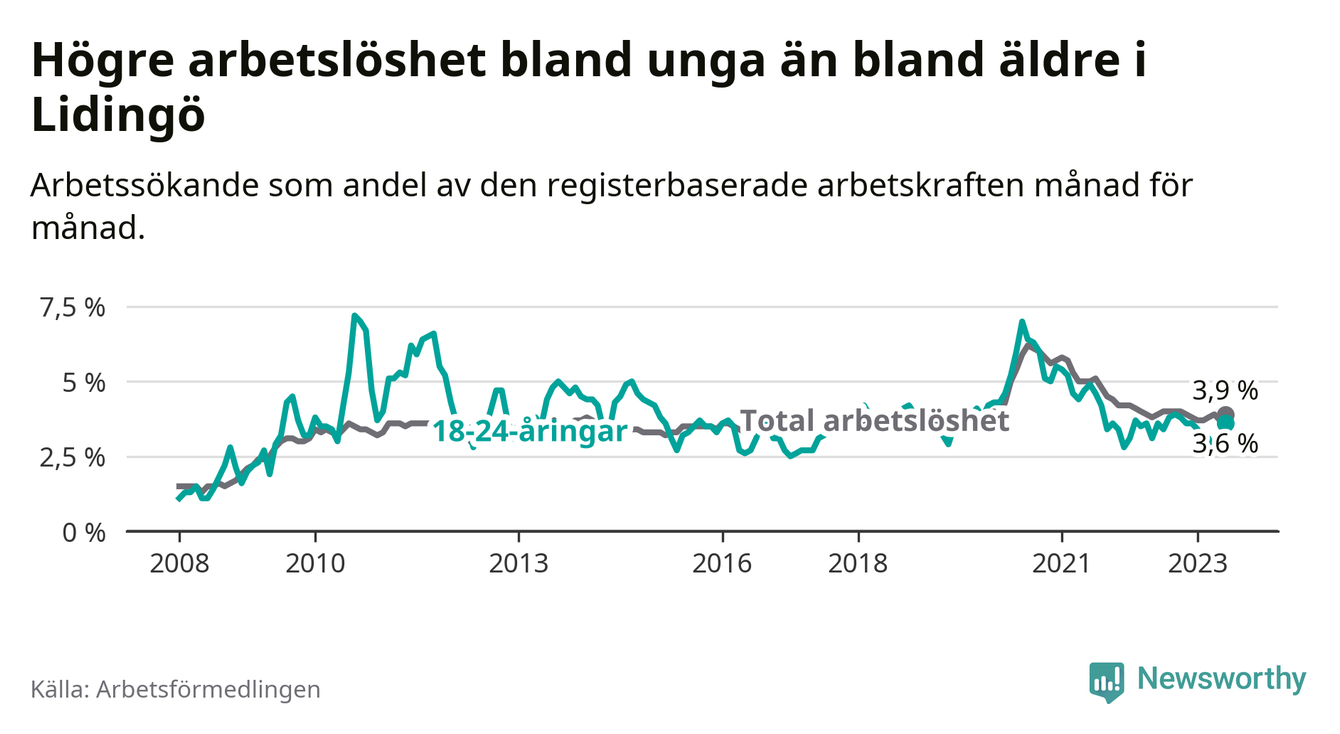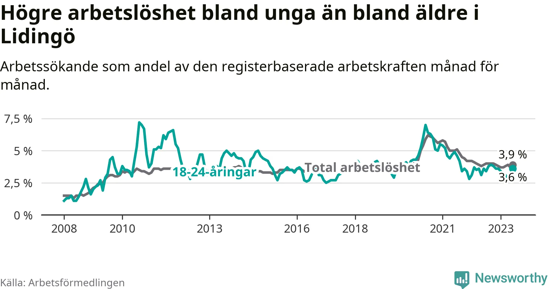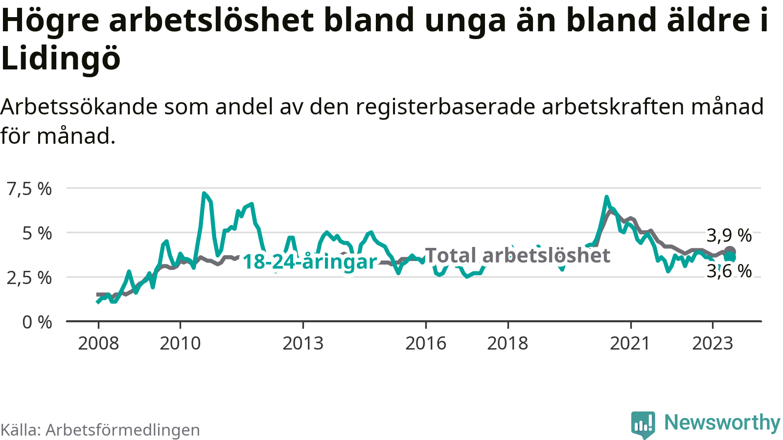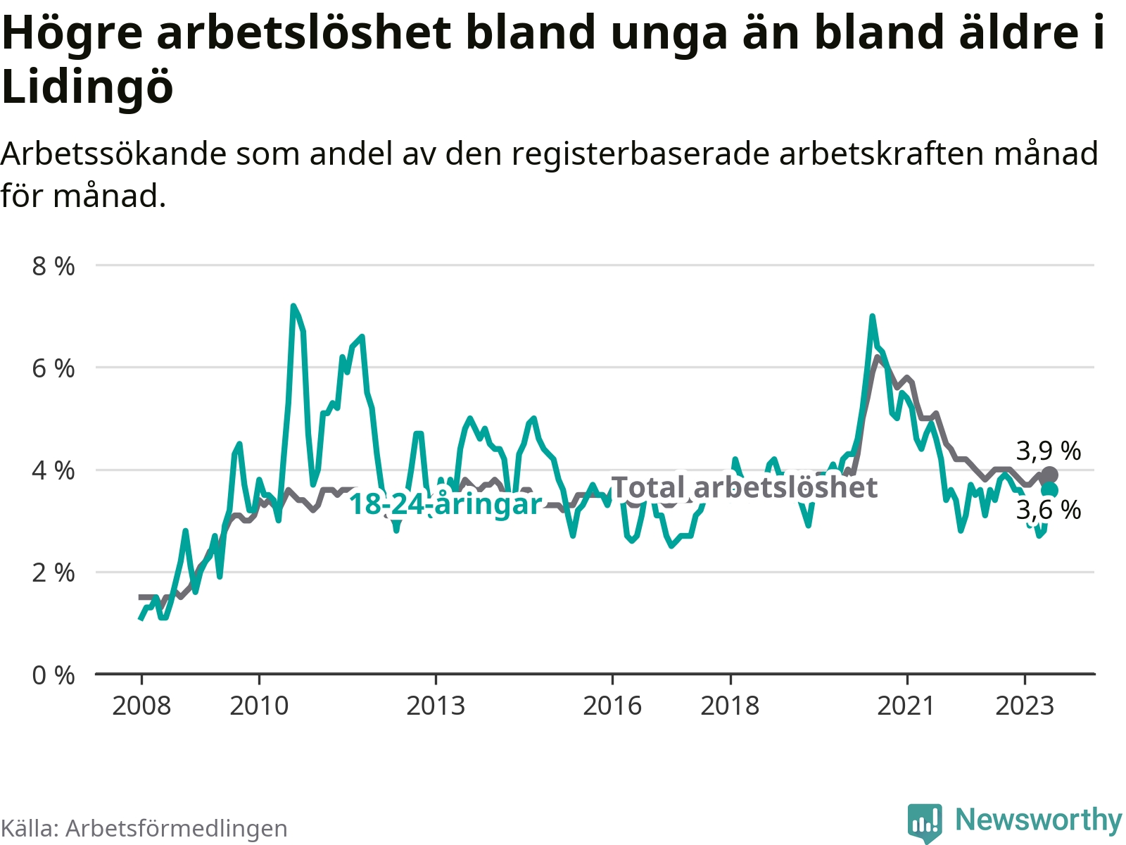 Precis som den totala arbetslösheten ligger ungdomsarbetslösheten på Lidingö lägre än i Stockholms län som helhet. Skillnaden mellan kommunen och länet är 2,9 procentenheter.