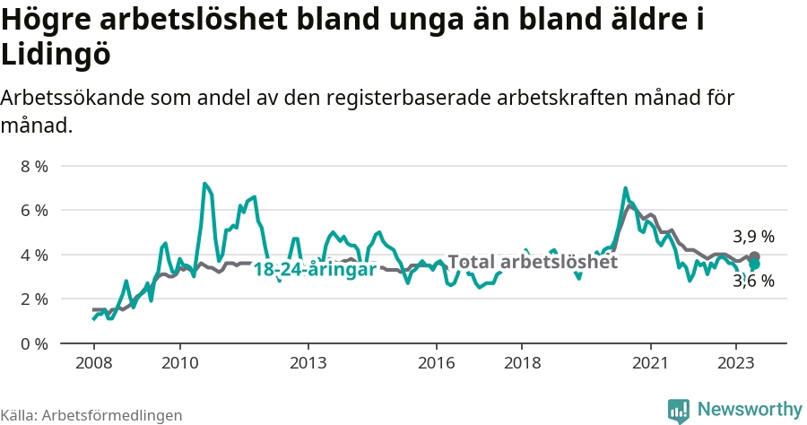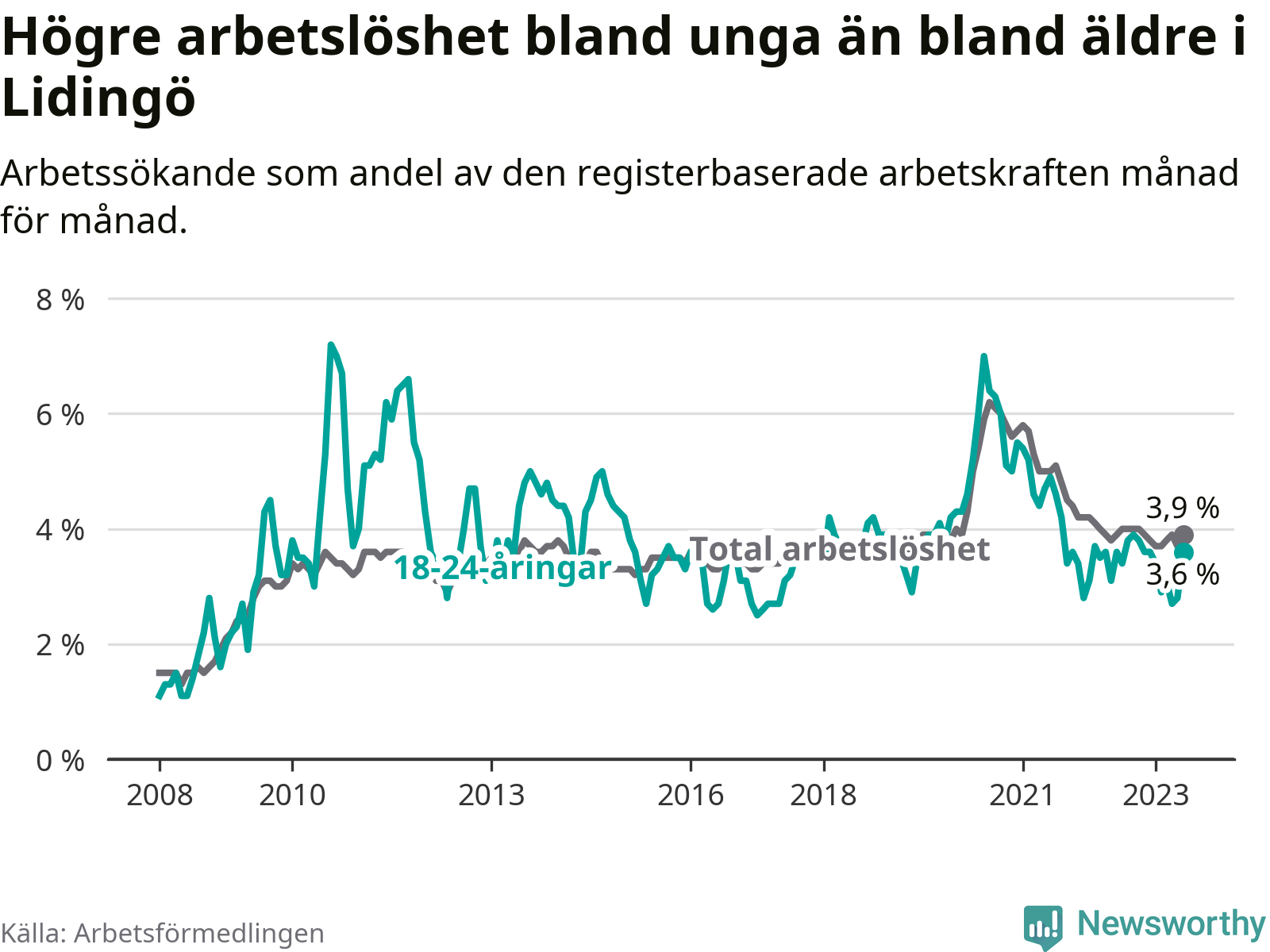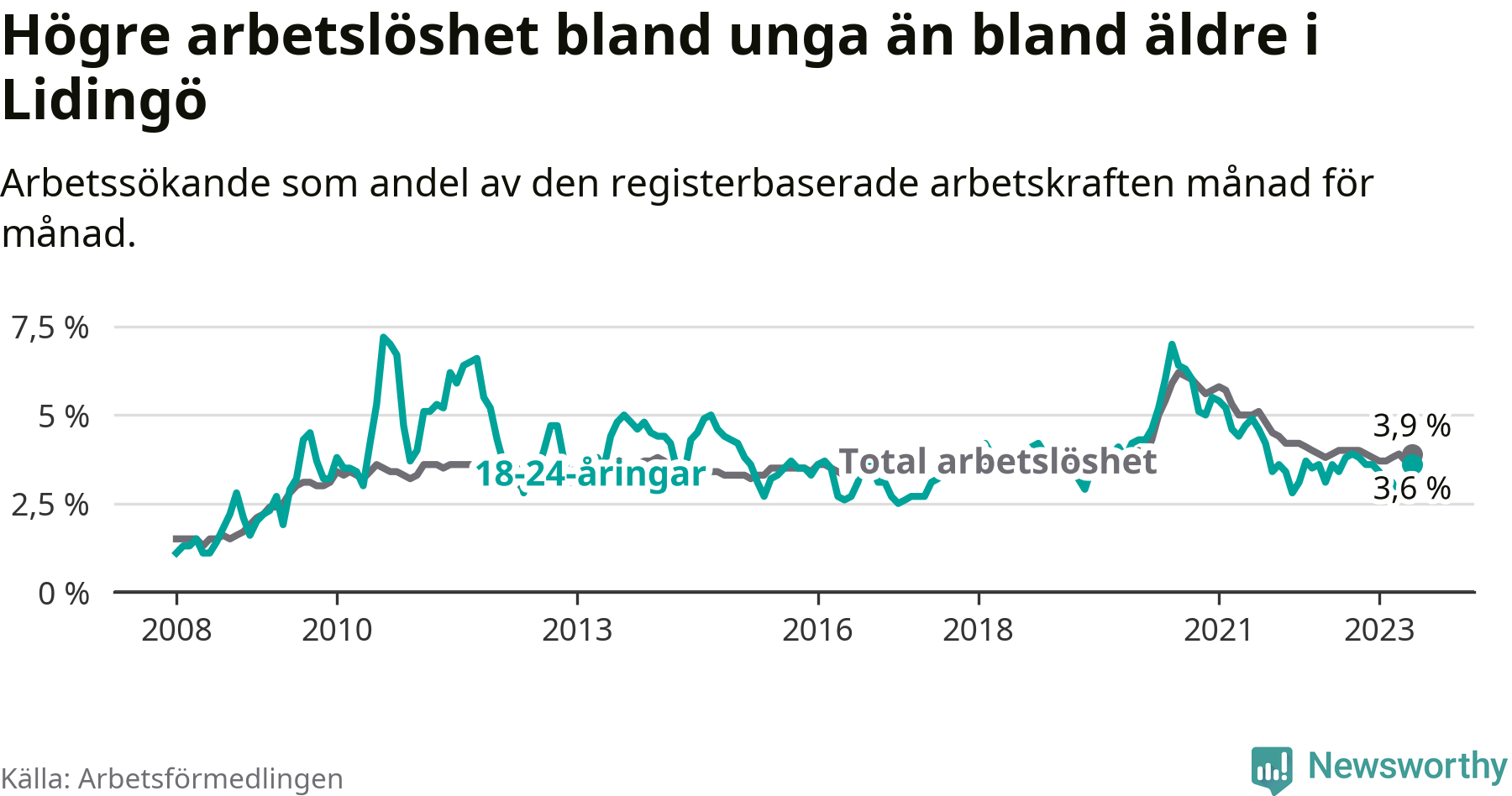 Precis som den totala arbetslösheten står arbetslösheten bland unga stilla. I juni var 3,6 procent av 18–24-åringarna inskrivna som arbetssökande (motsvarande 68 personer).
