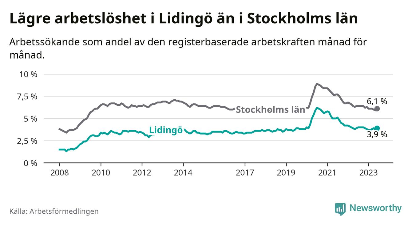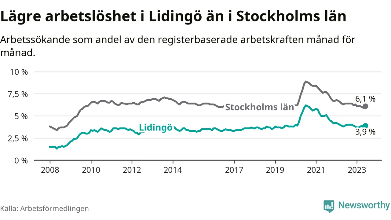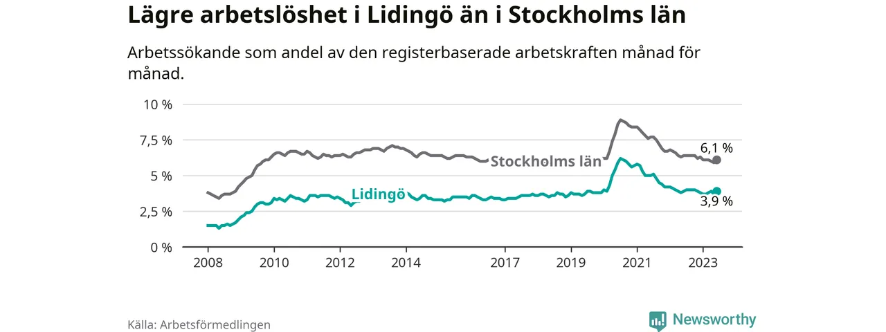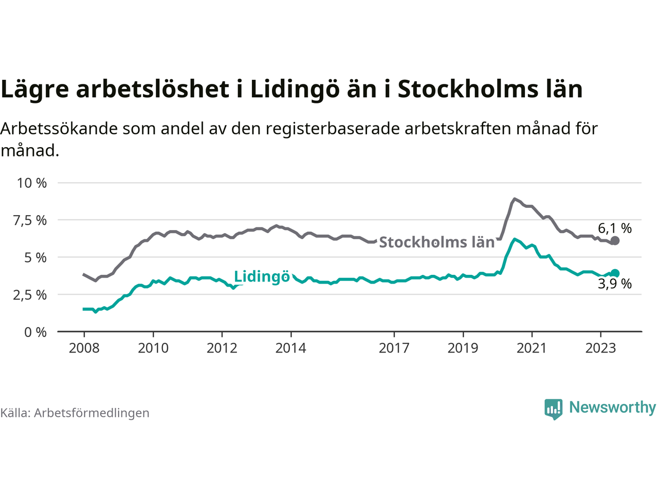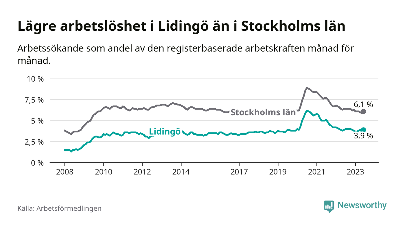 Lidingö går därmed mot strömmen i förhållande till andra kommuner i Stockholms län. I de flesta andra kommuner i länet går arbetslösheten nedåt. Störst är minskningen i Södertälje, där arbetslösheten sjunker med 1,2 procentenheter. I tabellen längre ner ser du utvecklingen i samtliga kommuner i länet.