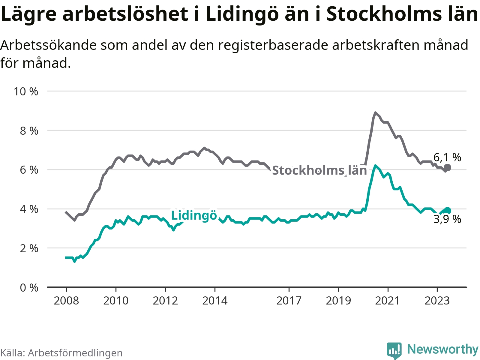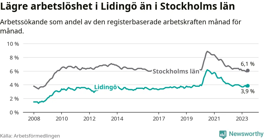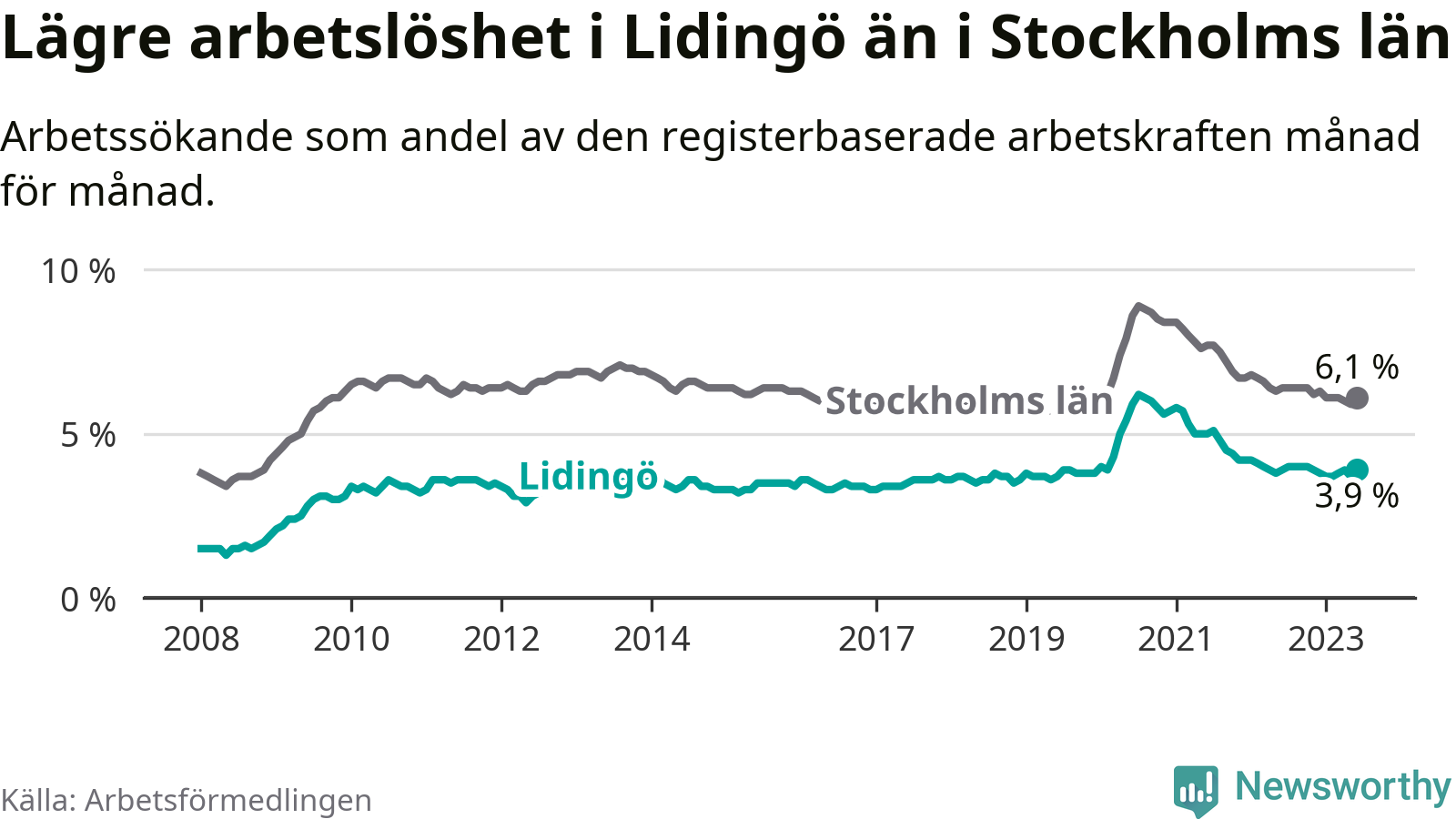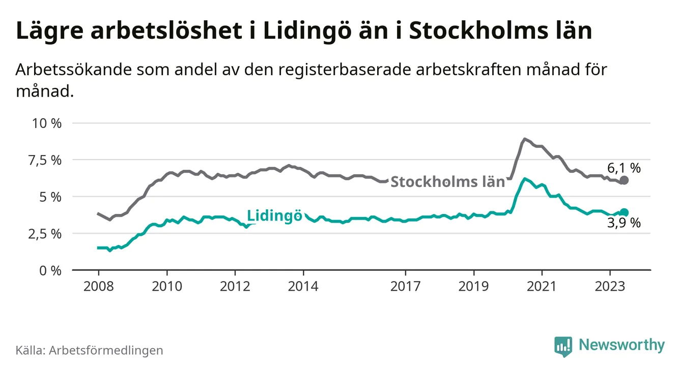 Lidingö går därmed mot strömmen i förhållande till andra kommuner i Stockholms län. I de flesta andra kommuner i länet går arbetslösheten nedåt. Störst är minskningen i Södertälje, där arbetslösheten sjunker med 1,2 procentenheter. I tabellen längre ner ser du utvecklingen i samtliga kommuner i länet.